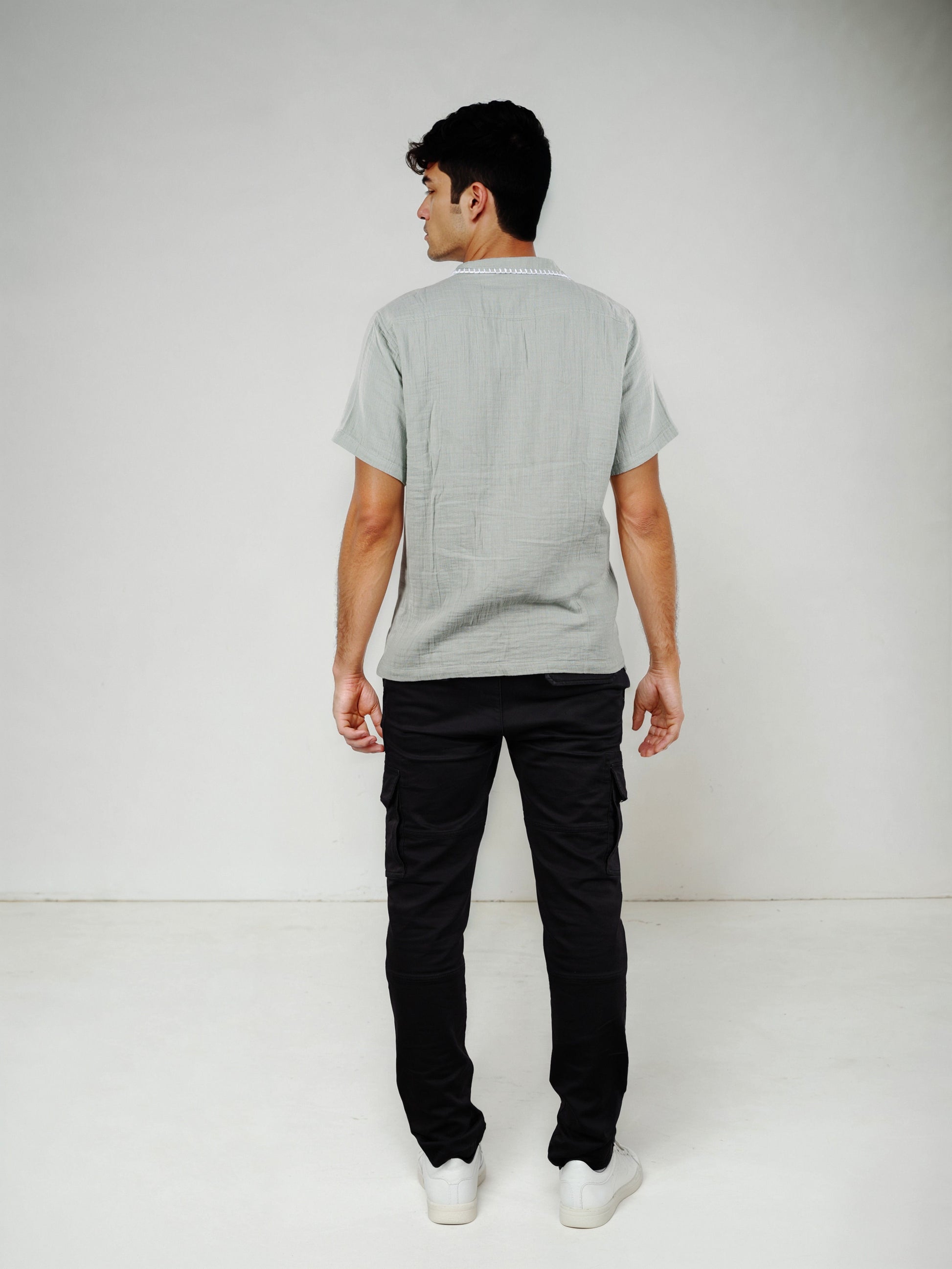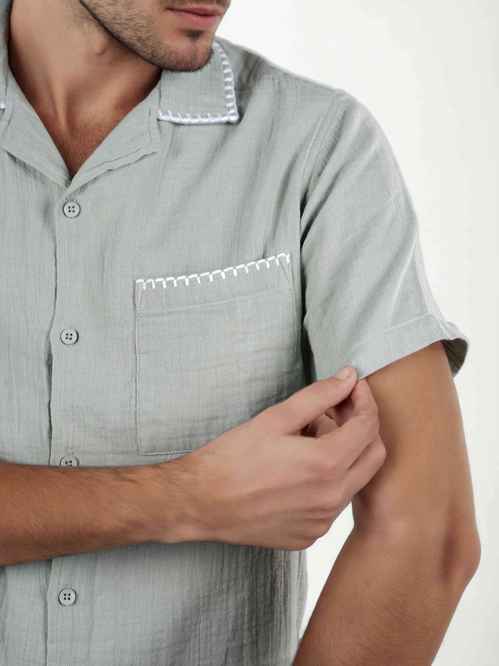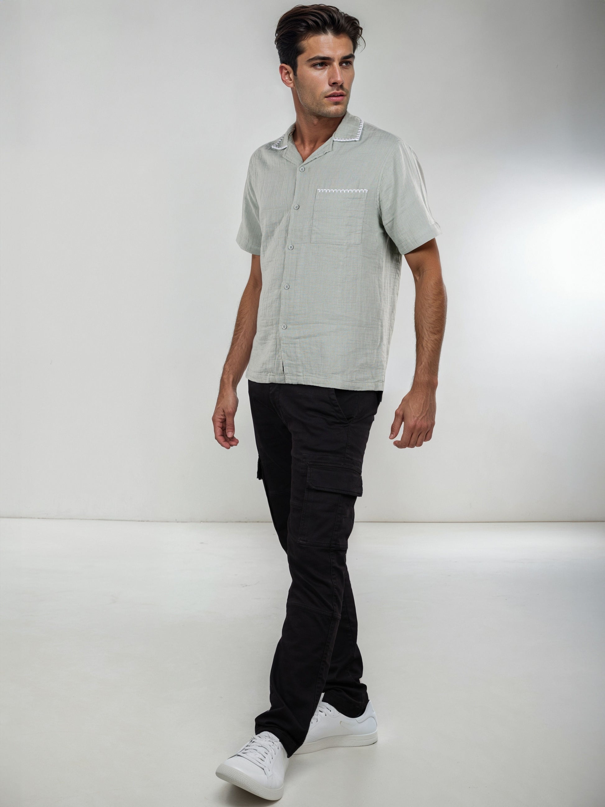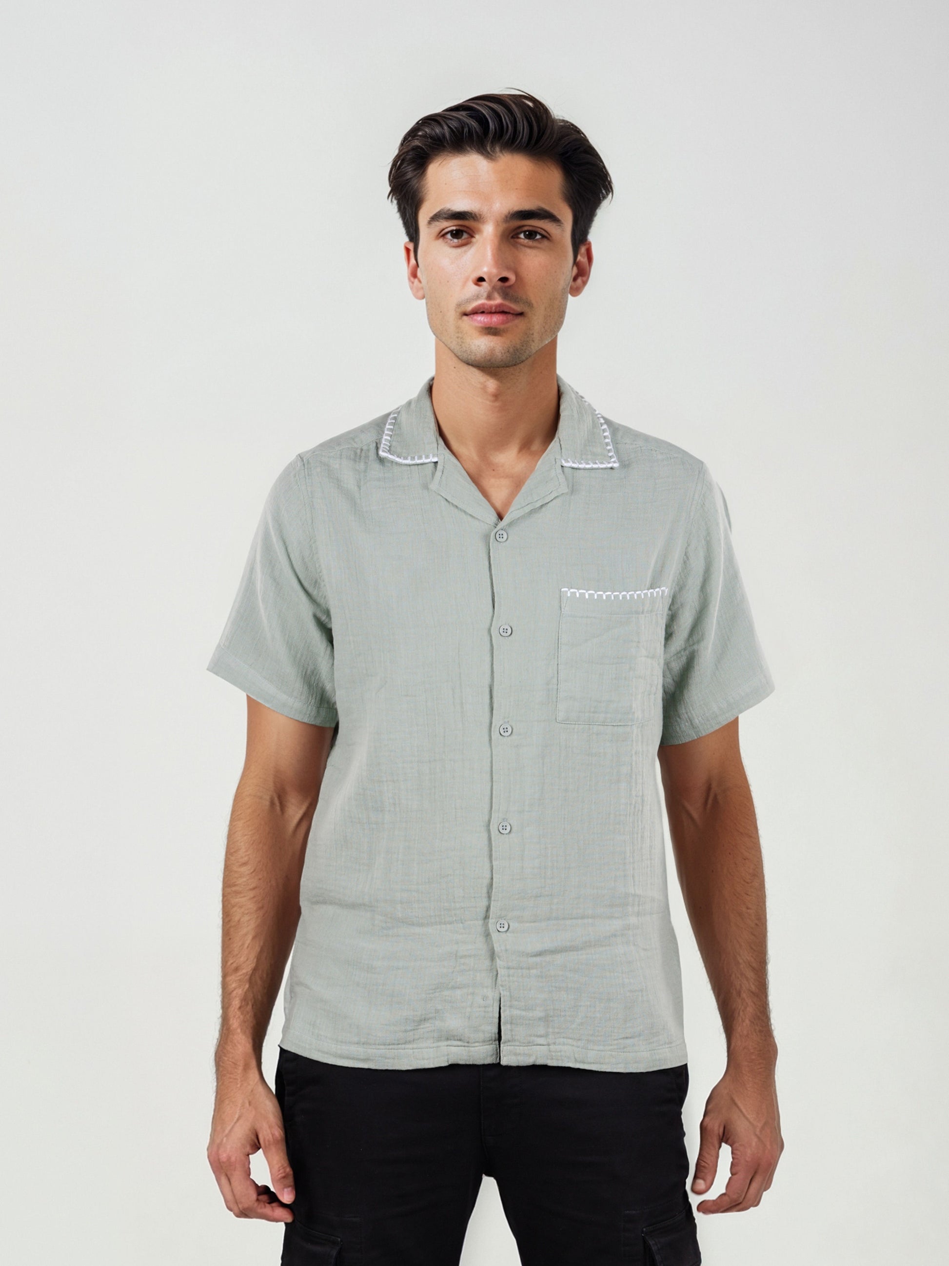 Discover the Celio Men Green Solid Cotton Double Cloth Shirt. Crafted for casual outings, this short-sleeve shirt combines comfort and style effortlessly. Disclaimer: All other items in the image are only for display purposes and will not be a part of the delivery content. Product colour may slightly vary due to photographic lighting sources. Country of Origin - India.
