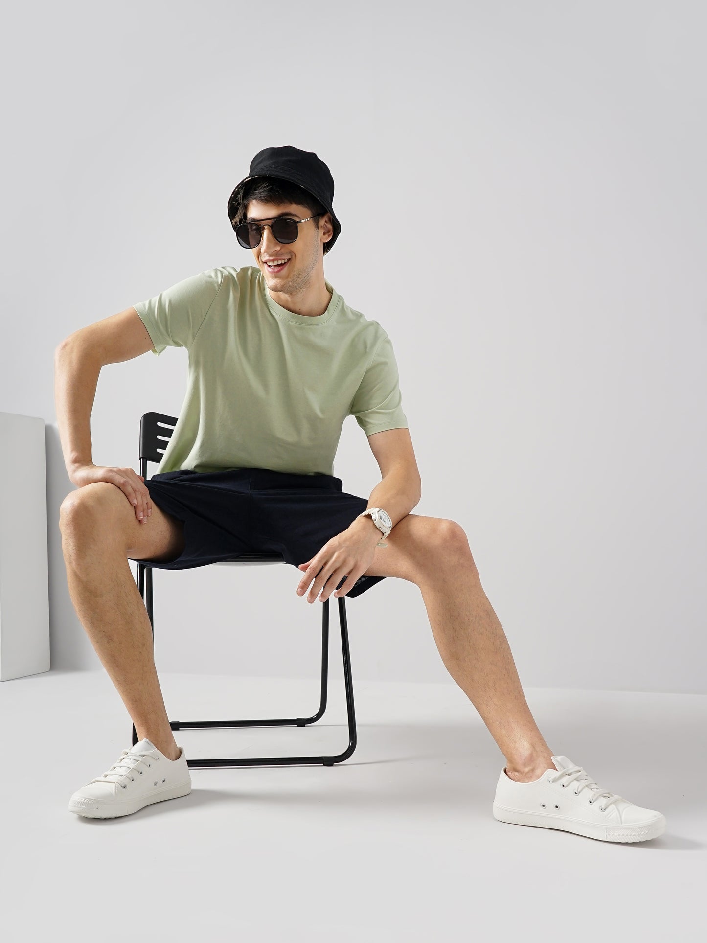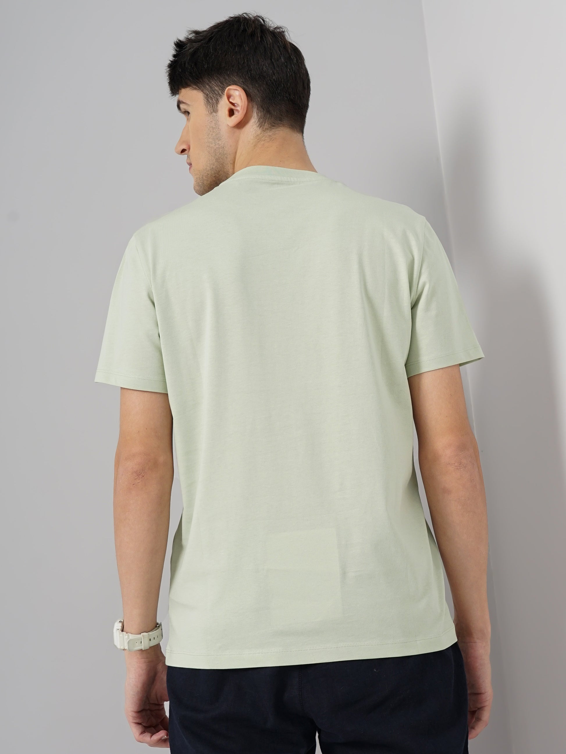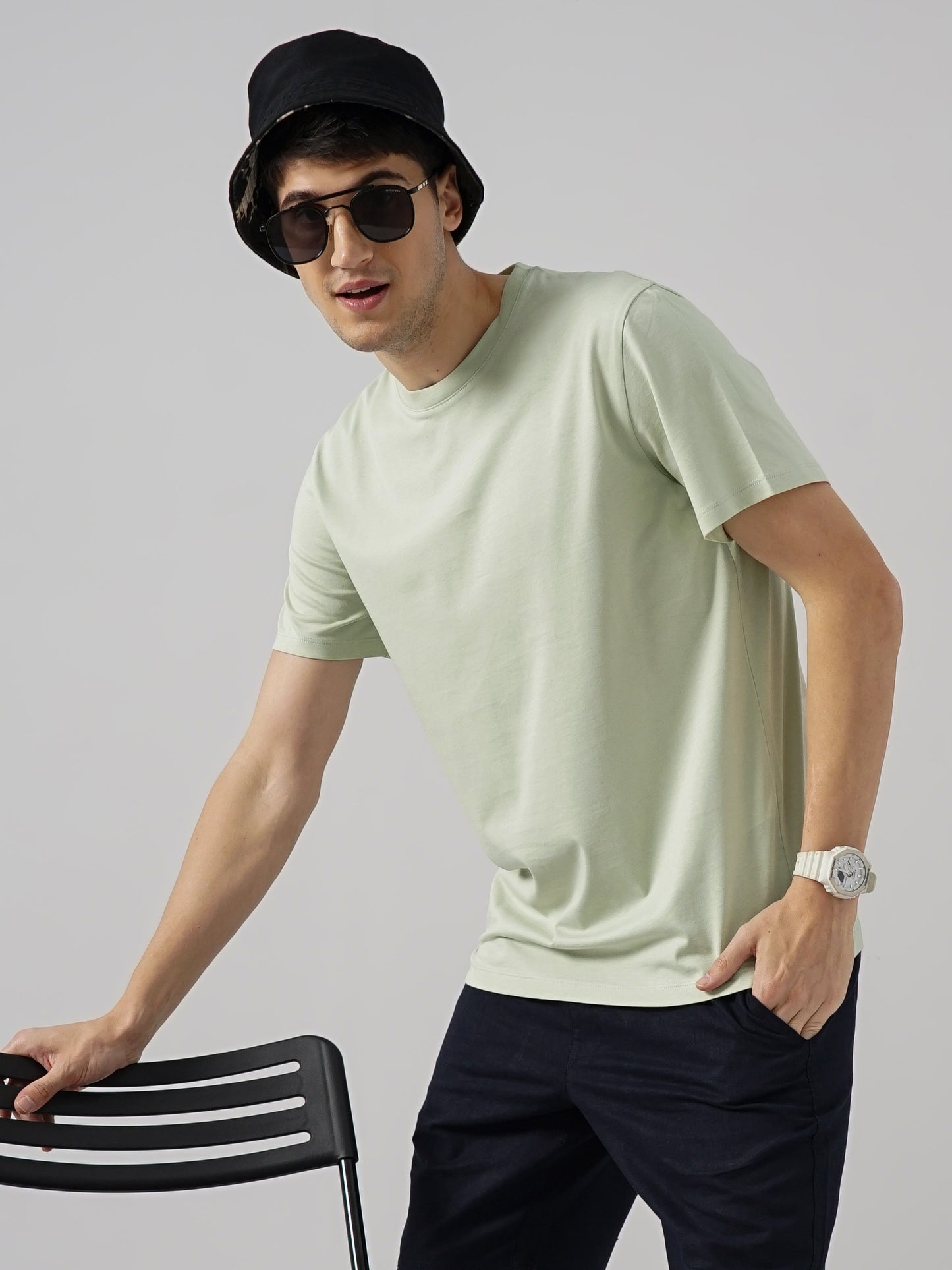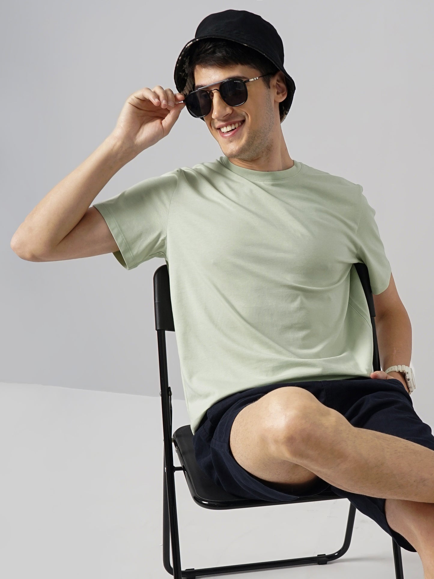 Discover style and comfort with Celio's solid green cotton T-shirt for men. Perfect for casual outings, it features a regular fit and short sleeves. Disclaimer: All other items in the image are only for display purposes and will not be a part of the delivery content. Product colour may slightly vary due to photographic lighting sources. Country of Origin - India.