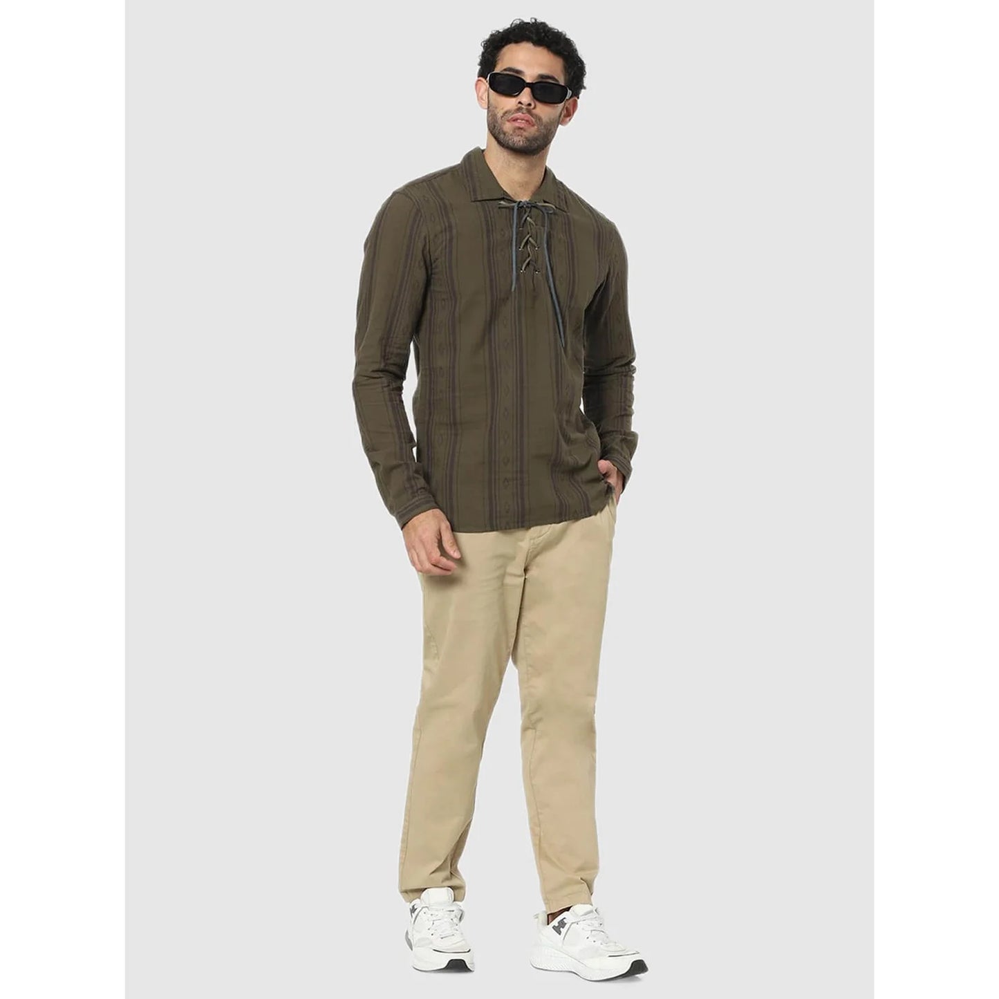 Upgrade your casual wardrobe with the Celio Olive Vertical-Stripes Regular Fit Shirt. Made from breathable cotton, this long-sleeve green shirt is perfect for men. Disclaimer: All other items in the image are only for display purposes and will not be a part of the delivery content. Product colour may slightly vary due to photographic lighting sources. Country of Origin - India.
