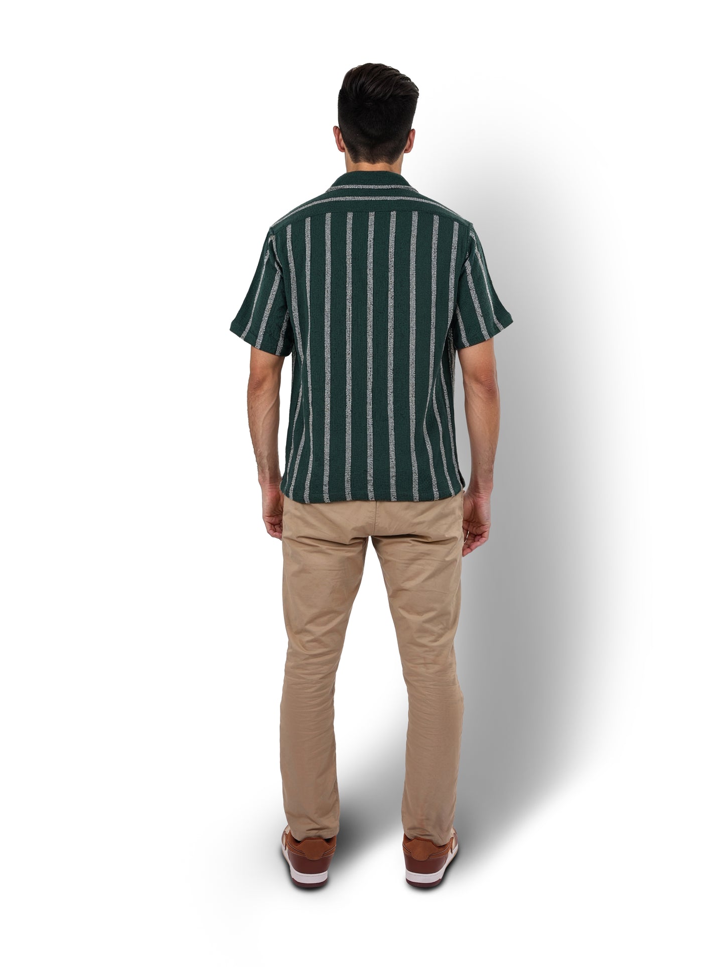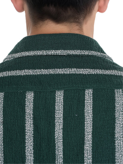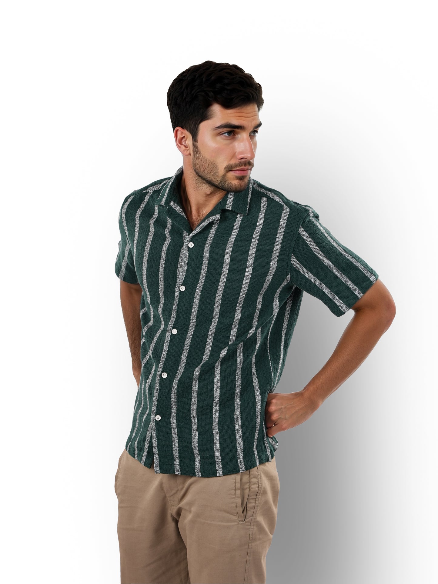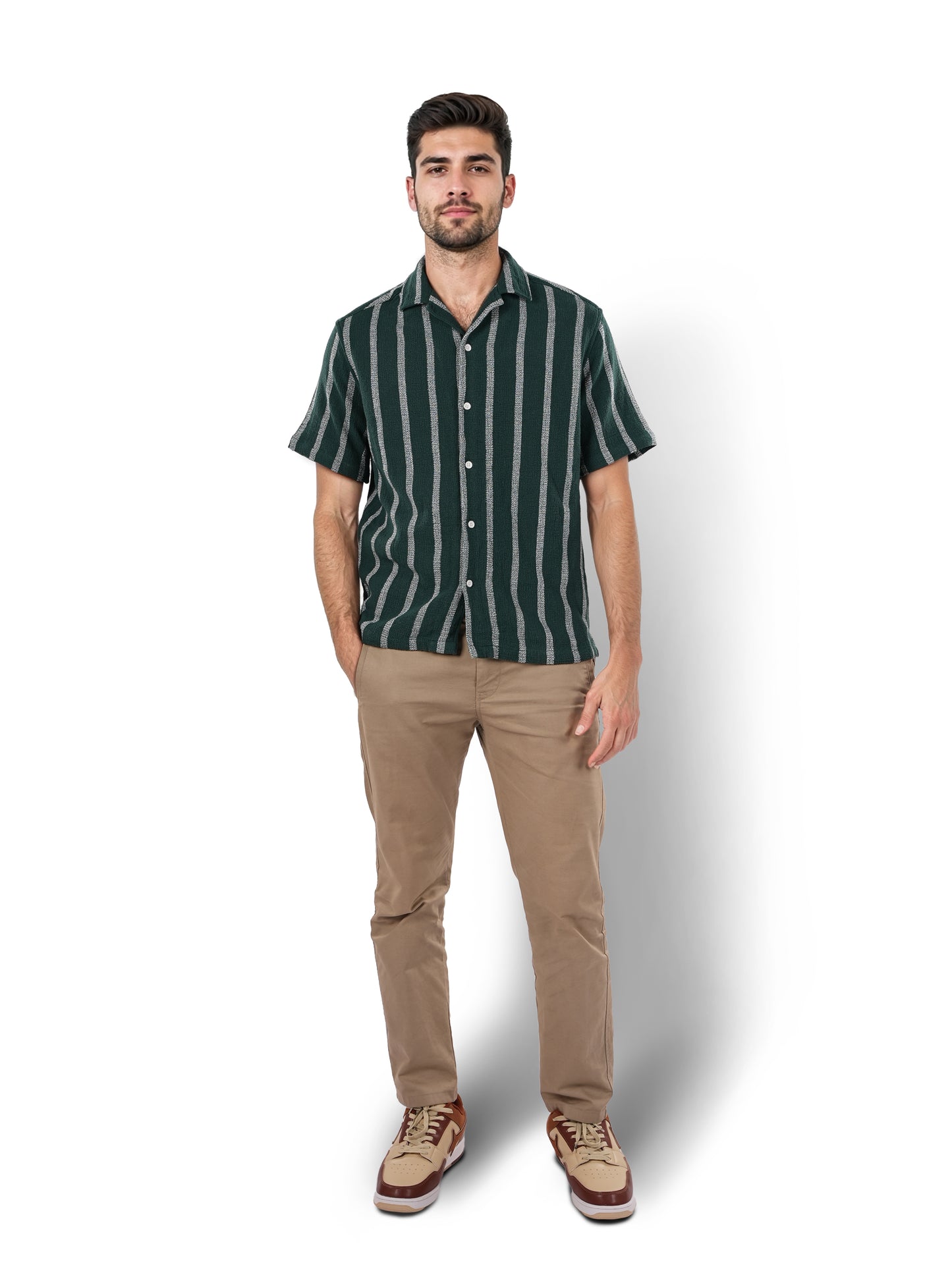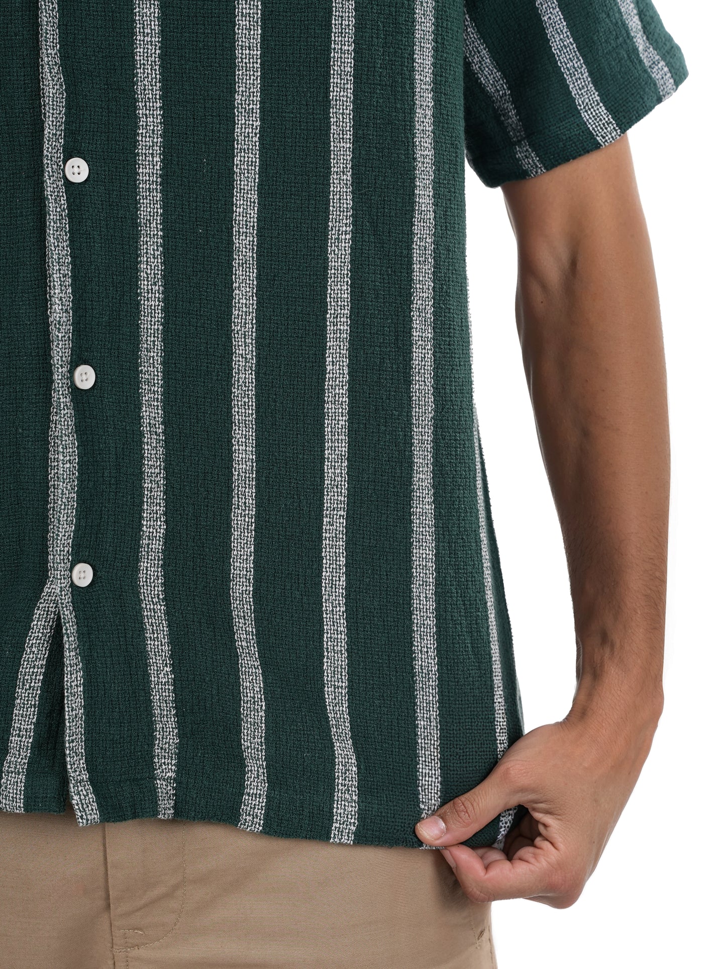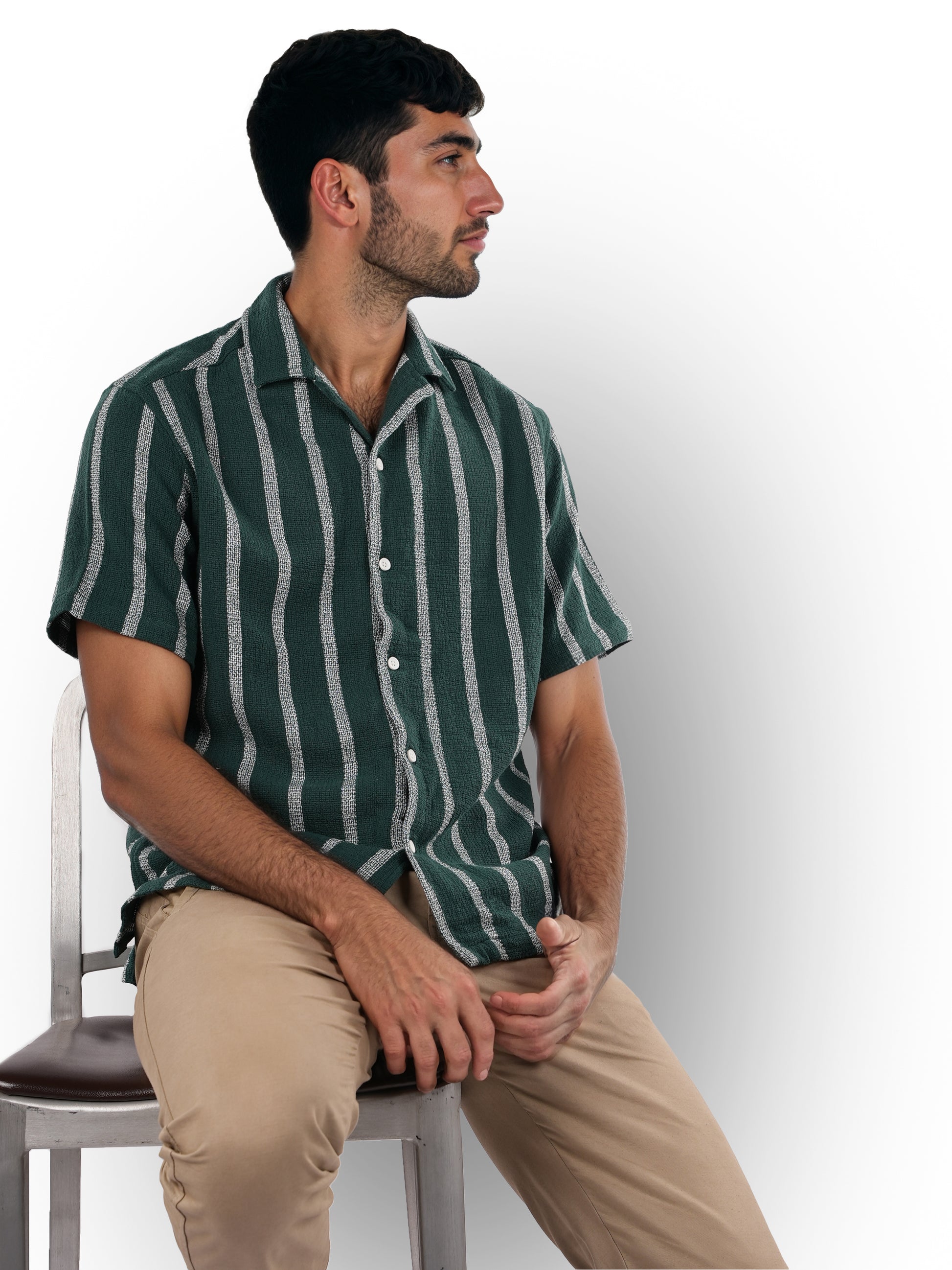 Explore comfort and style with the Celio Men's Green Spread Collar Striped Shirt. Crafted from soft cotton, this casual short sleeve shirt is perfect for everyday wear. Disclaimer: All other items in the image are only for display purposes and will not be a part of the delivery content. Product colour may slightly vary due to photographic lighting sources. Country of Origin - India.
