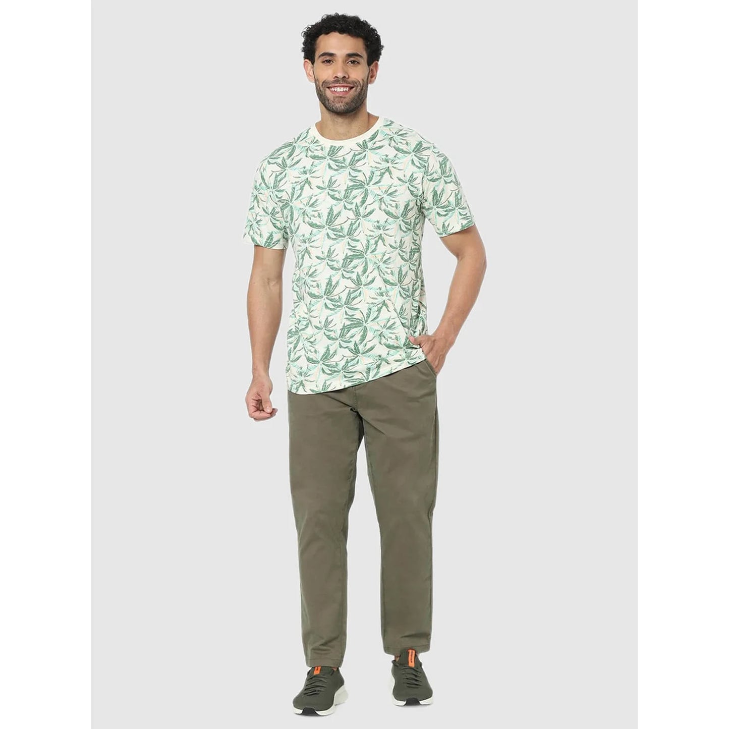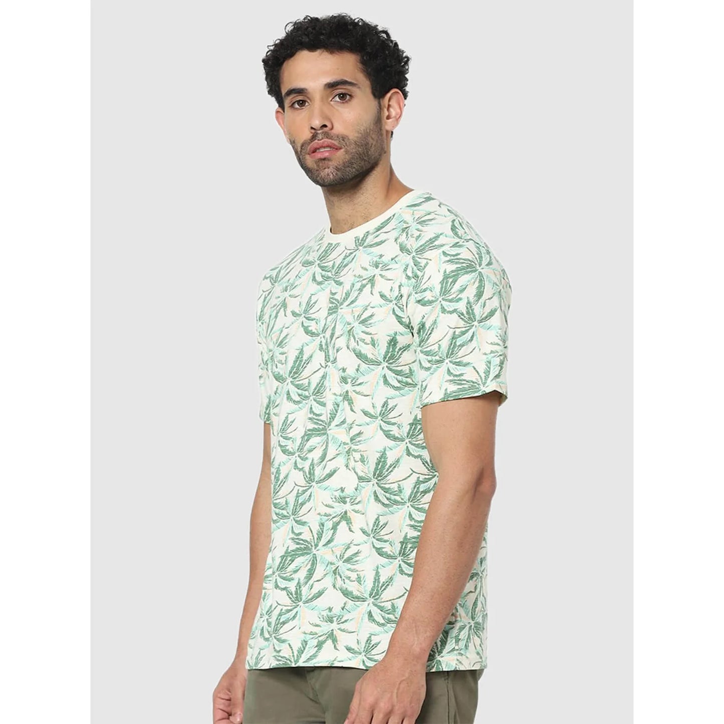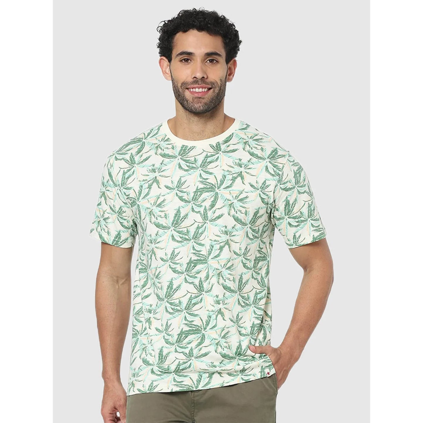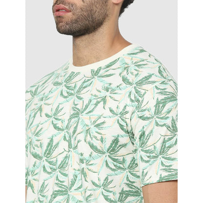 Elevate your casual wardrobe with the Celio White Tropical Regular Fit T-Shirt. Crafted from soft cotton, this green tee features short sleeves, perfect for warm days. Disclaimer: All other items in the image are only for display purposes and will not be a part of the delivery content. Product colour may slightly vary due to photographic lighting sources. Country of Origin - India.