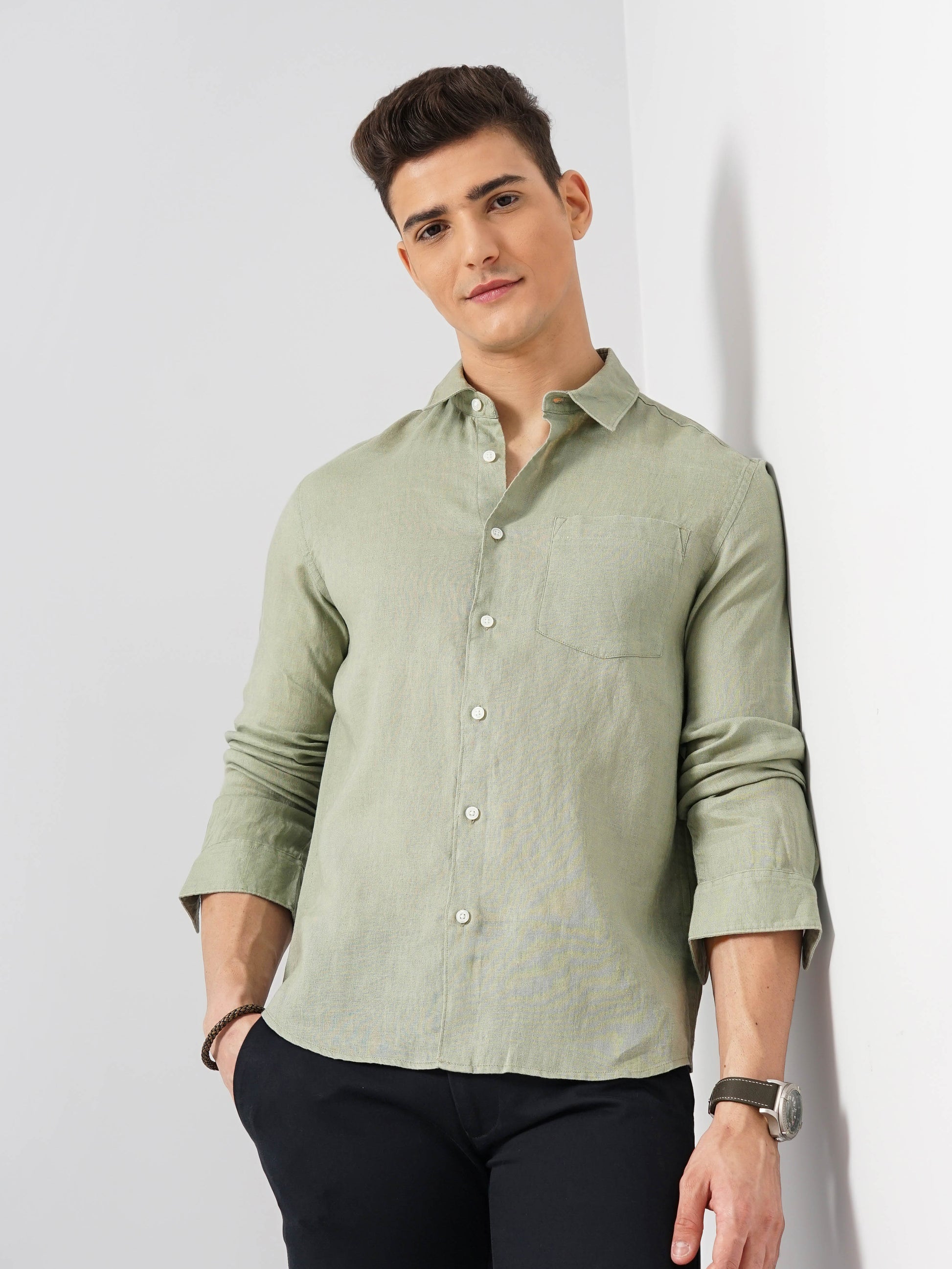 Elevate your casual wardrobe with the Celio Men Green Linen Shirt. Featuring a spread collar and long sleeves, this regular fit shirt combines comfort and style effortlessly. Disclaimer: All other items in the image are only for display purposes and will not be a part of the delivery content. Product colour may slightly vary due to photographic lighting sources. Country of Origin - India.