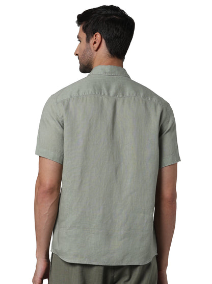 Elevate your casual wardrobe with the Celio Men Green Spread Collar Solid Regular Fit Linen Casual Shirt. Crafted from soft linen, this green short-sleeve shirt is perfect for warm days. Disclaimer: All other items in the image are only for display purposes and will not be a part of the delivery content. Product colour may slightly vary due to photographic lighting sources. Country of Origin - India.