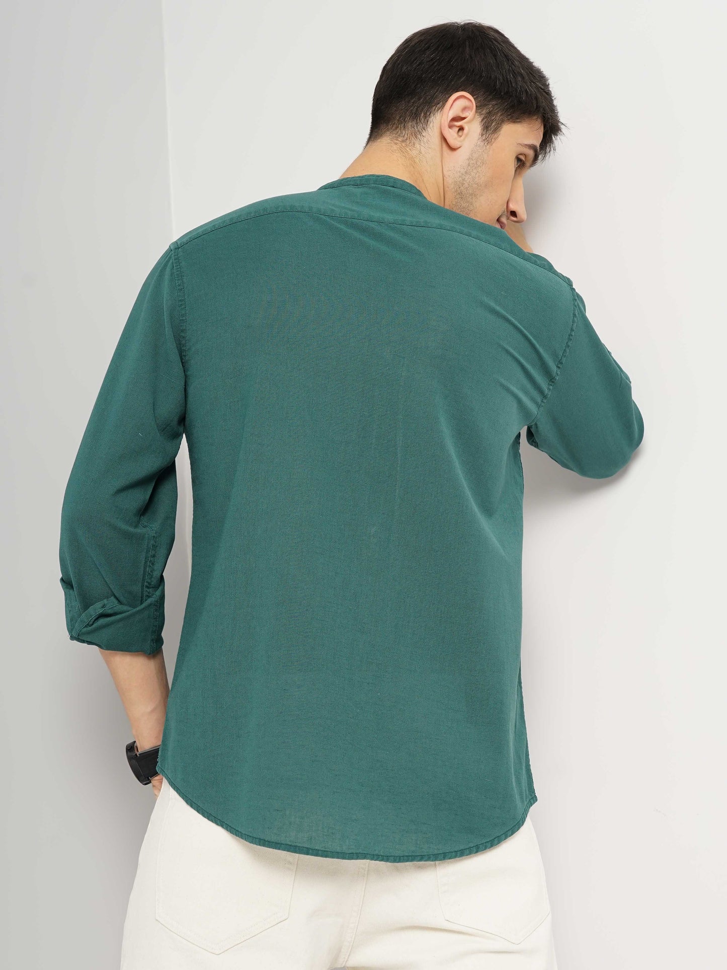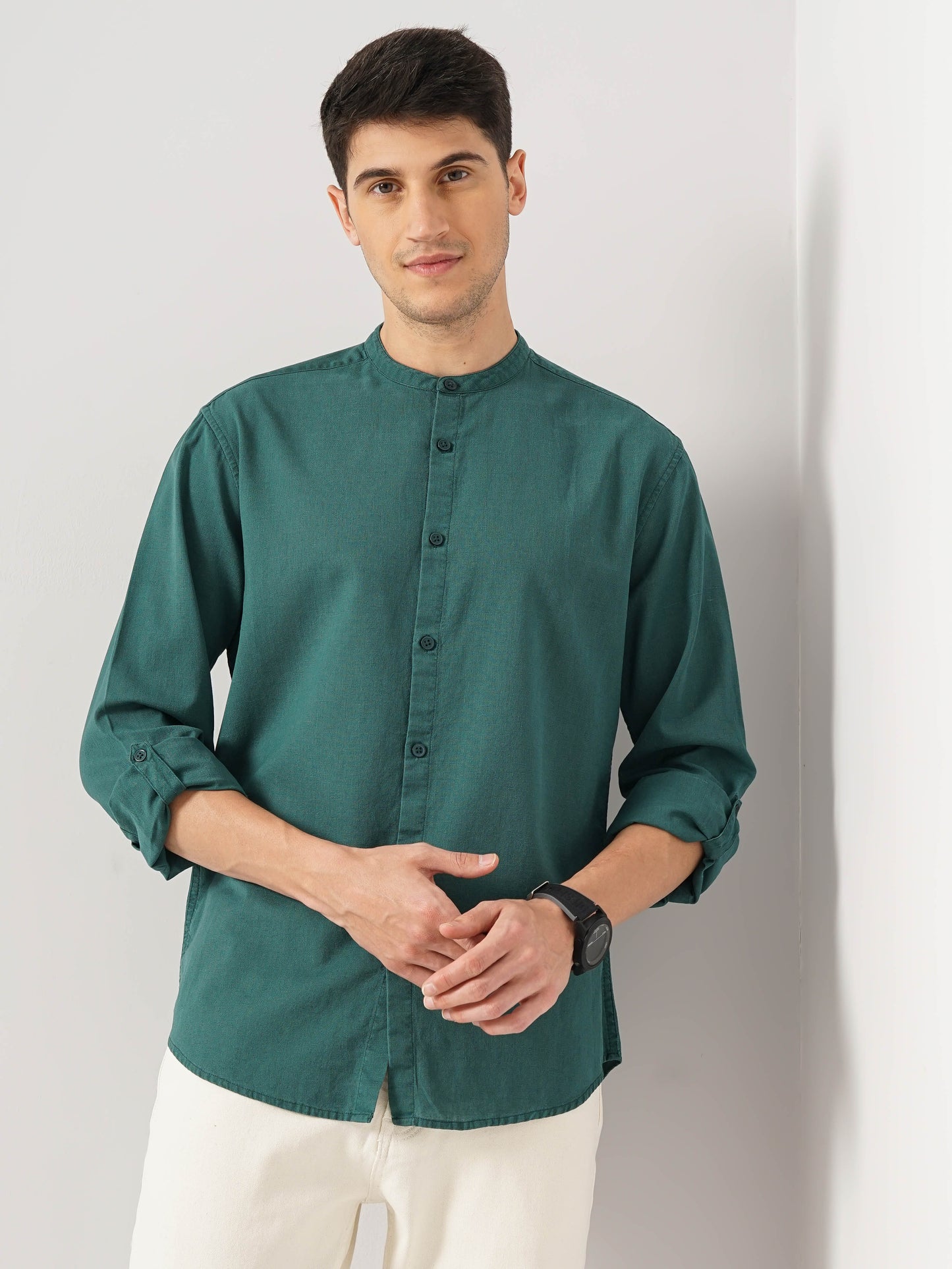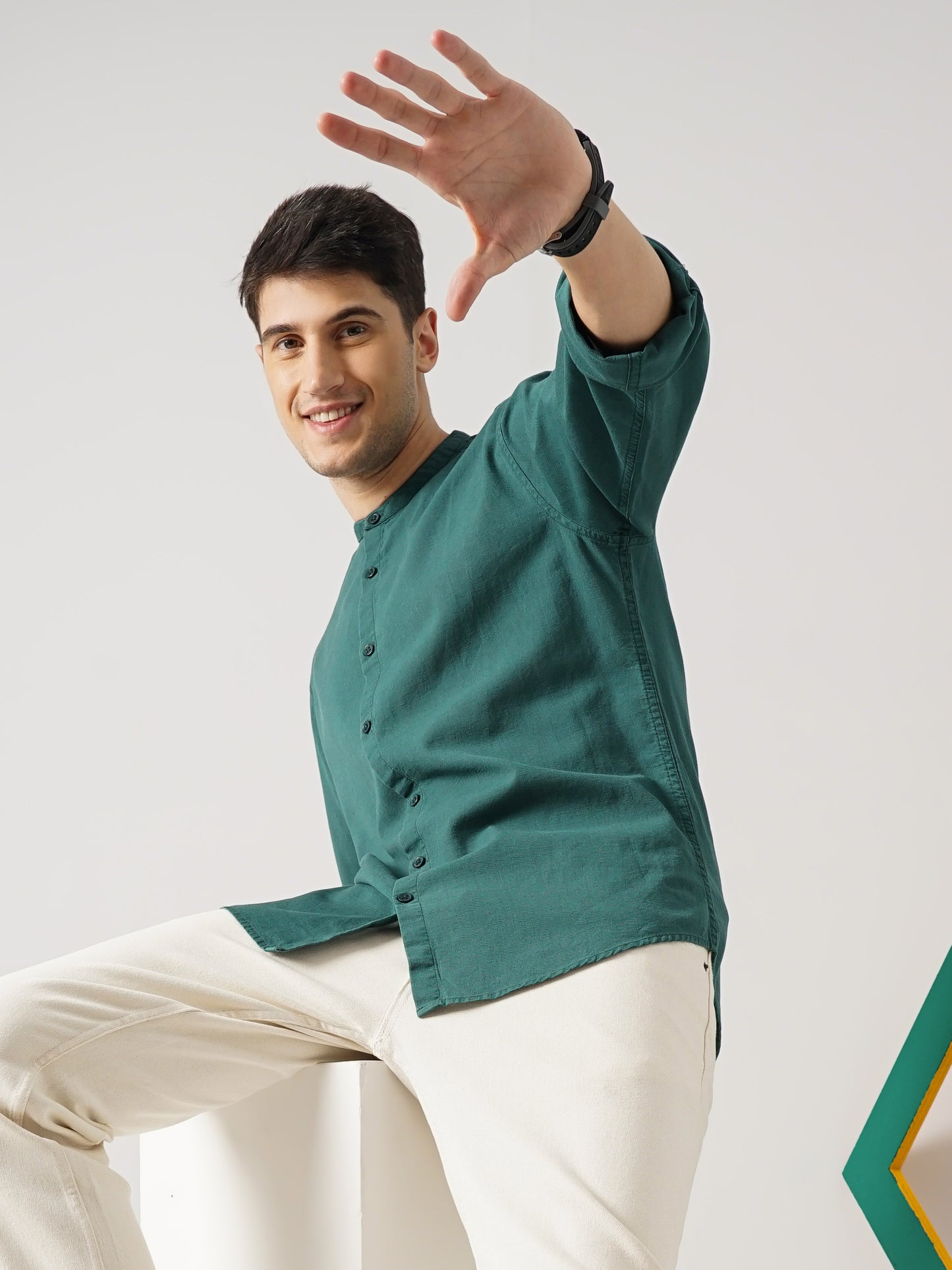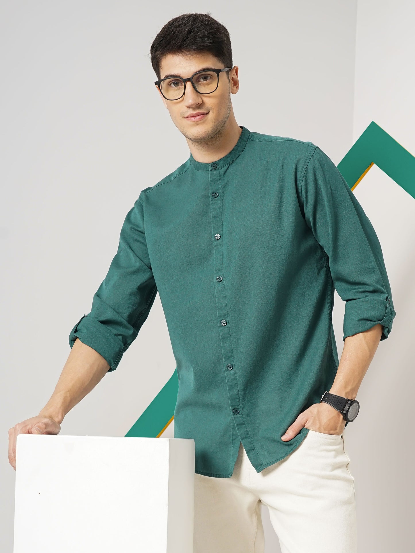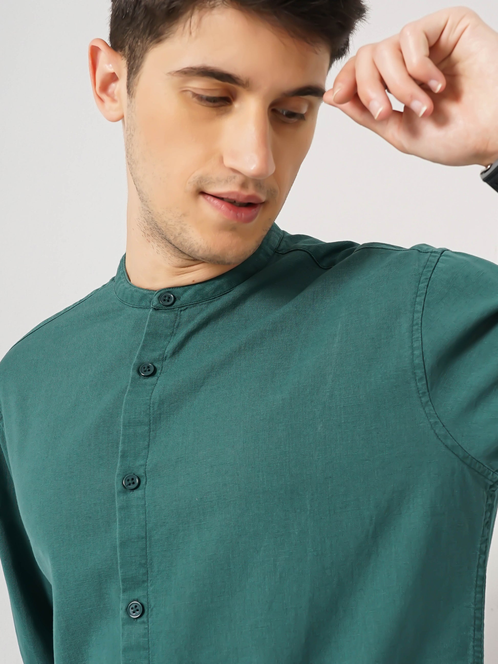 Elevate your casual style with the Celio Men's Green Solid Regular Fit Casual Shirt. Crafted from breathable linen, it features long sleeves, ideal for relaxed occasions. Disclaimer: All other items in the image are only for display purposes and will not be a part of the delivery content. Product colour may slightly vary due to photographic lighting sources. Country of Origin - India.