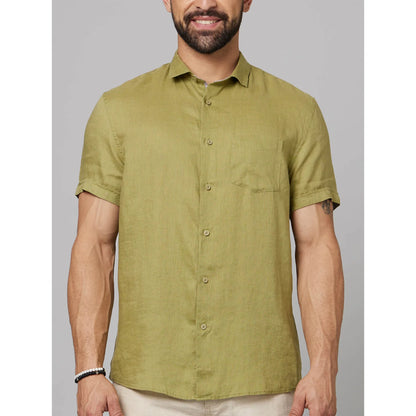 Elevate your casual style with the Celio Men's Olive Linen Shirt in Dacarain Cedar Green. Crafted from lightweight linen, it features half sleeves, perfect for warm weather. Disclaimer: All other items in the image are only for display purposes and will not be a part of the delivery content. Product colour may slightly vary due to photographic lighting sources. Country of Origin - India.