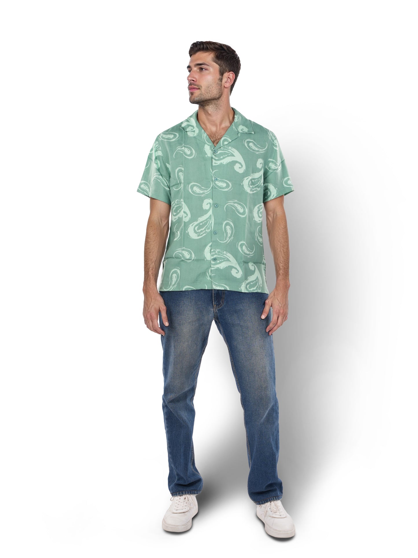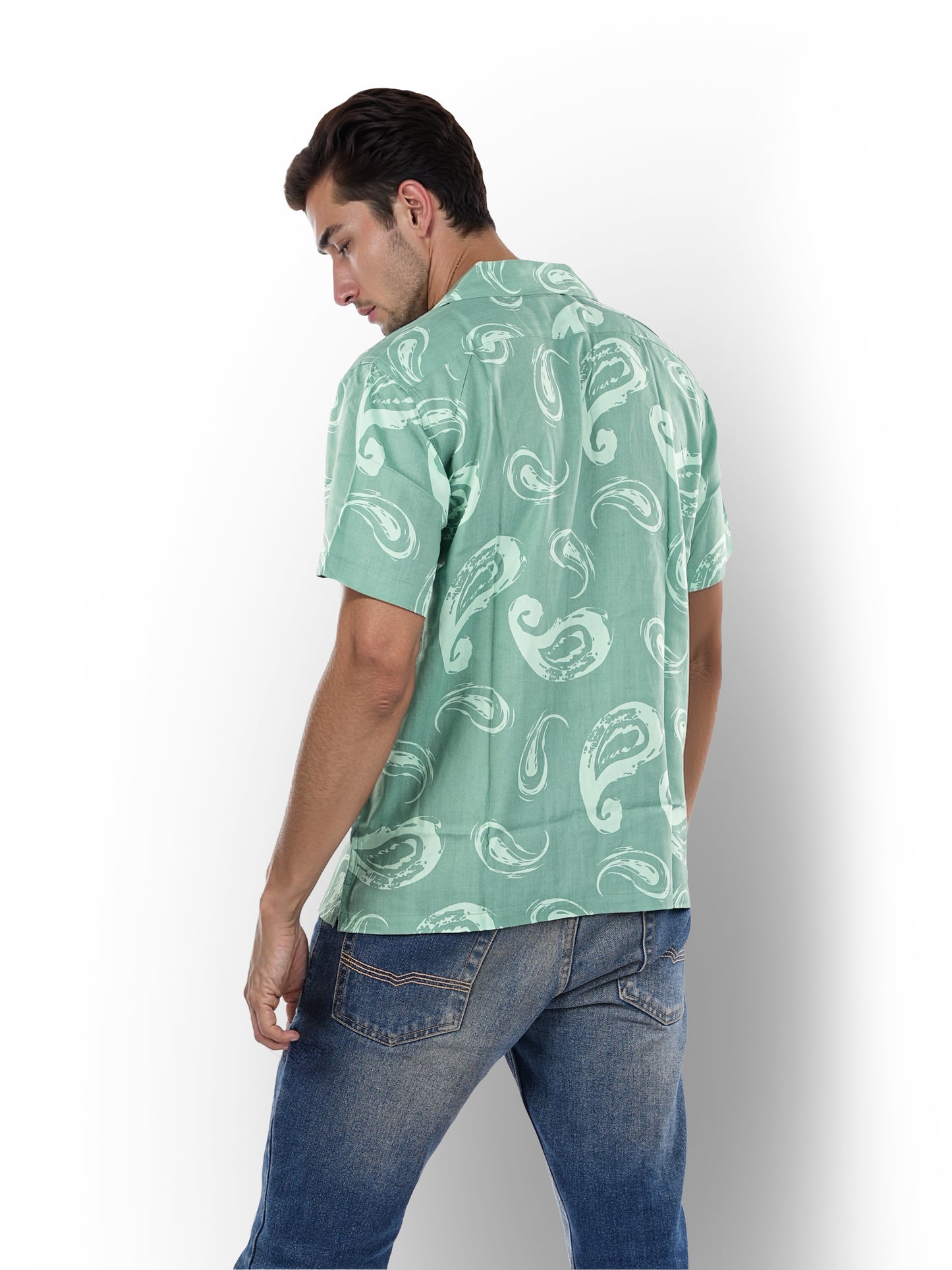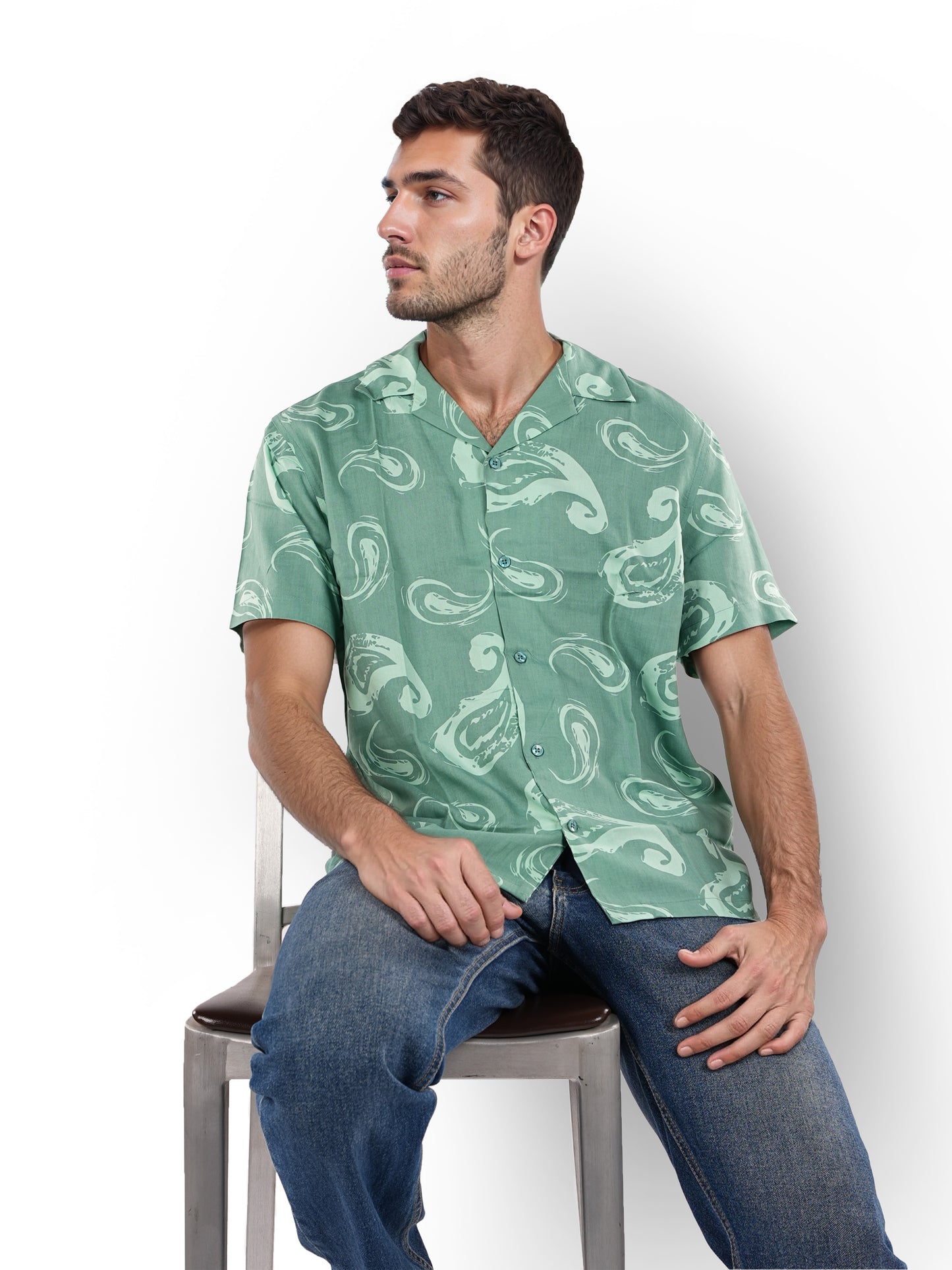 Elevate your casual wardrobe with the Men Green Cuban Collar Shirt by Celio. Crafted from soft touch viscose rayon, it features a regular fit and short sleeves, perfect for any occasion. Disclaimer: All other items in the image are only for display purposes and will not be a part of the delivery content. Product colour may slightly vary due to photographic lighting sources. Country of Origin - India.