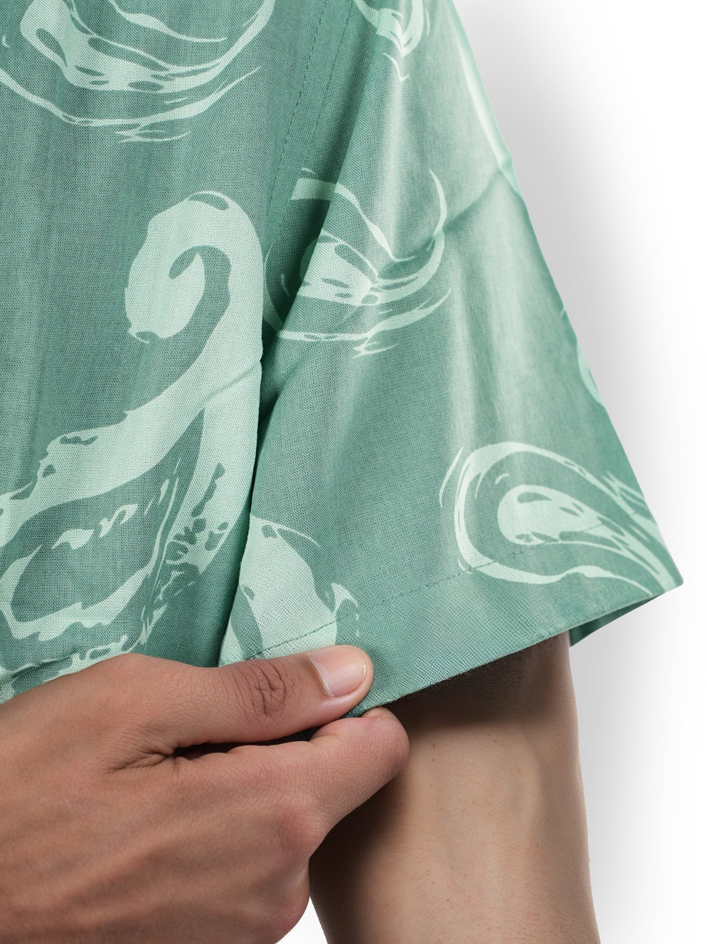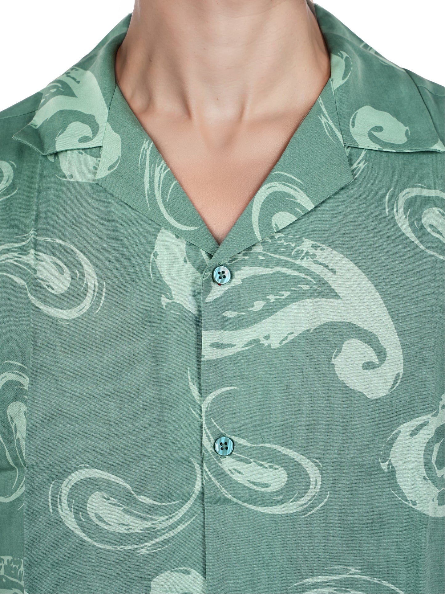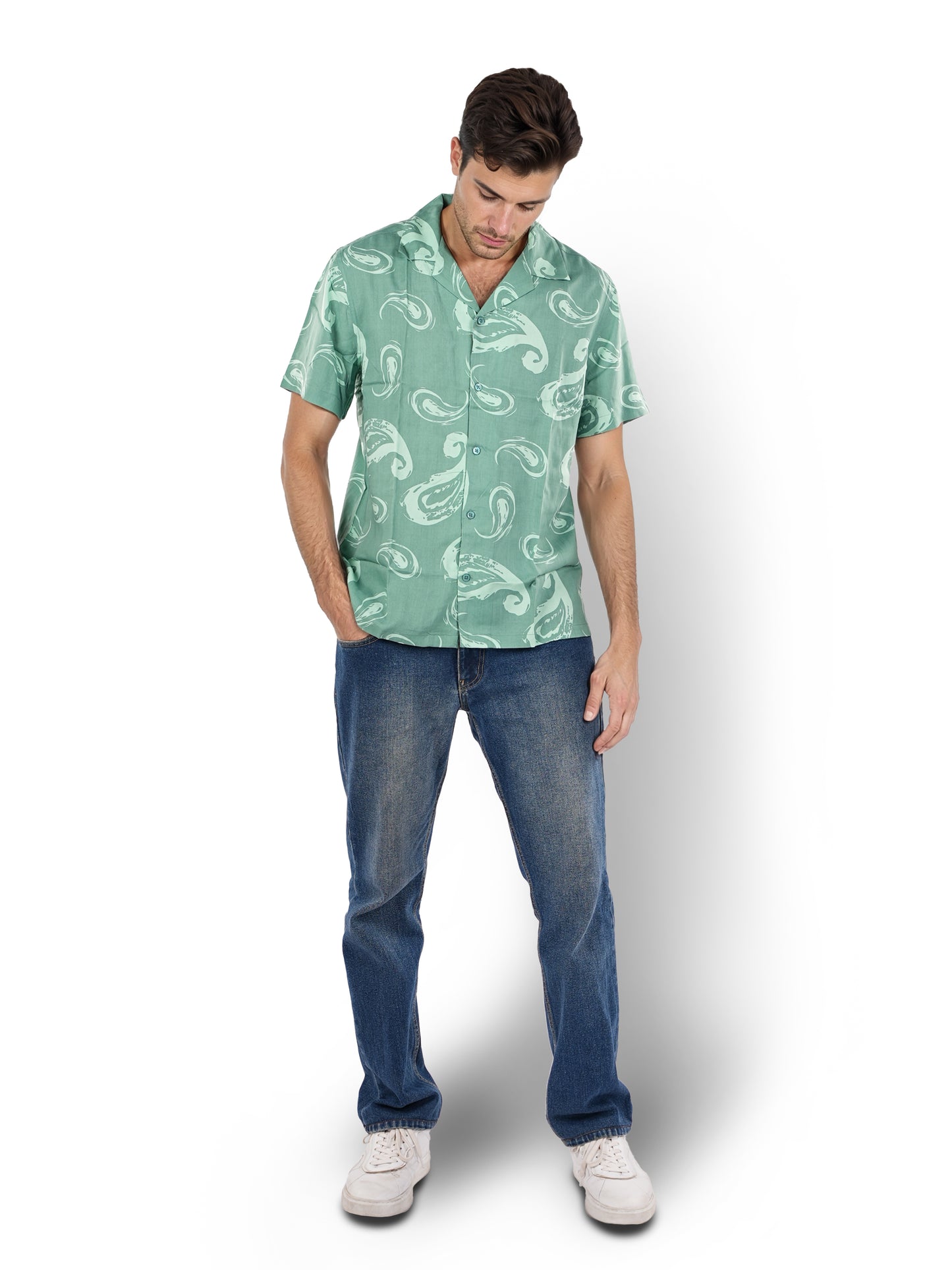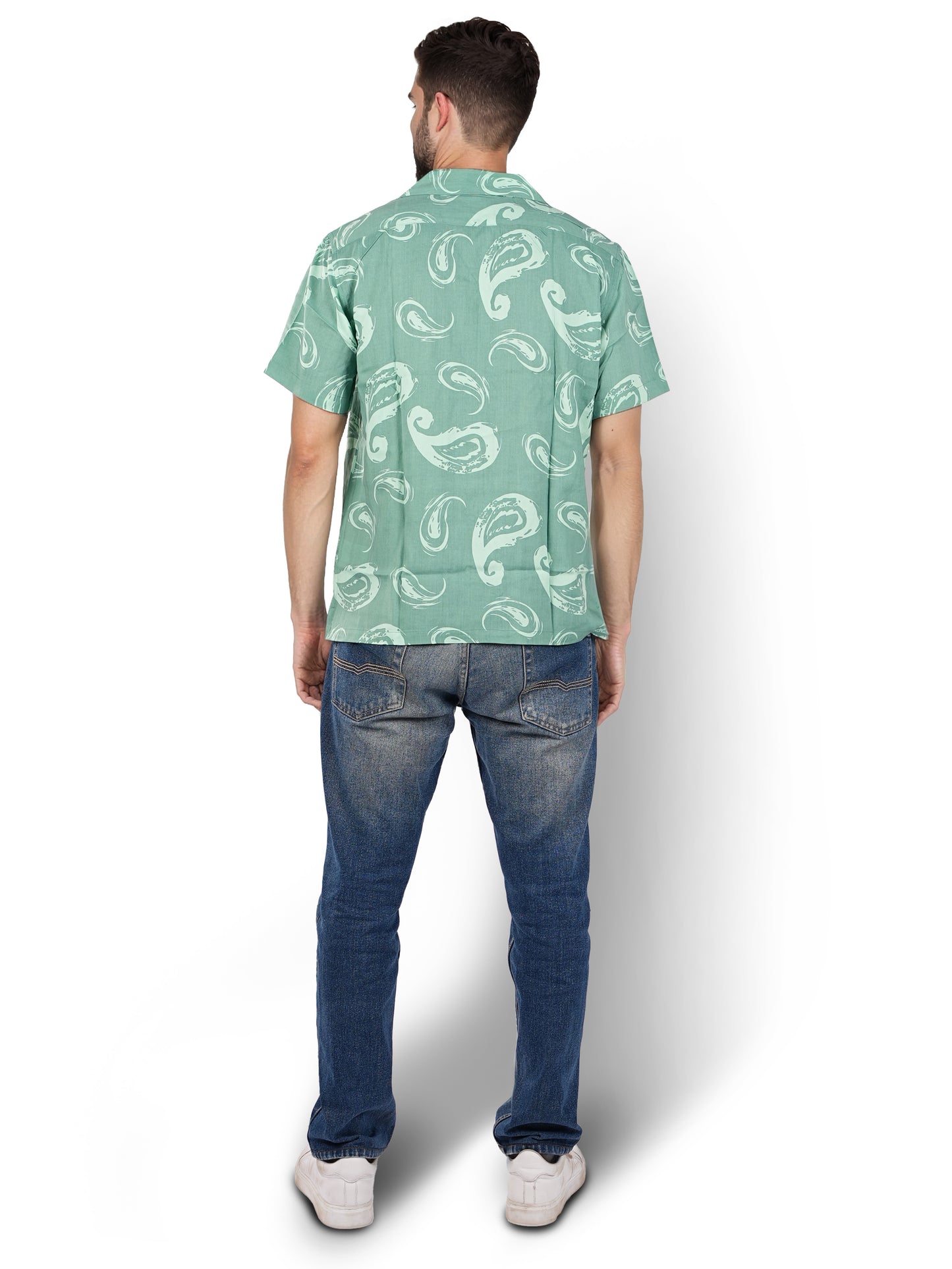 Elevate your casual wardrobe with the Men Green Cuban Collar Shirt by Celio. Crafted from soft touch viscose rayon, it features a regular fit and short sleeves, perfect for any occasion. Disclaimer: All other items in the image are only for display purposes and will not be a part of the delivery content. Product colour may slightly vary due to photographic lighting sources. Country of Origin - India.