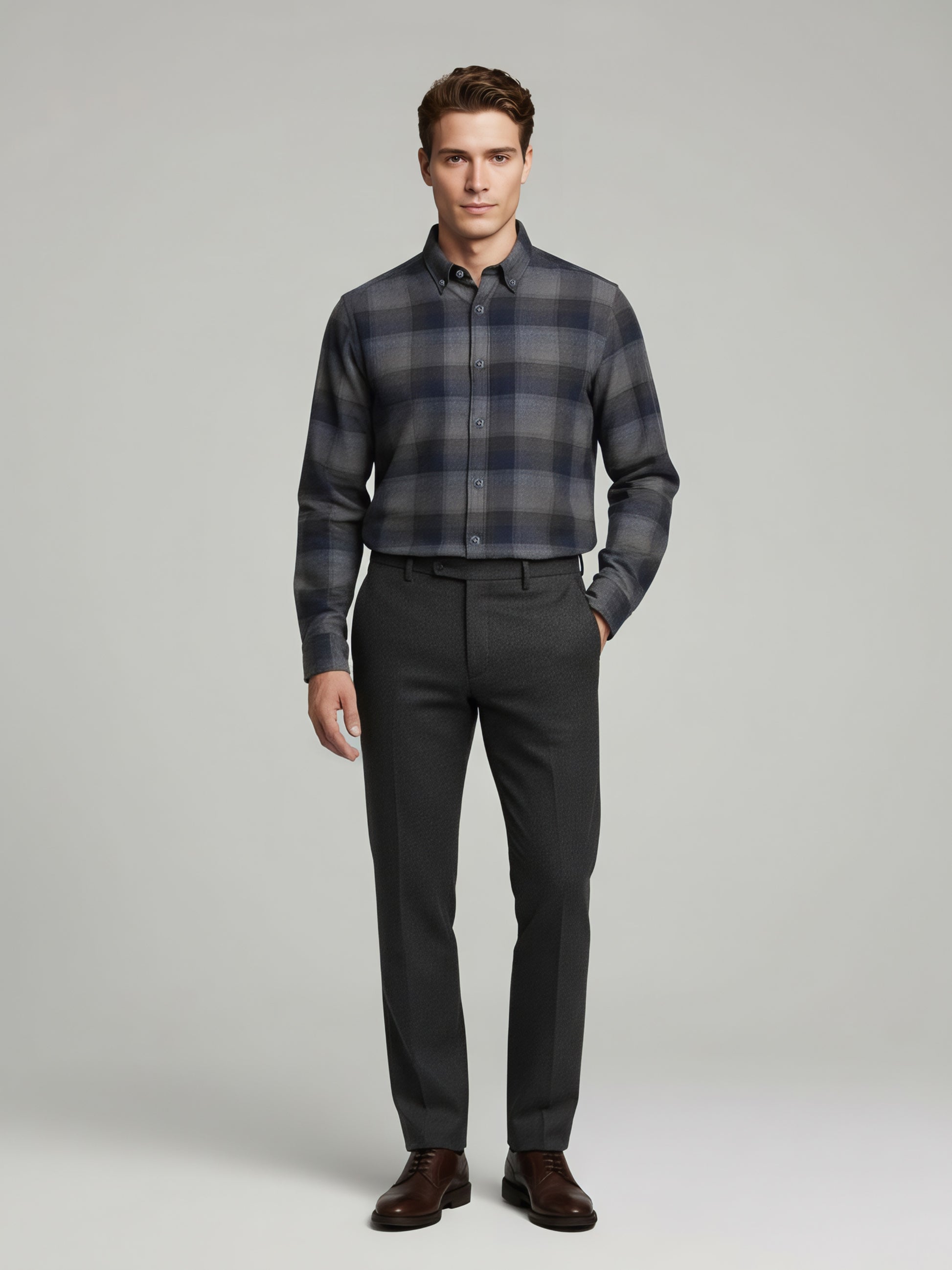 Discover the Celio Men's Grey Checked Regular Fit Shirt, crafted from soft cotton. Perfect for casual outings, it features long sleeves and a stylish check pattern. Disclaimer: All other items in the image are only for display purposes and will not be a part of the delivery content. Product colour may slightly vary due to photographic lighting sources. Country of Origin - India.