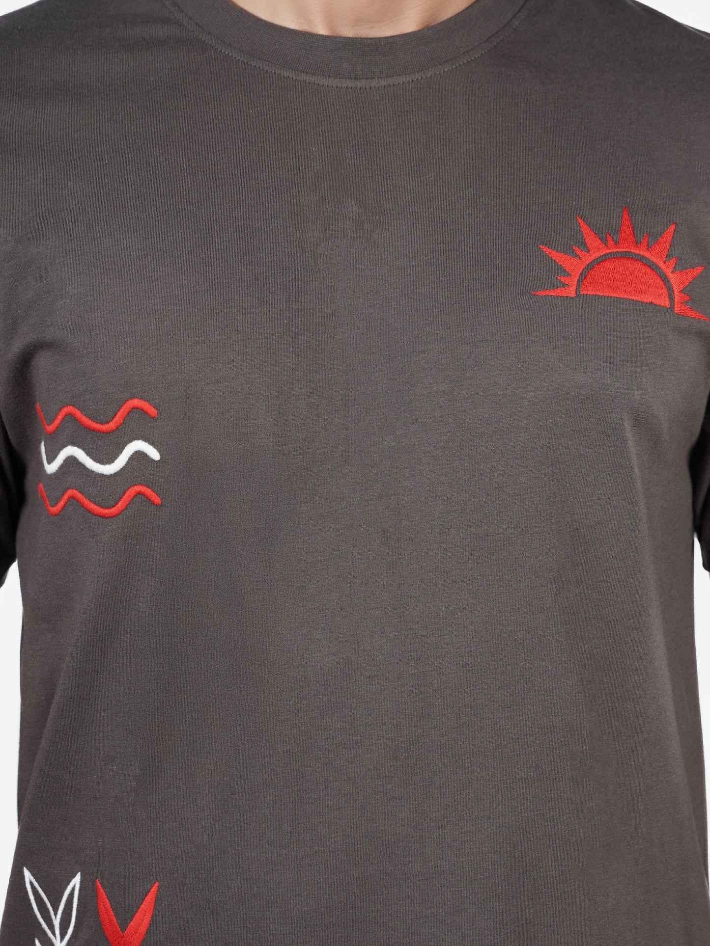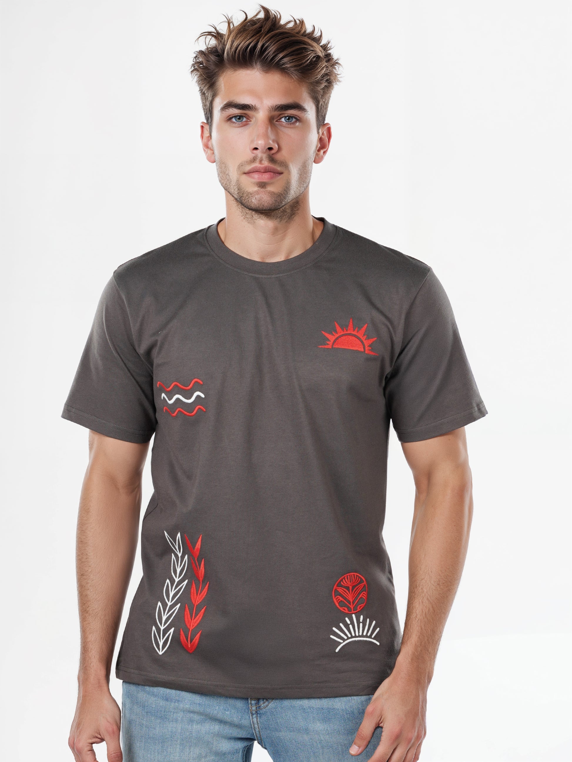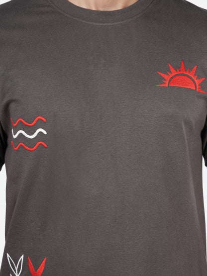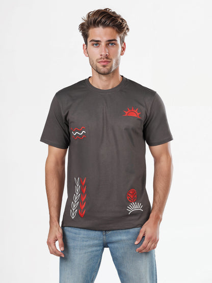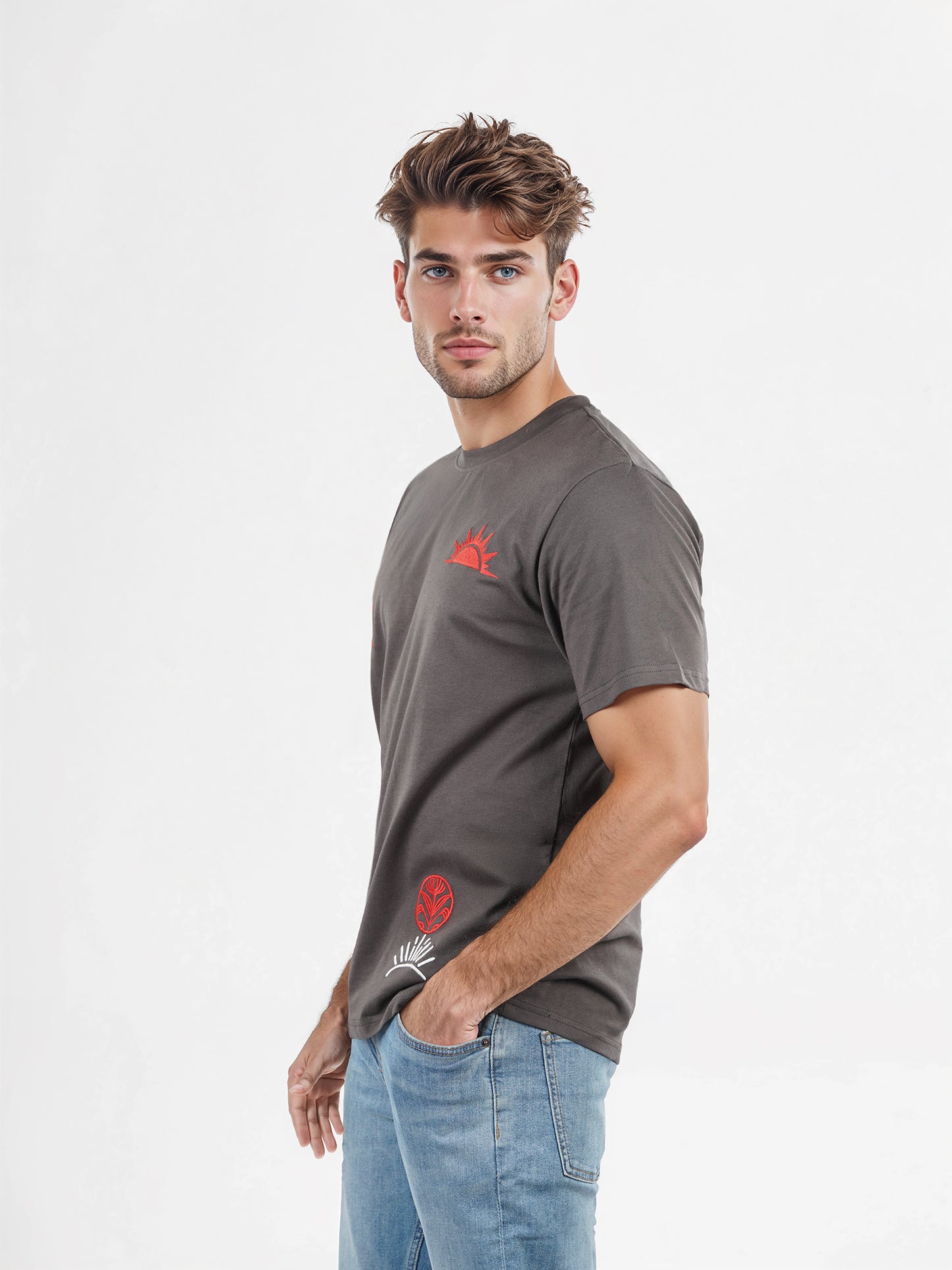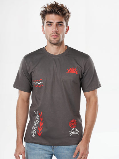 Elevate your casual wardrobe with the Celio Men Grey Embroidered Boxy Cotton T-shirt. Crafted from soft cotton, featuring short sleeves and a unique design perfect for everyday wear. Disclaimer: All other items in the image are only for display purposes and will not be a part of the delivery content. Product colour may slightly vary due to photographic lighting sources. Country of Origin - India.