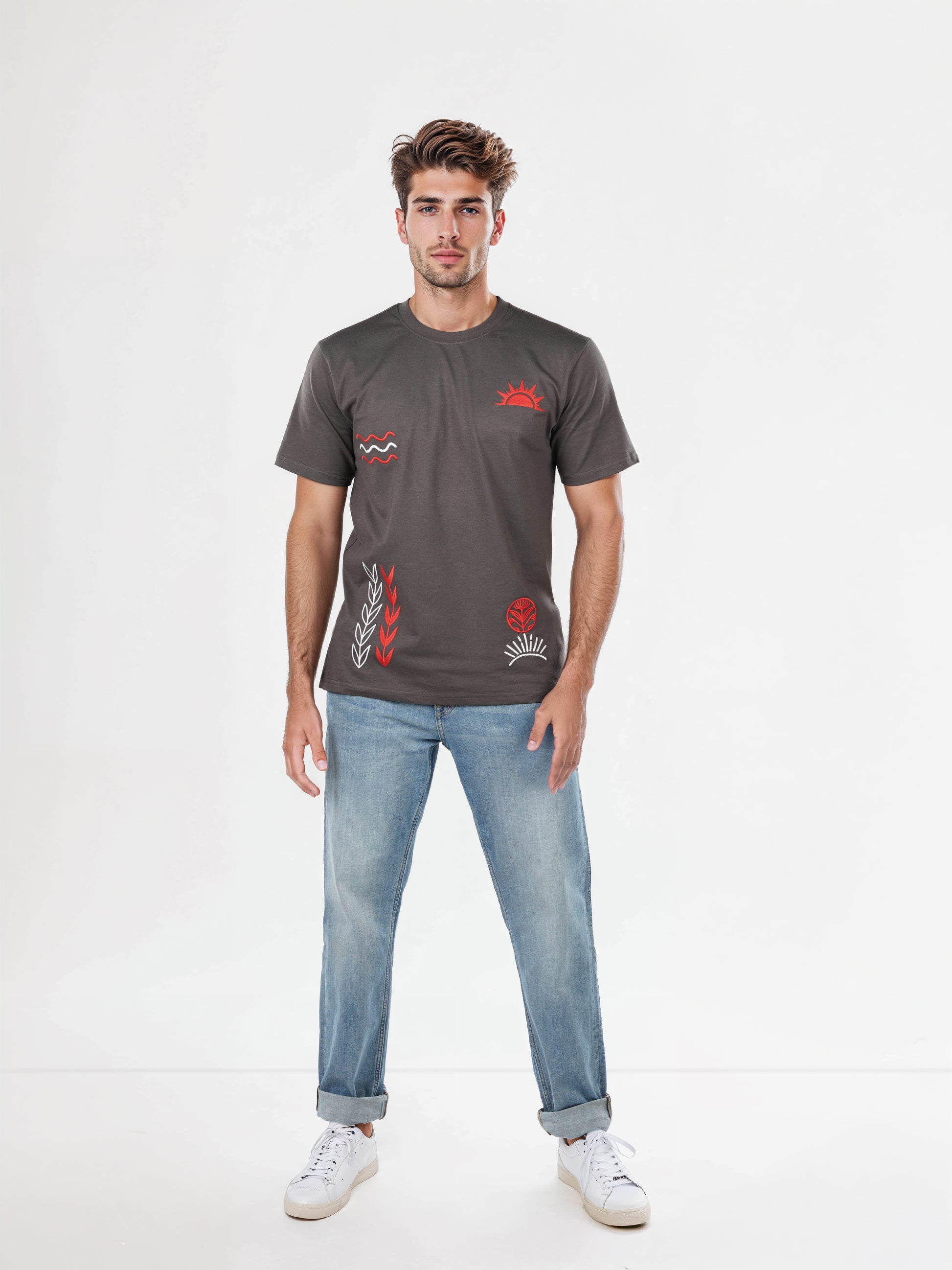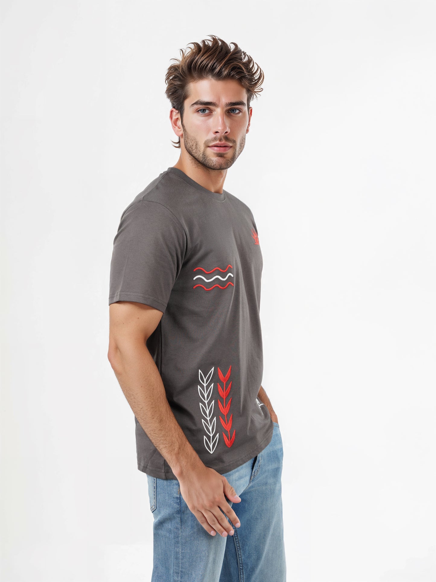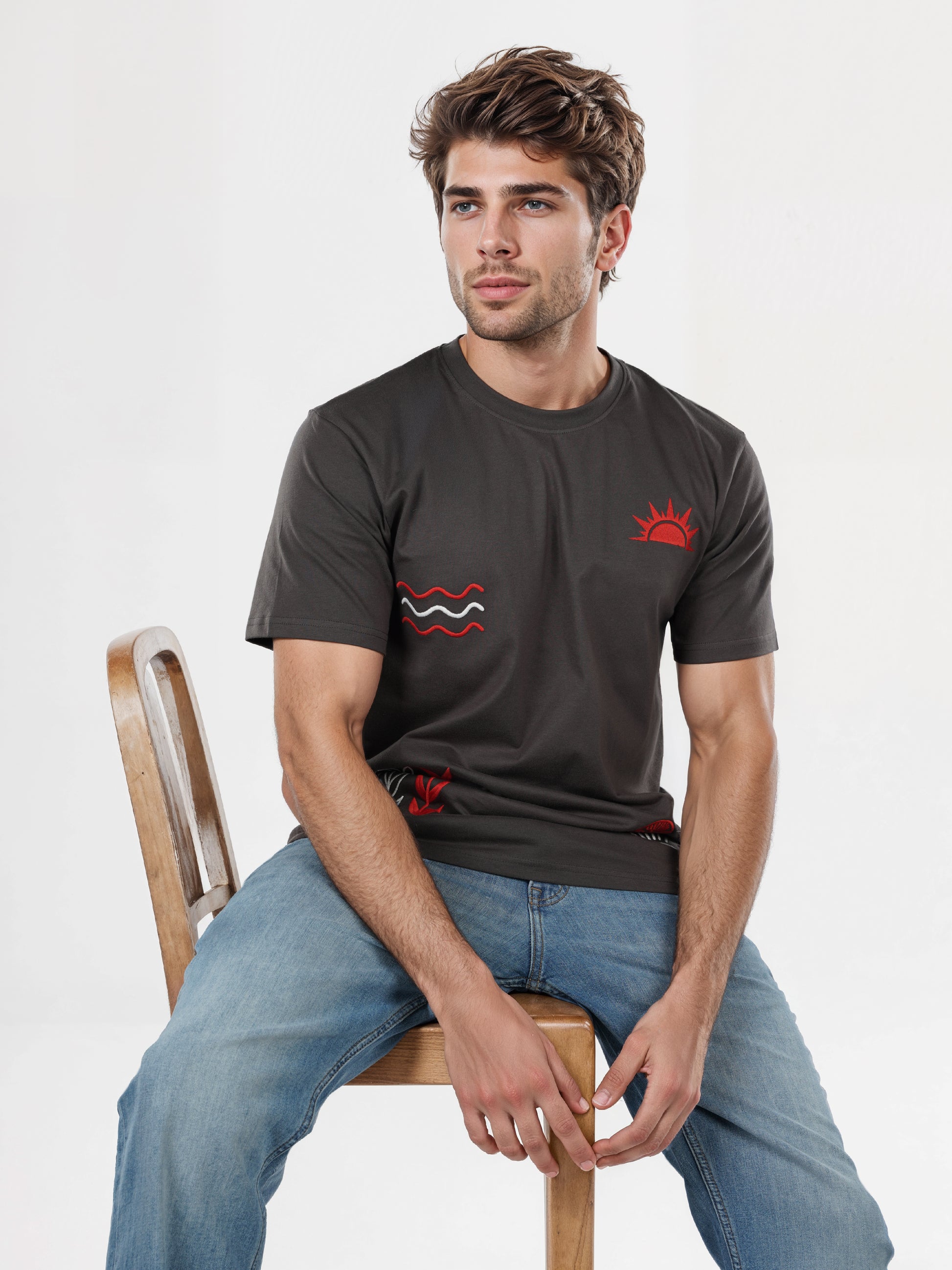 Elevate your casual wardrobe with the Celio Men Grey Embroidered Boxy Cotton T-shirt. Crafted from soft cotton, featuring short sleeves and a unique design perfect for everyday wear. Disclaimer: All other items in the image are only for display purposes and will not be a part of the delivery content. Product colour may slightly vary due to photographic lighting sources. Country of Origin - India.