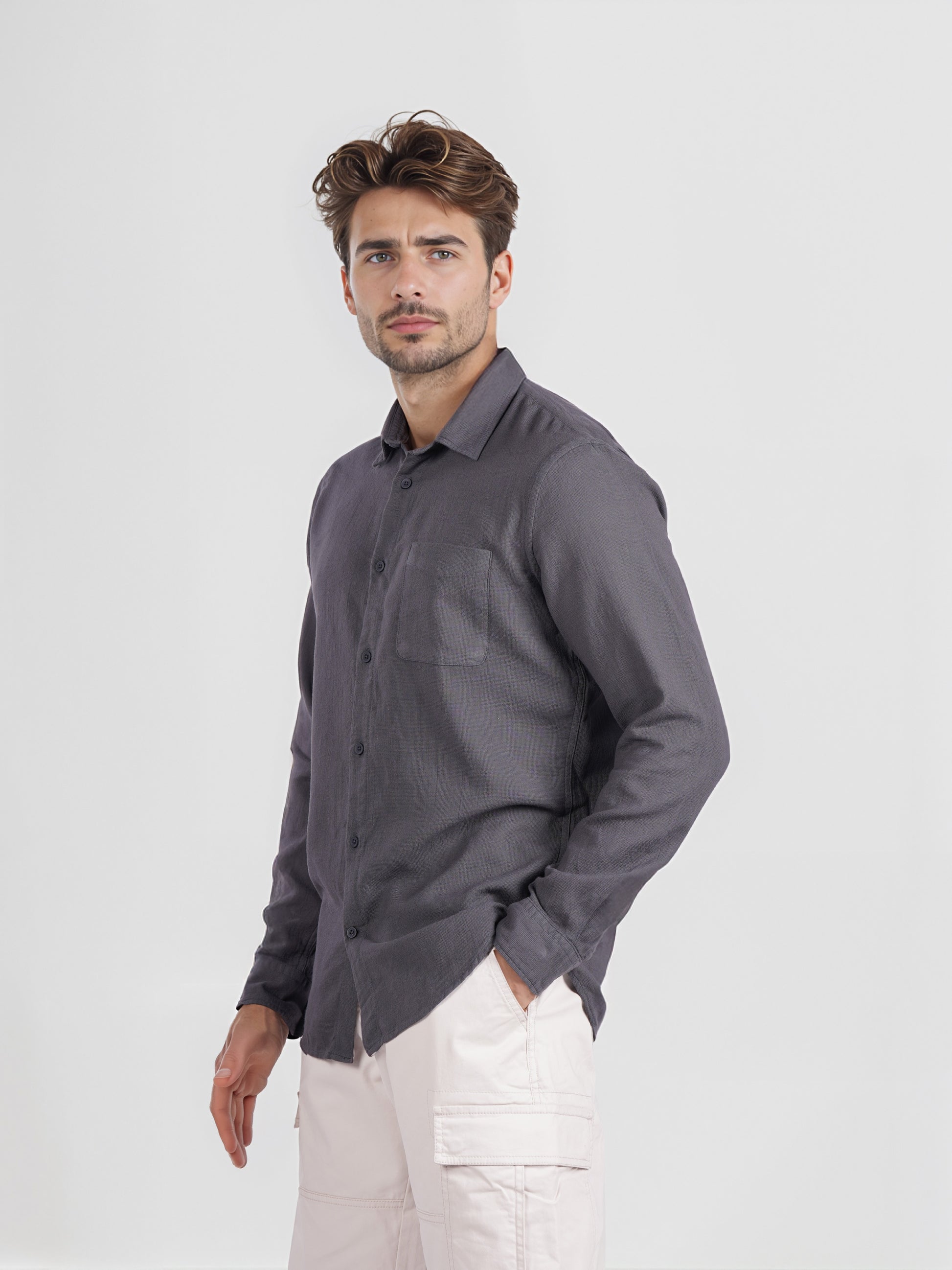 Stylish Celio men’s grey cotton shirt in a regular fit. Perfect for casual occasions, featuring long sleeves for comfort and versatility. Disclaimer: All other items in the image are only for display purposes and will not be a part of the delivery content. Product colour may slightly vary due to photographic lighting sources. Country of Origin - India.