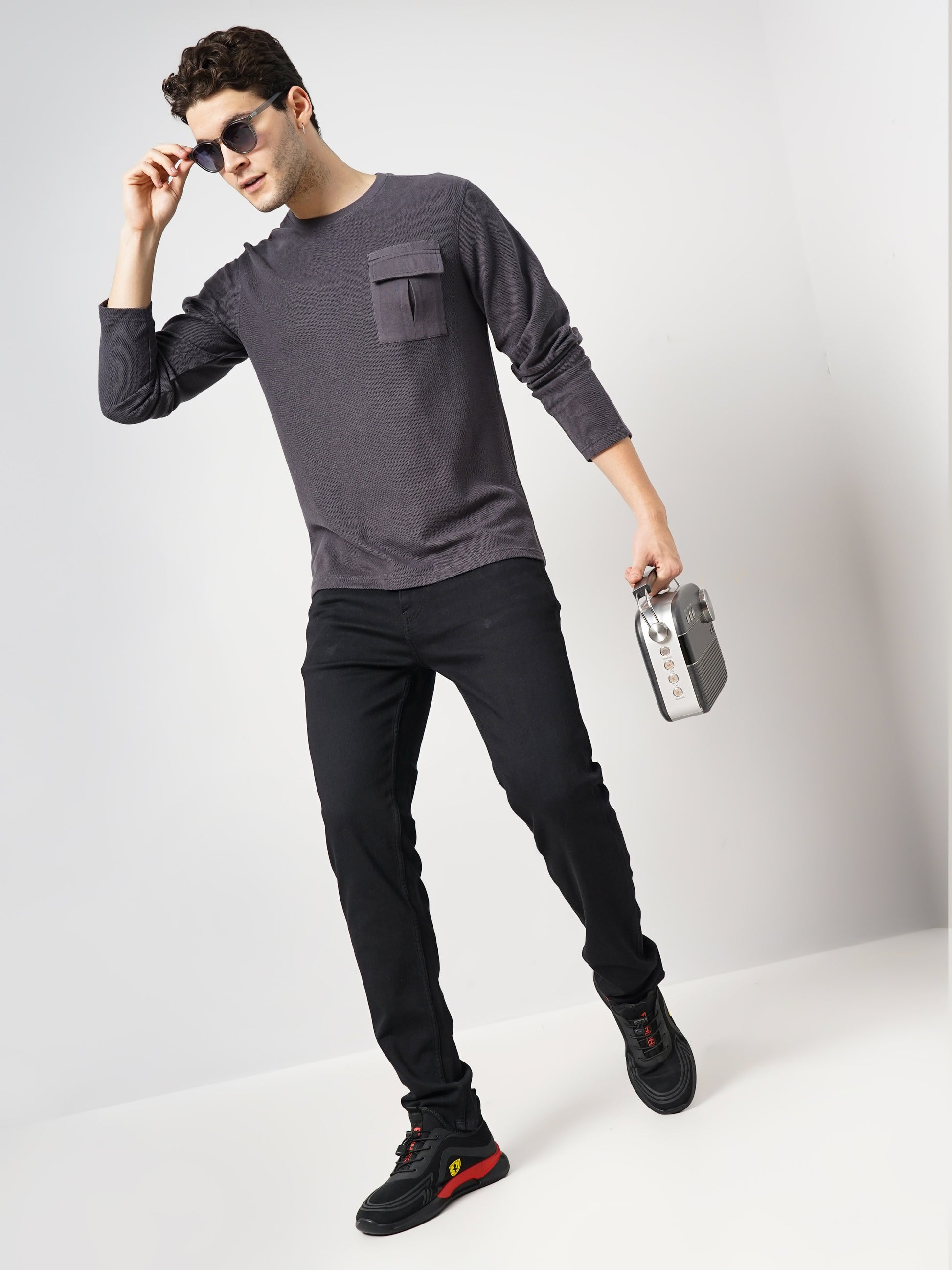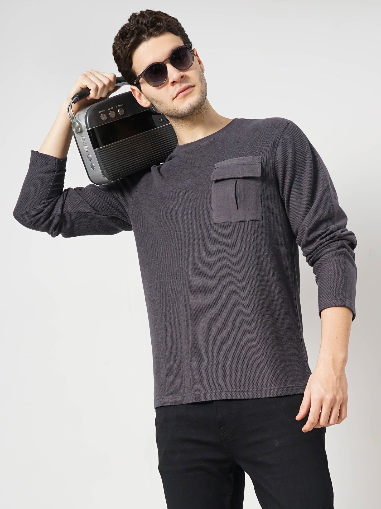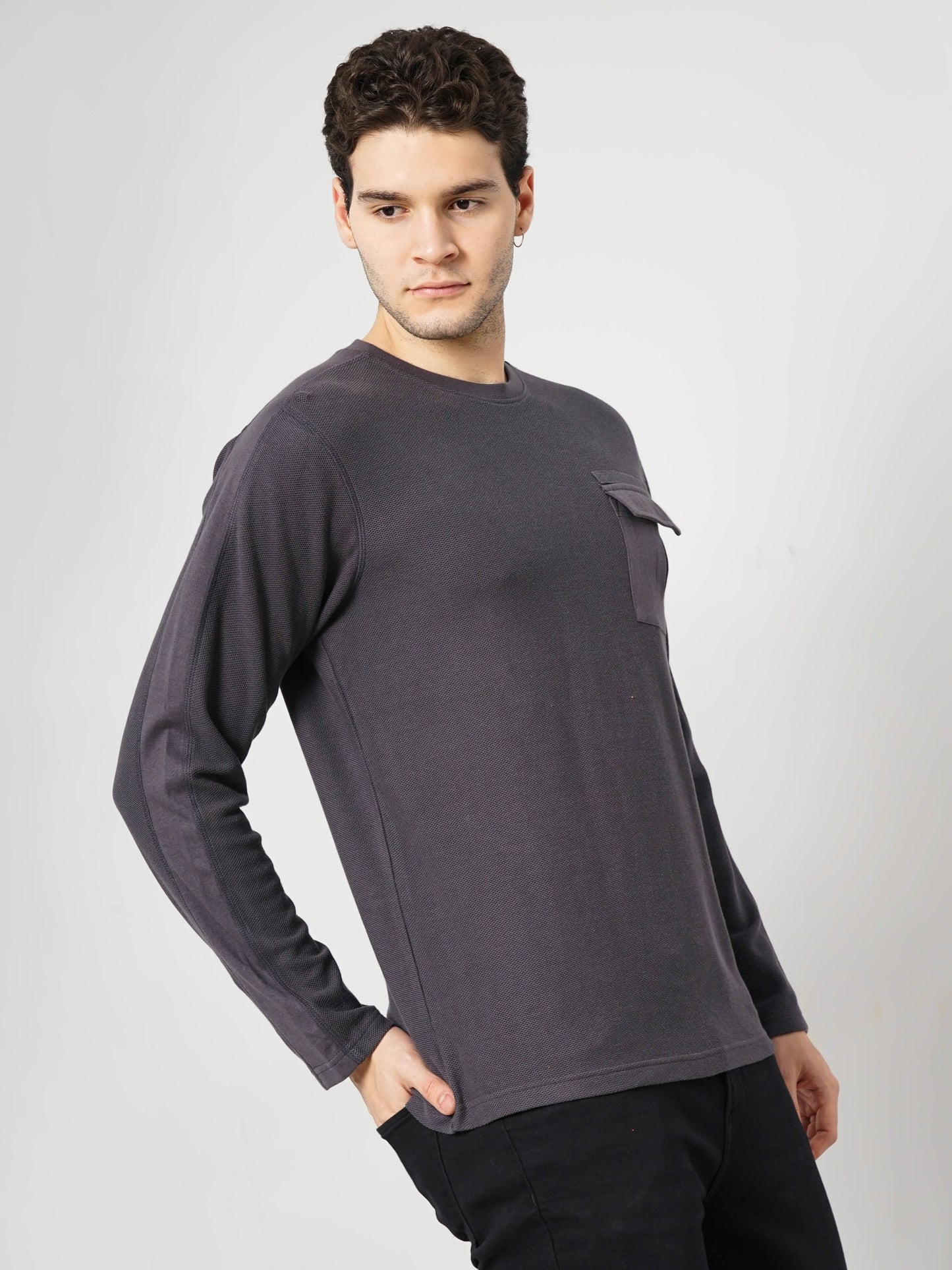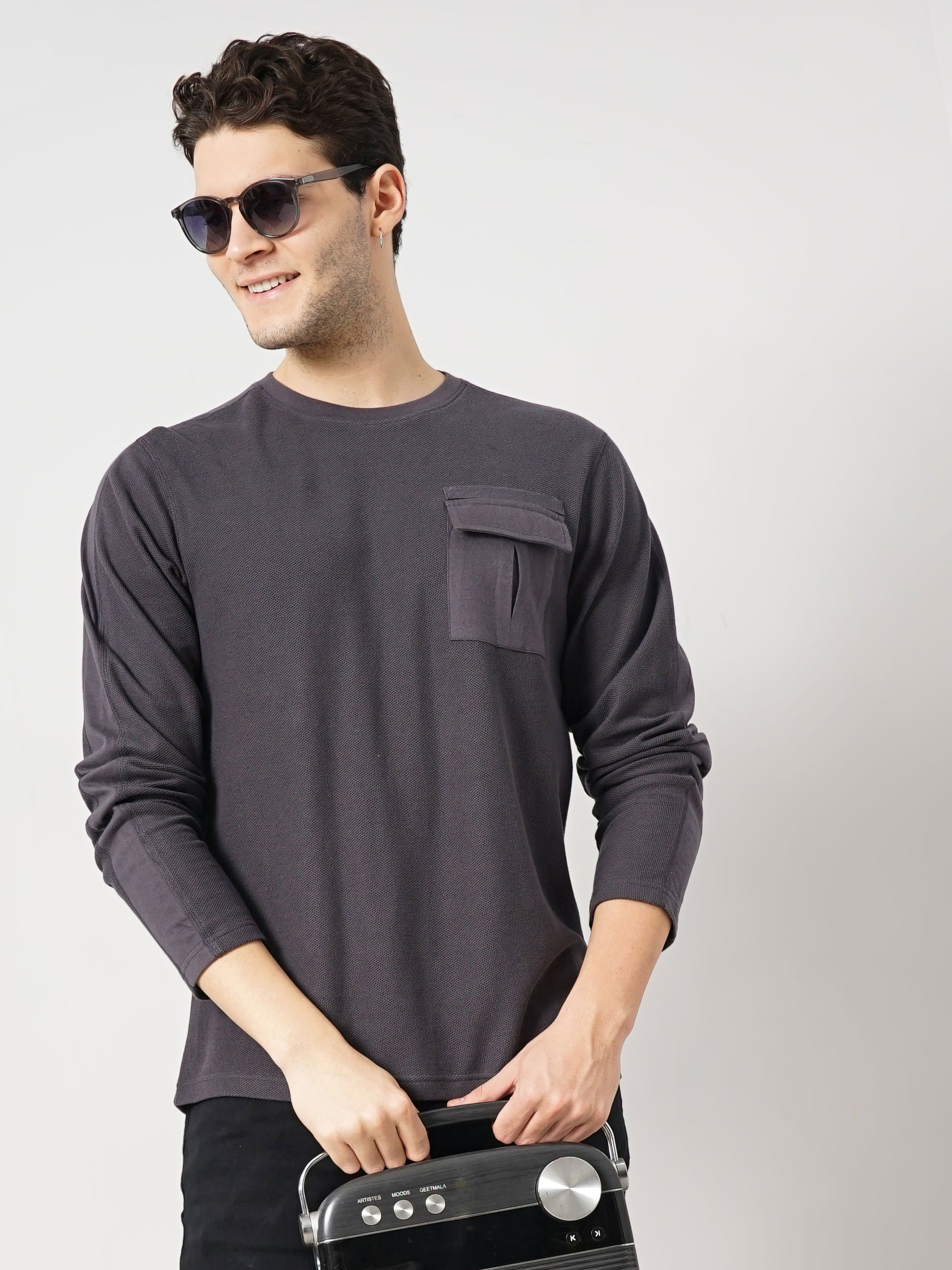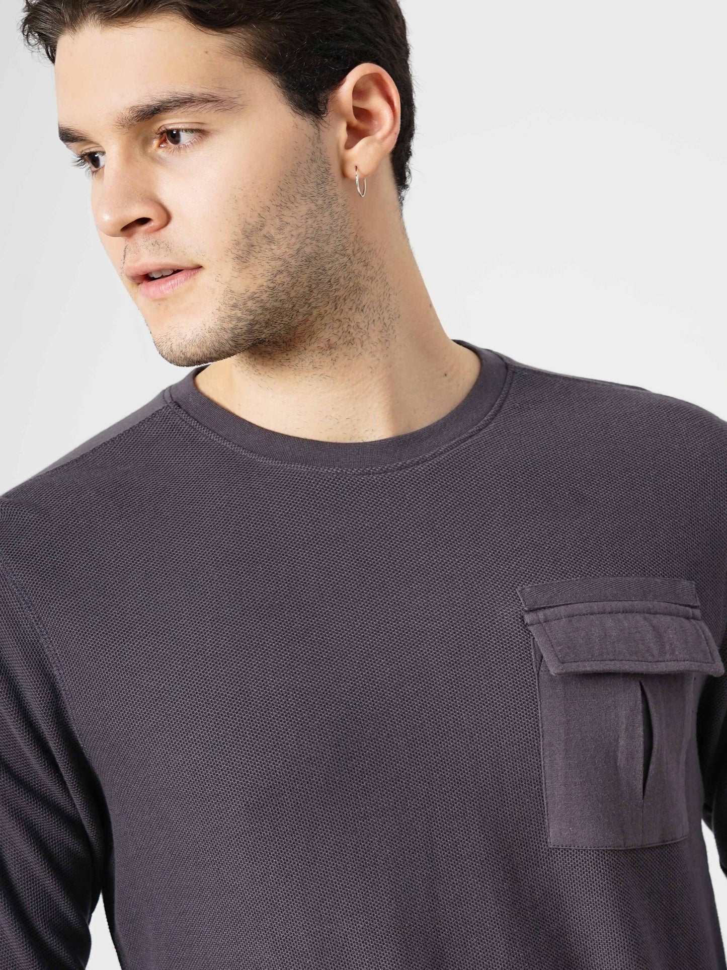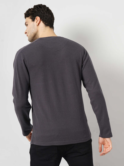 This grey men's t-shirt from Celio is crafted from soft cotton. It features a regular fit, long sleeves, and a stylish textured design, perfect for casual occasions. Disclaimer: All other items in the image are only for display purposes and will not be a part of the delivery content. Product colour may slightly vary due to photographic lighting sources. Country of Origin - India.