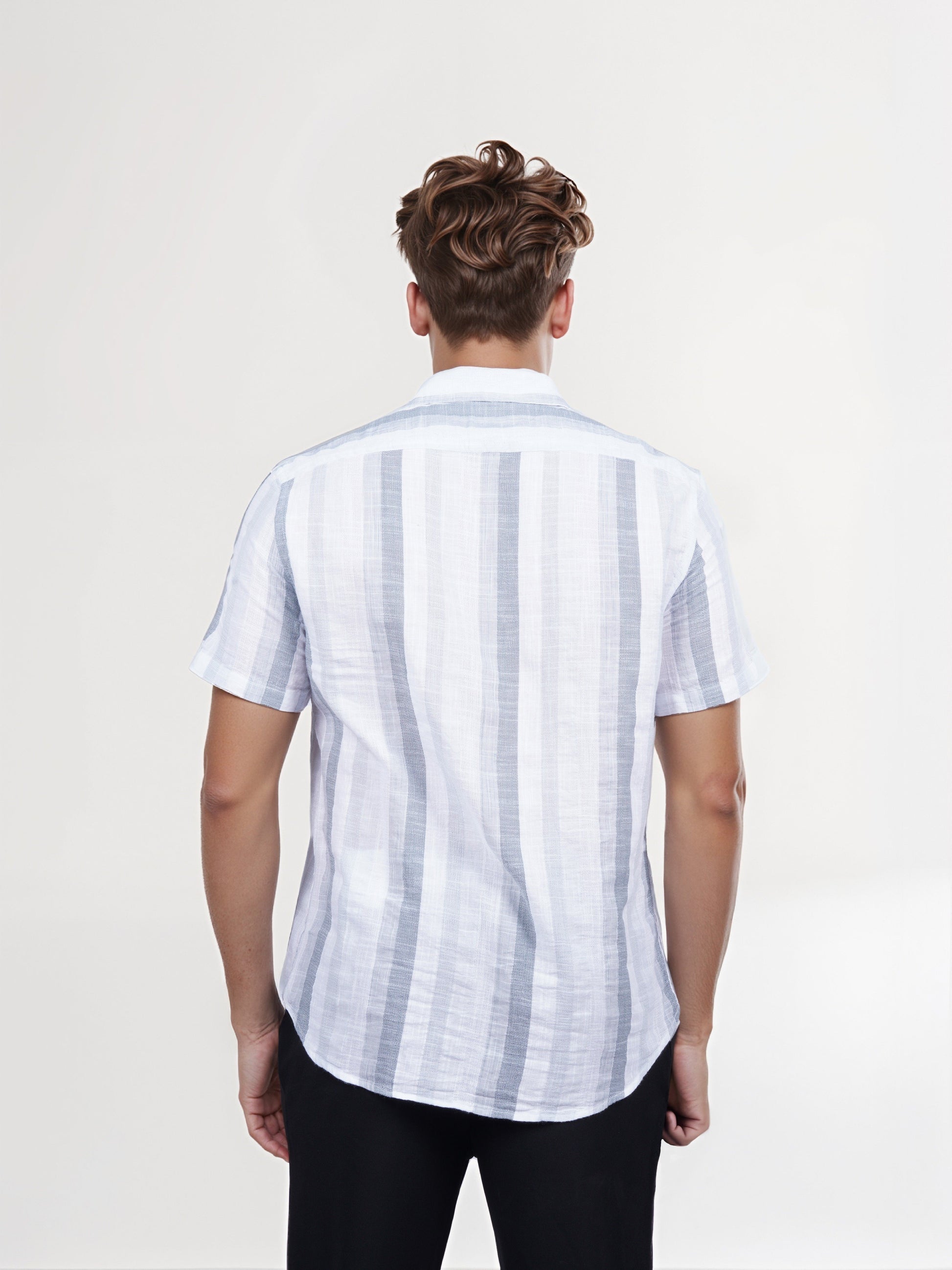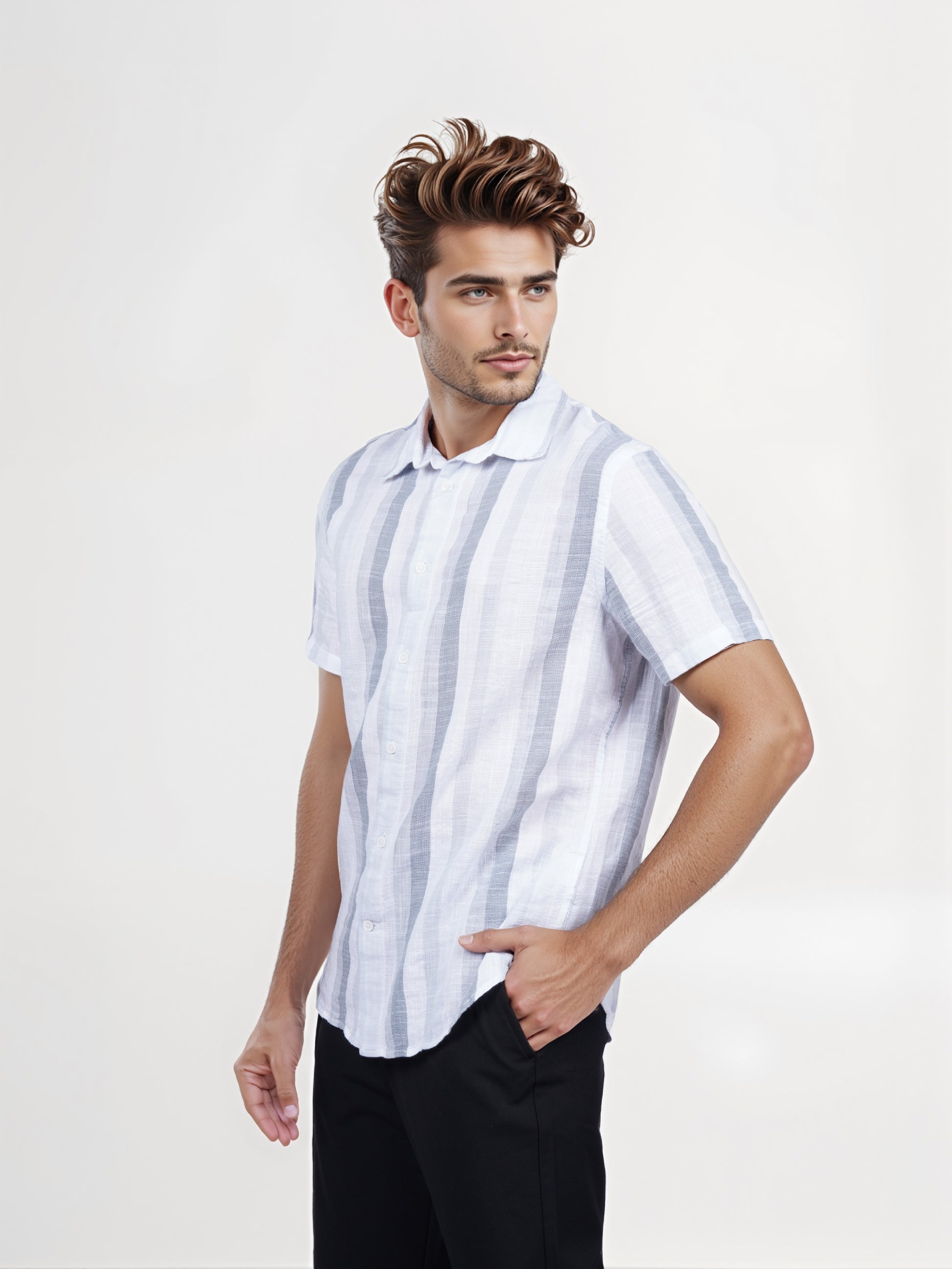 Explore style with the Celio Men Grey Striped Shirt. Crafted from breathable cotton, it features short sleeves and a regular fit, perfect for casual outings. Disclaimer: All other items in the image are only for display purposes and will not be a part of the delivery content. Product colour may slightly vary due to photographic lighting sources. Country of Origin - India.