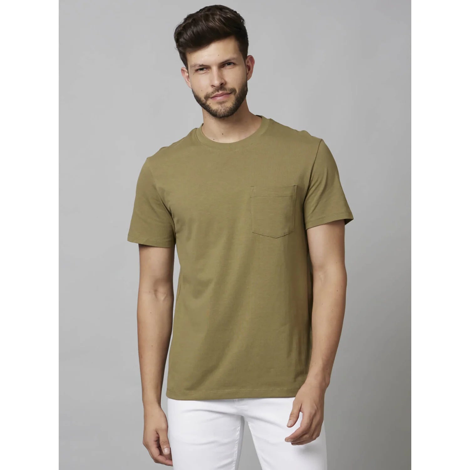 Celio* Solid Regular Fit Cotton-Poly-Blend Khaki T-Shirt