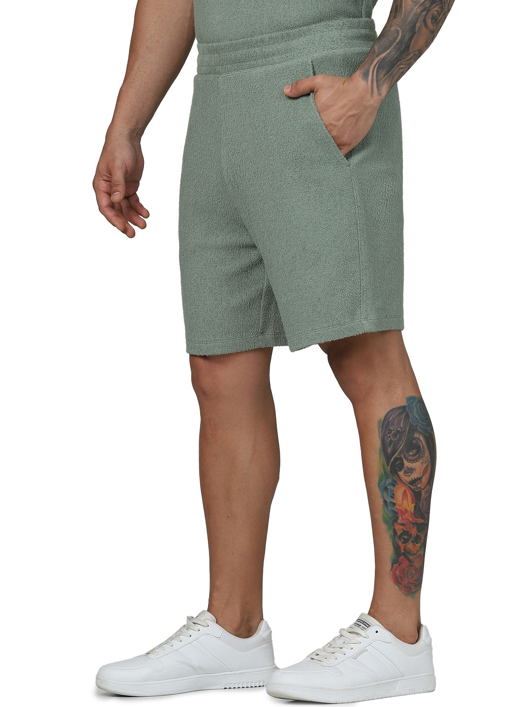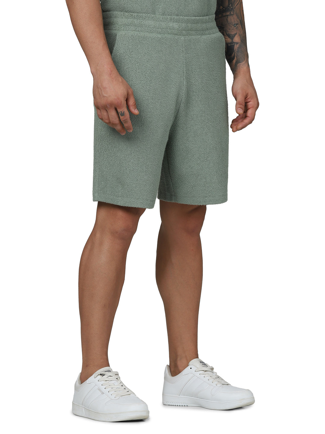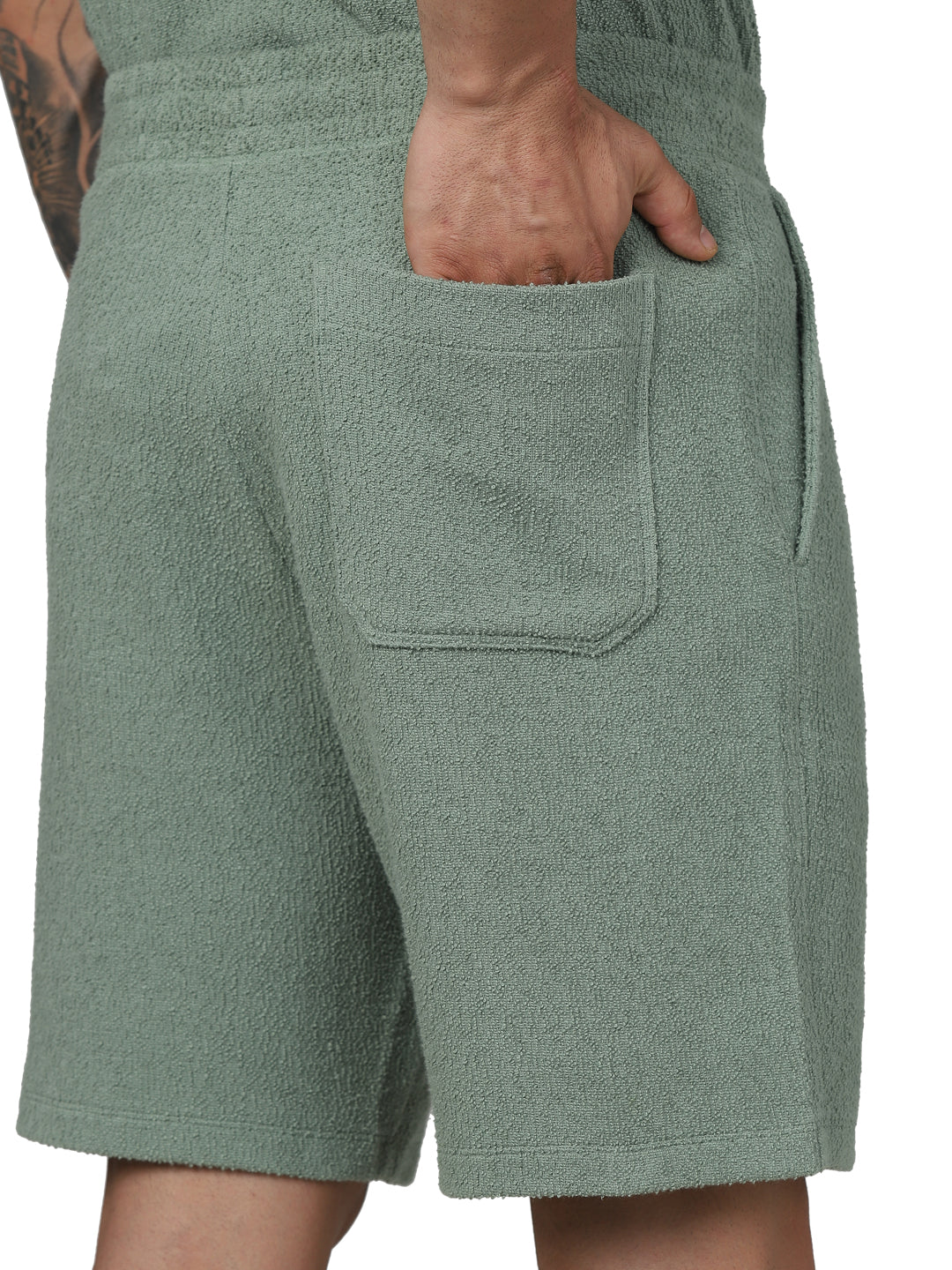 Elevate your casual style with Celio's Green Solid Regular Fit Cotton Shorts. Perfect for men, these comfortable shorts are ideal for any laid-back occasion. Disclaimer: All other items in the image are only for display purposes and will not be a part of the delivery content. Product colour may slightly vary due to photographic lighting sources. Country of Origin - India.