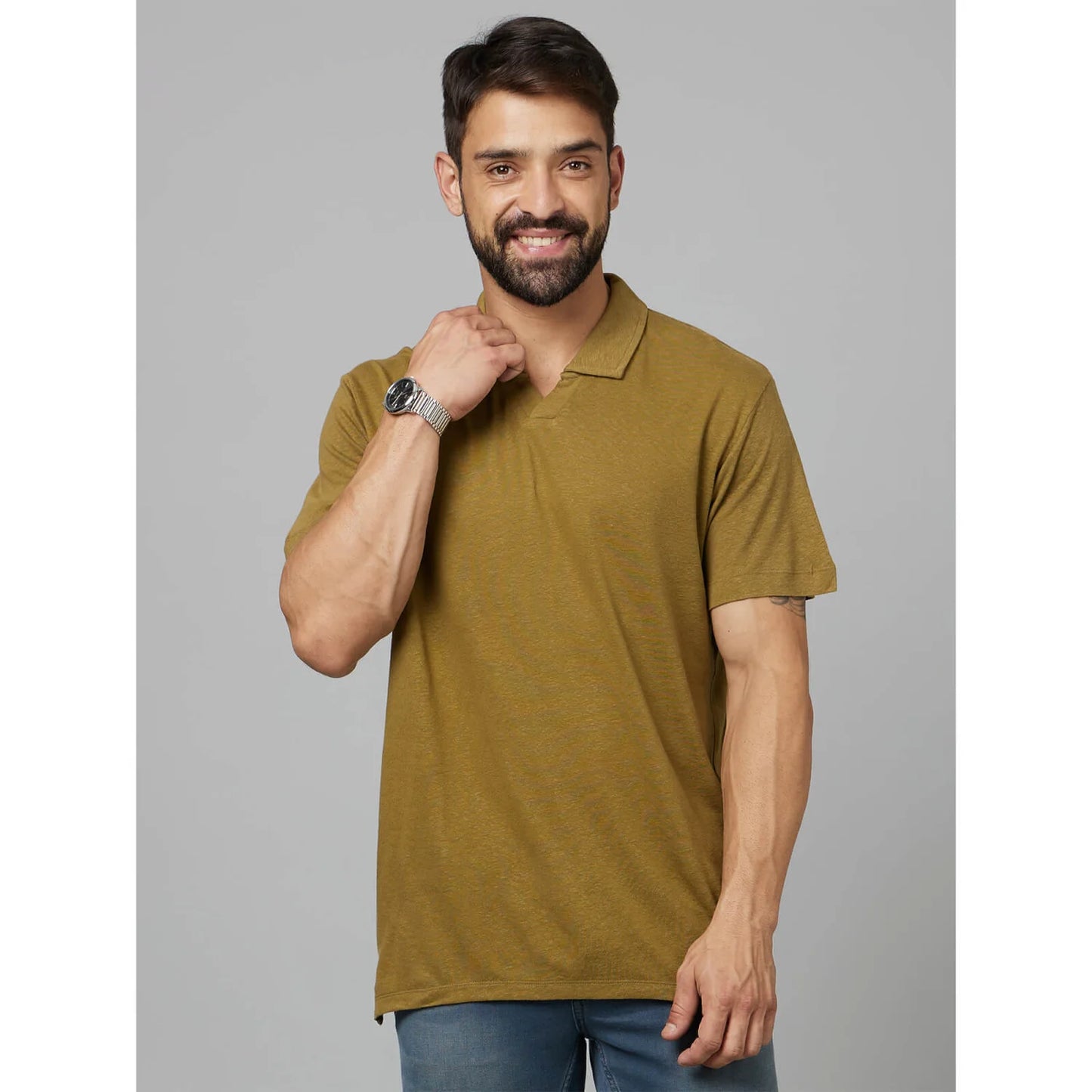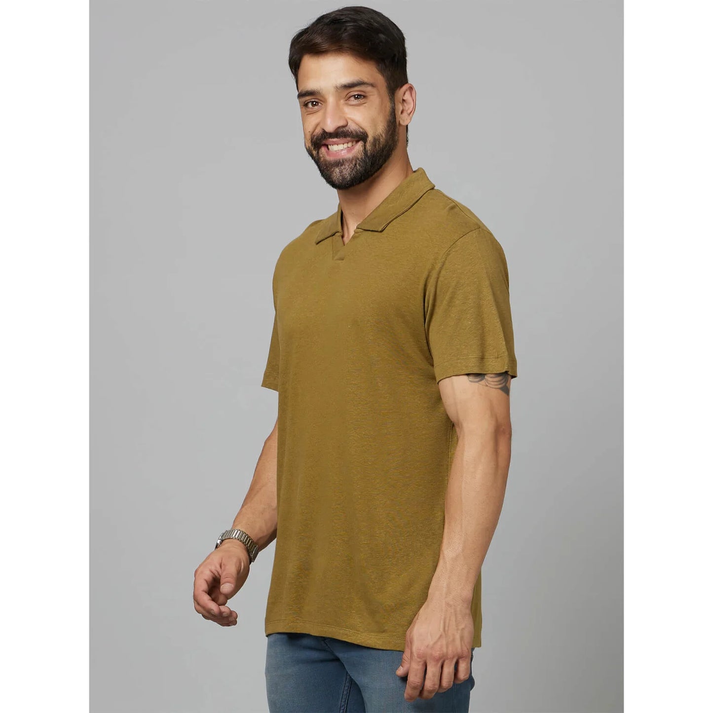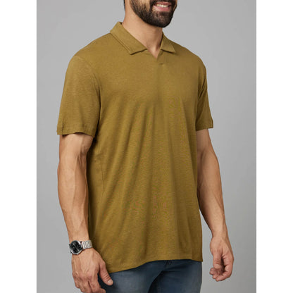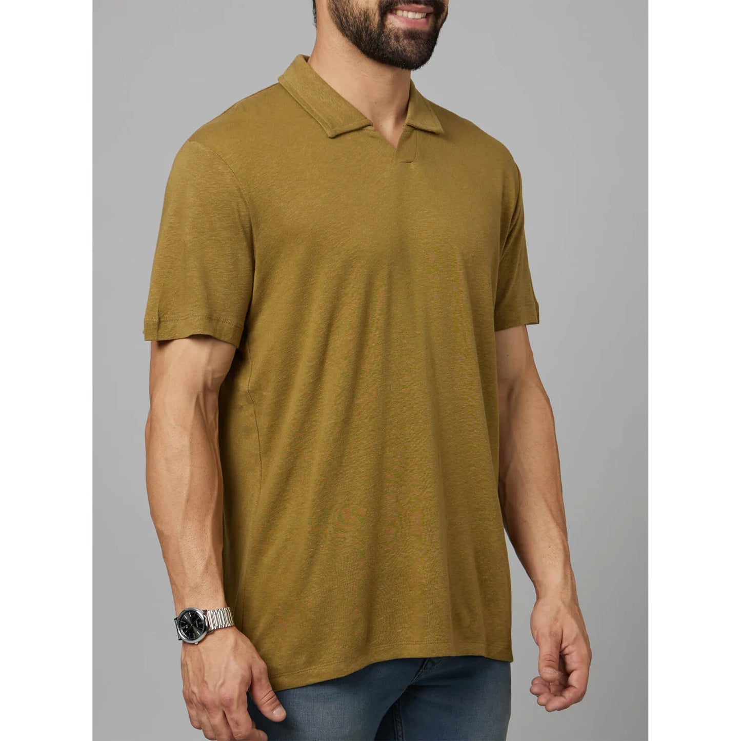 Elevate your casual style with the Celio Men's Khaki Linen Polo in Deolive Khaki. Made from a comfortable linen-blend, this half-sleeve shirt is perfect for any laid-back occasion. Disclaimer: All other items in the image are only for display purposes and will not be a part of the delivery content. Product colour may slightly vary due to photographic lighting sources. Country of Origin - India.
