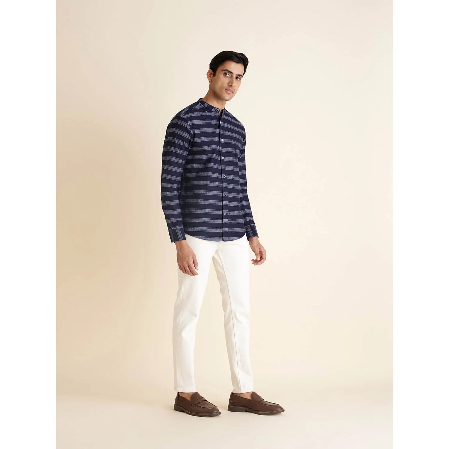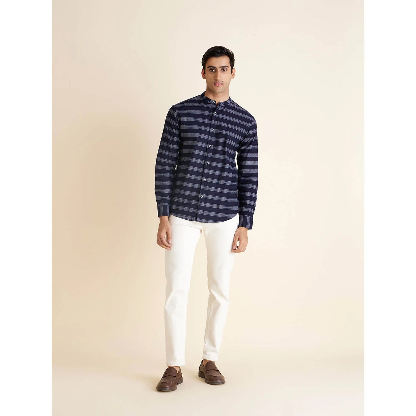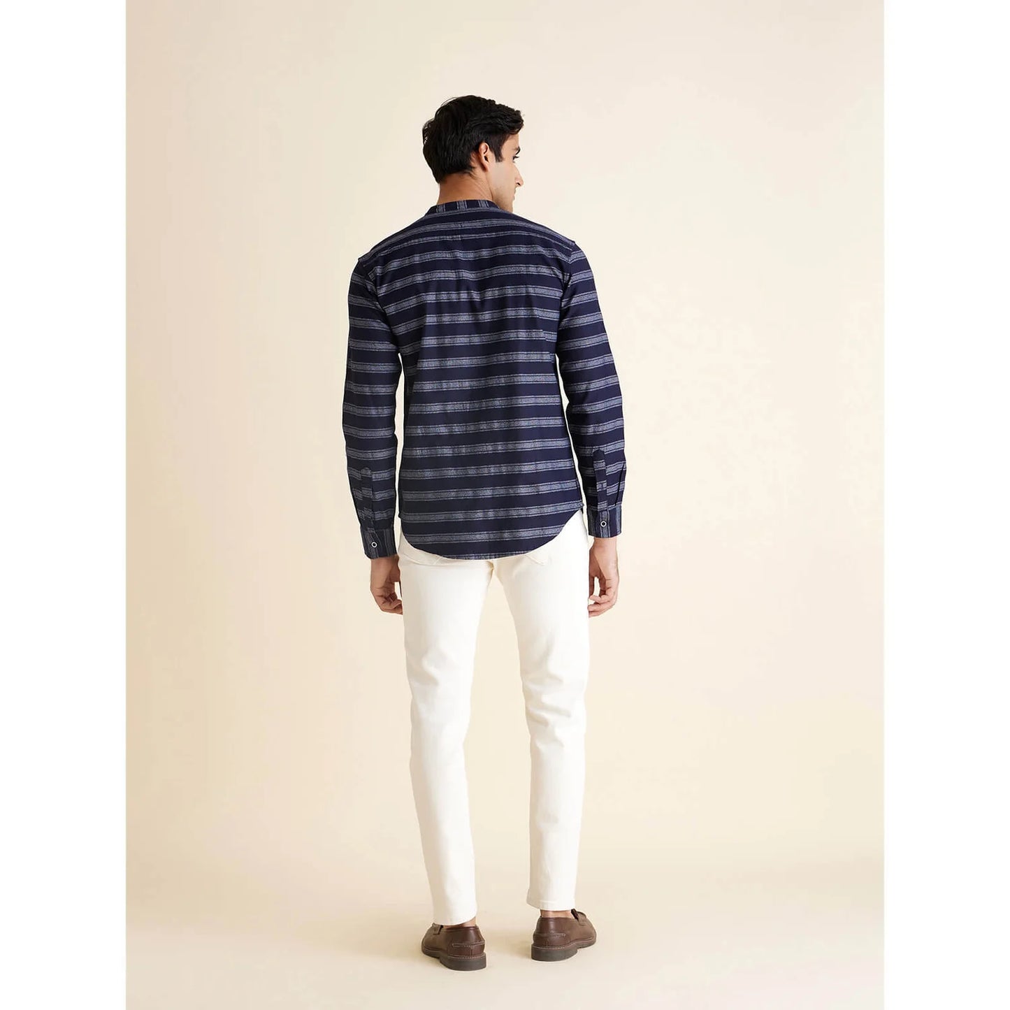 Elevate your casual wardrobe with the Celio Men's Navy Blue Stripes Shirt. Crafted from a comfortable cotton blend, this long-sleeve shirt is perfect for any casual occasion. Disclaimer: All other items in the image are only for display purposes and will not be a part of the delivery content. Product colour may slightly vary due to photographic lighting sources. Country of Origin - India.