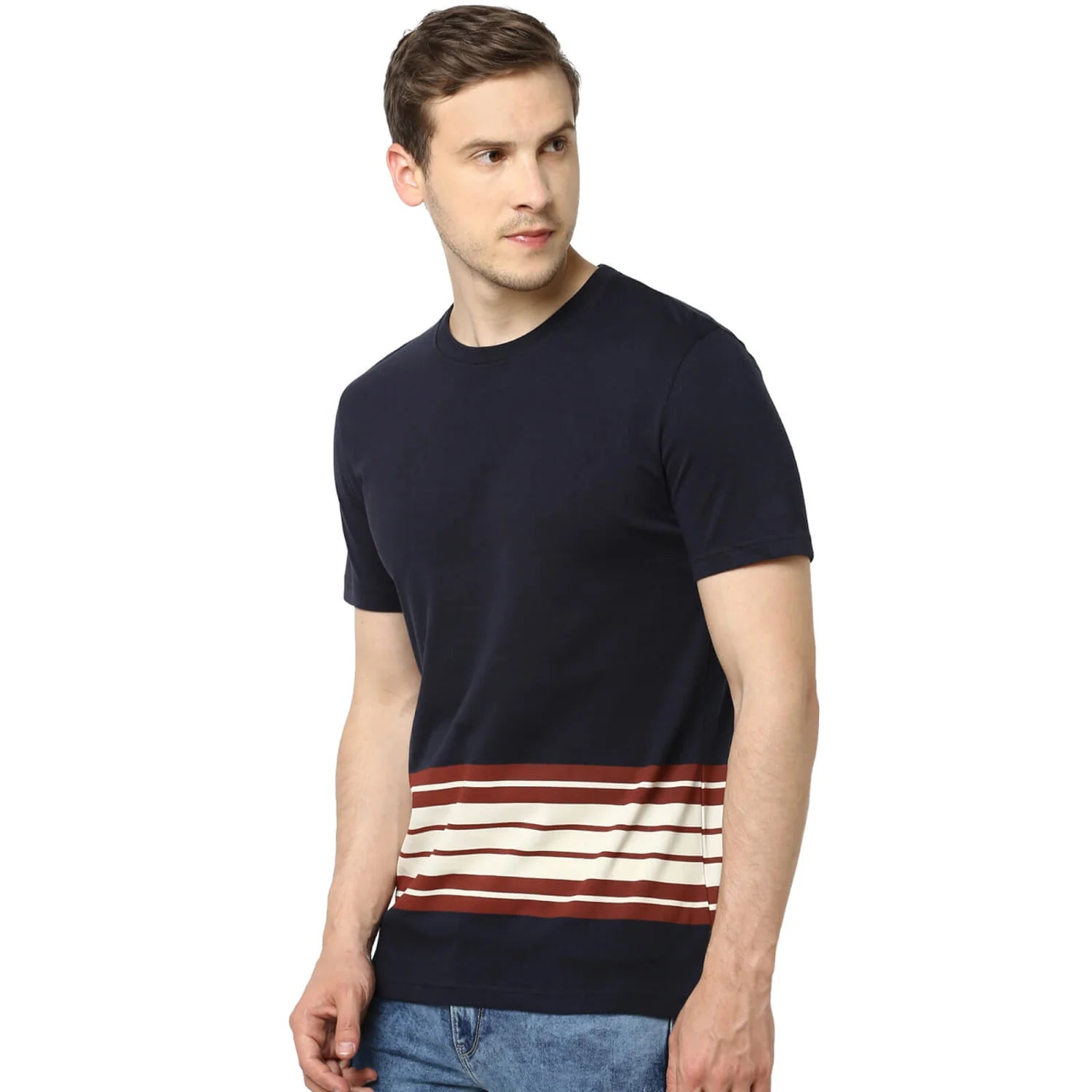 Elevate your casual wardrobe with the Celio Men's Navy Blue Colourblock T-Shirt. Crafted from soft cotton, this stylish tee features short sleeves, perfect for relaxed outings. Disclaimer: All other items in the image are only for display purposes and will not be a part of the delivery content. Product colour may slightly vary due to photographic lighting sources. Country of Origin - India.