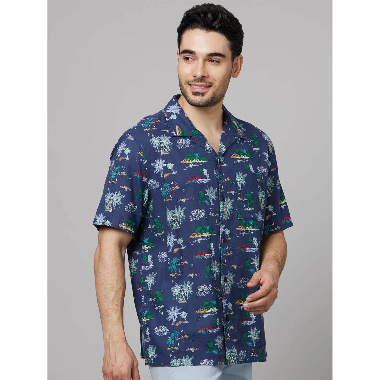 Celio* Conversational Regular Fit Cotton-Linen-Blend Navy Blue Shirt