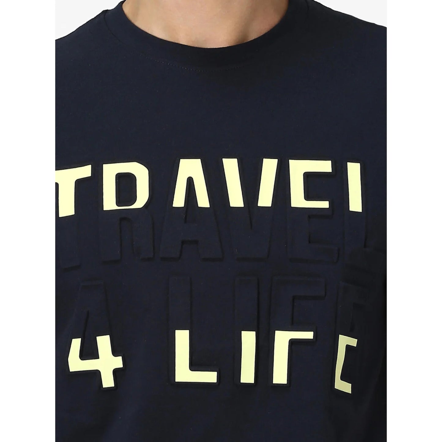 Shop the Celio Men's Navy Blue Printed T-Shirt, crafted from comfortable cotton. This casual tee features a regular fit, short sleeves, and a stylish Retravel Navy print, perfect for everyday wear. Disclaimer: All other items in the image are only for display purposes and will not be a part of the delivery content. Product colour may slightly vary due to photographic lighting sources. Country of Origin - India.