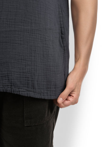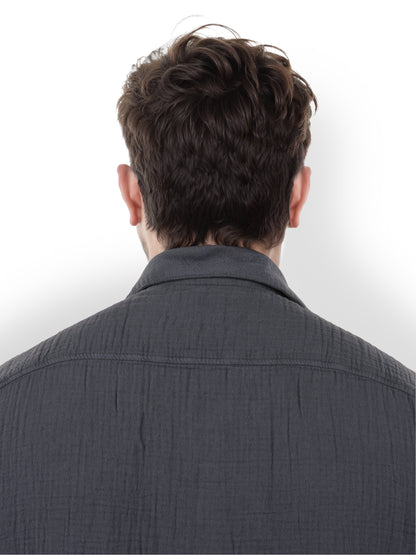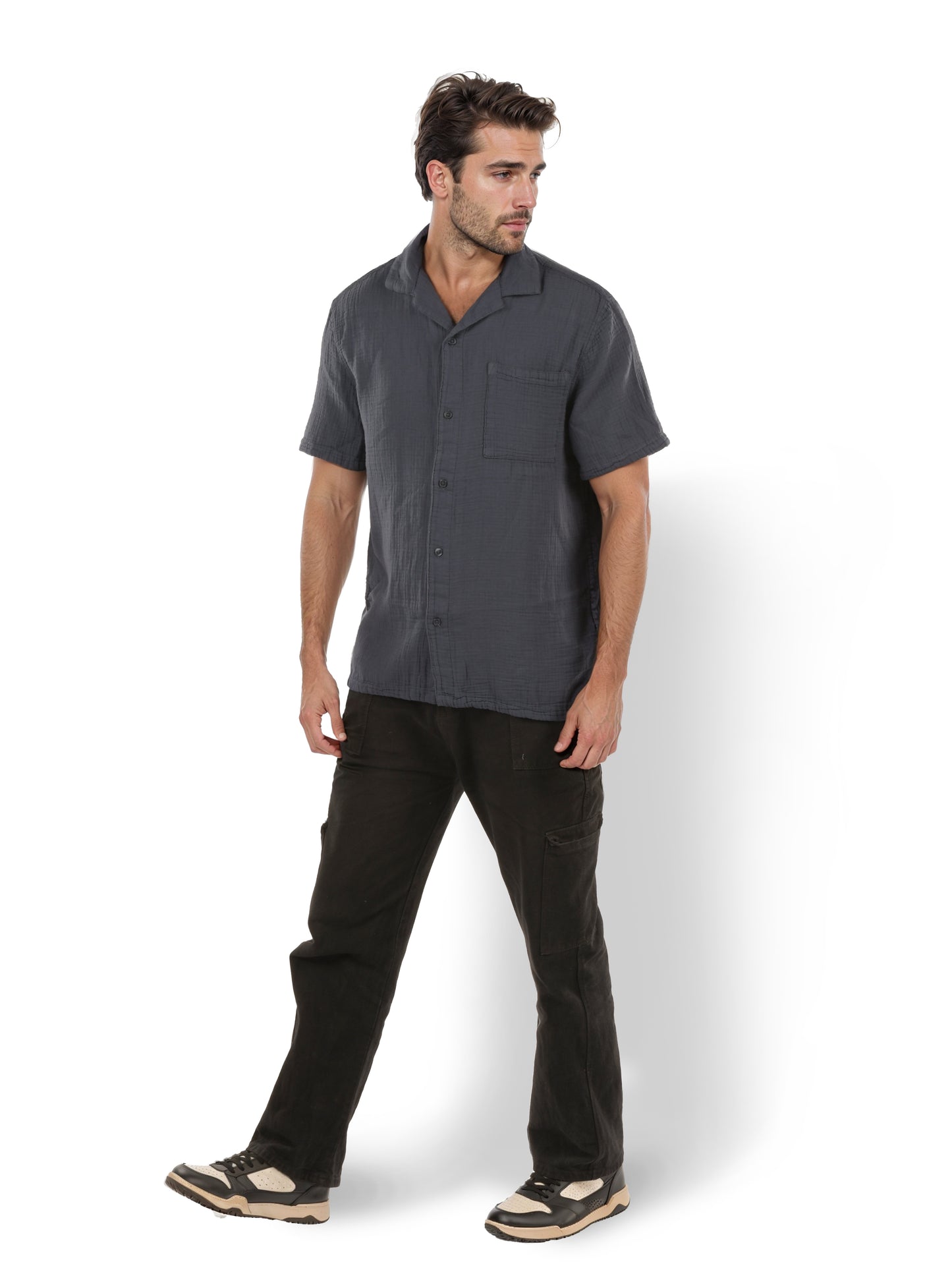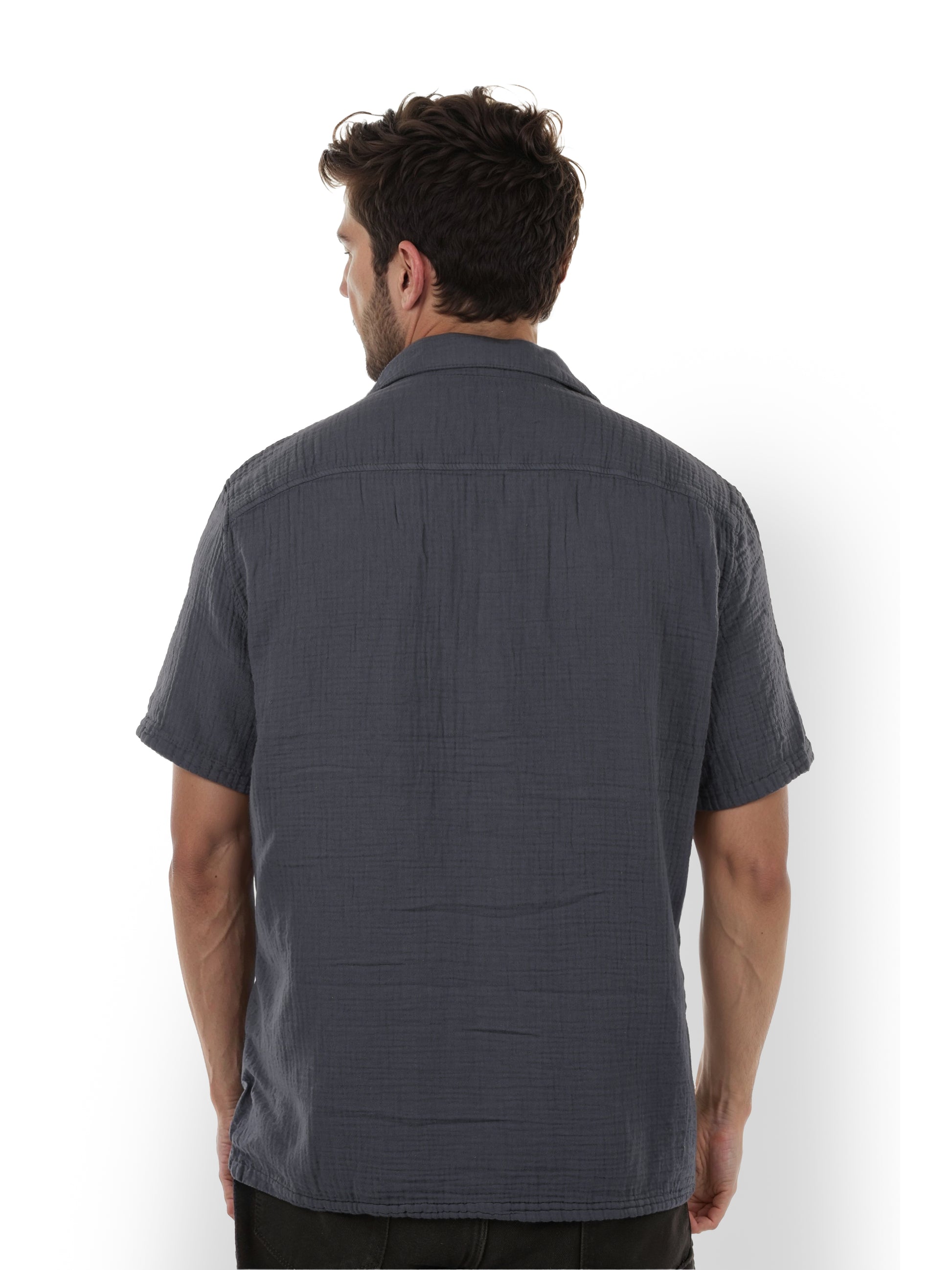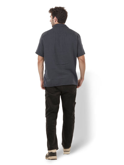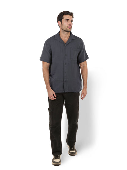 Men's navy blue Cuban collar shirt by Celio, crafted from comfortable cotton. Perfect for casual occasions with regular fit and short sleeves. Disclaimer: All other items in the image are only for display purposes and will not be a part of the delivery content. Product colour may slightly vary due to photographic lighting sources. Country of Origin - India.