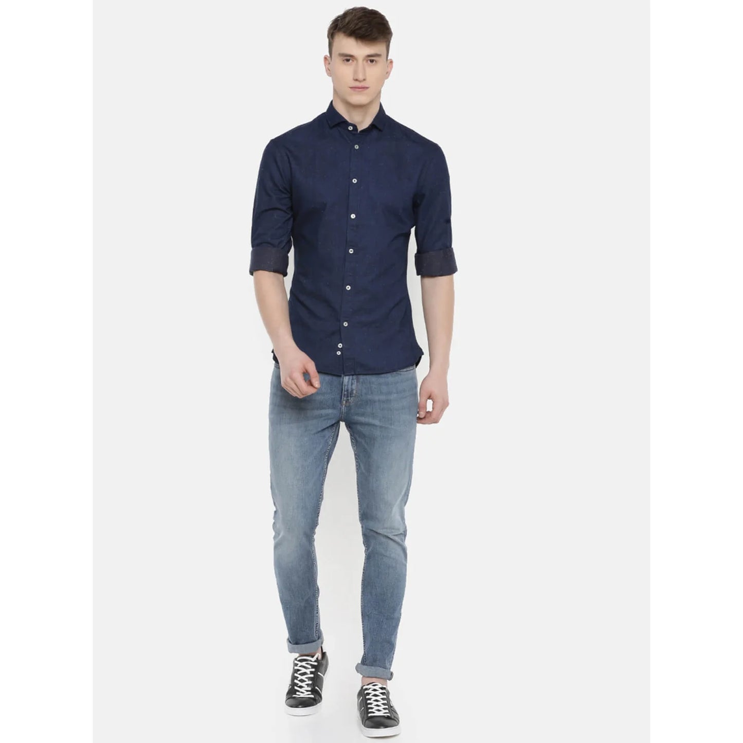 Elevate your casual wardrobe with the Celio Men's Navy Blue Solid Casual Shirt. Crafted from comfortable cotton, it features long sleeves and is perfect for any casual occasion. Disclaimer: All other items in the image are only for display purposes and will not be a part of the delivery content. Product colour may slightly vary due to photographic lighting sources. Country of Origin - India.
