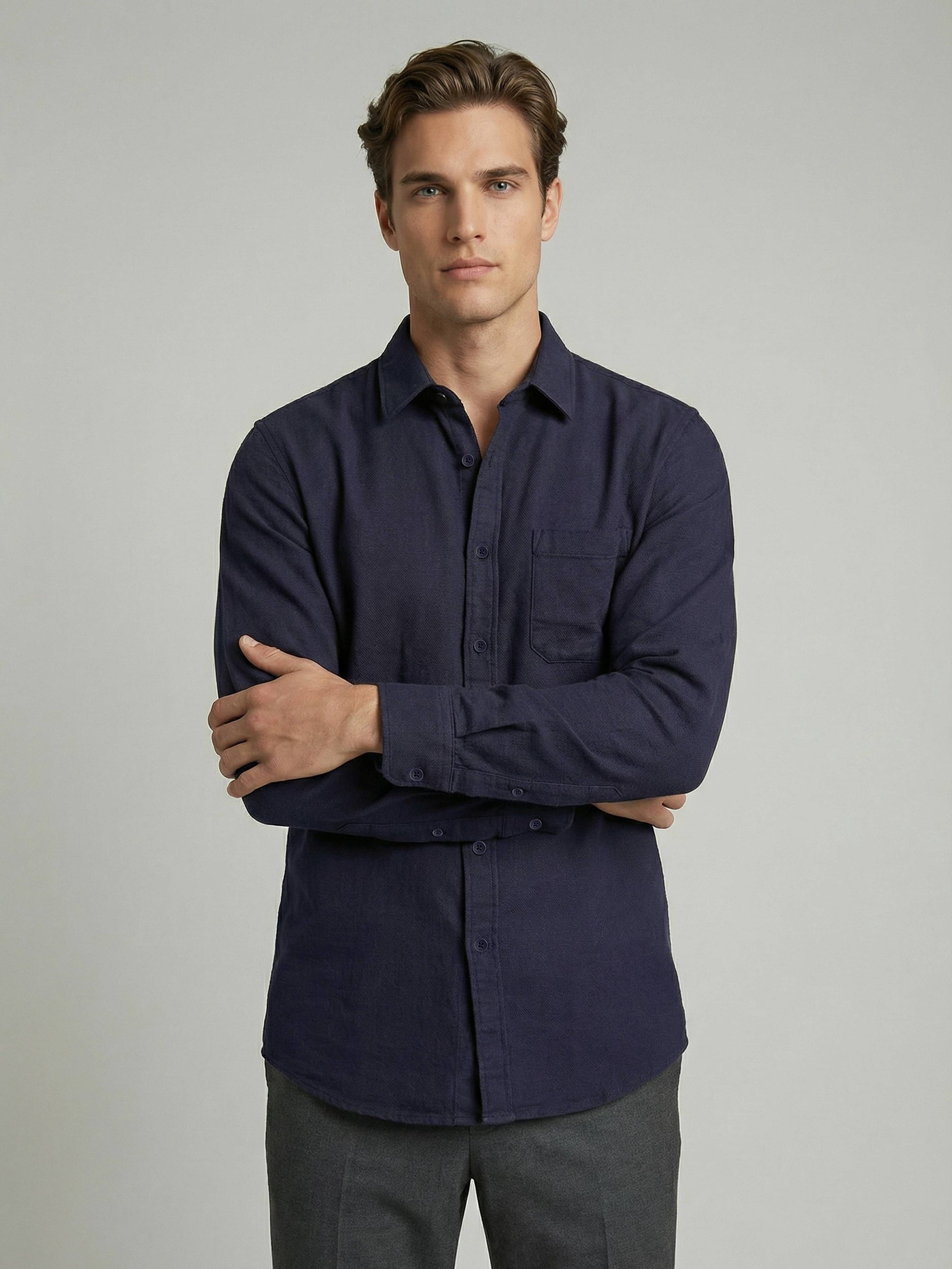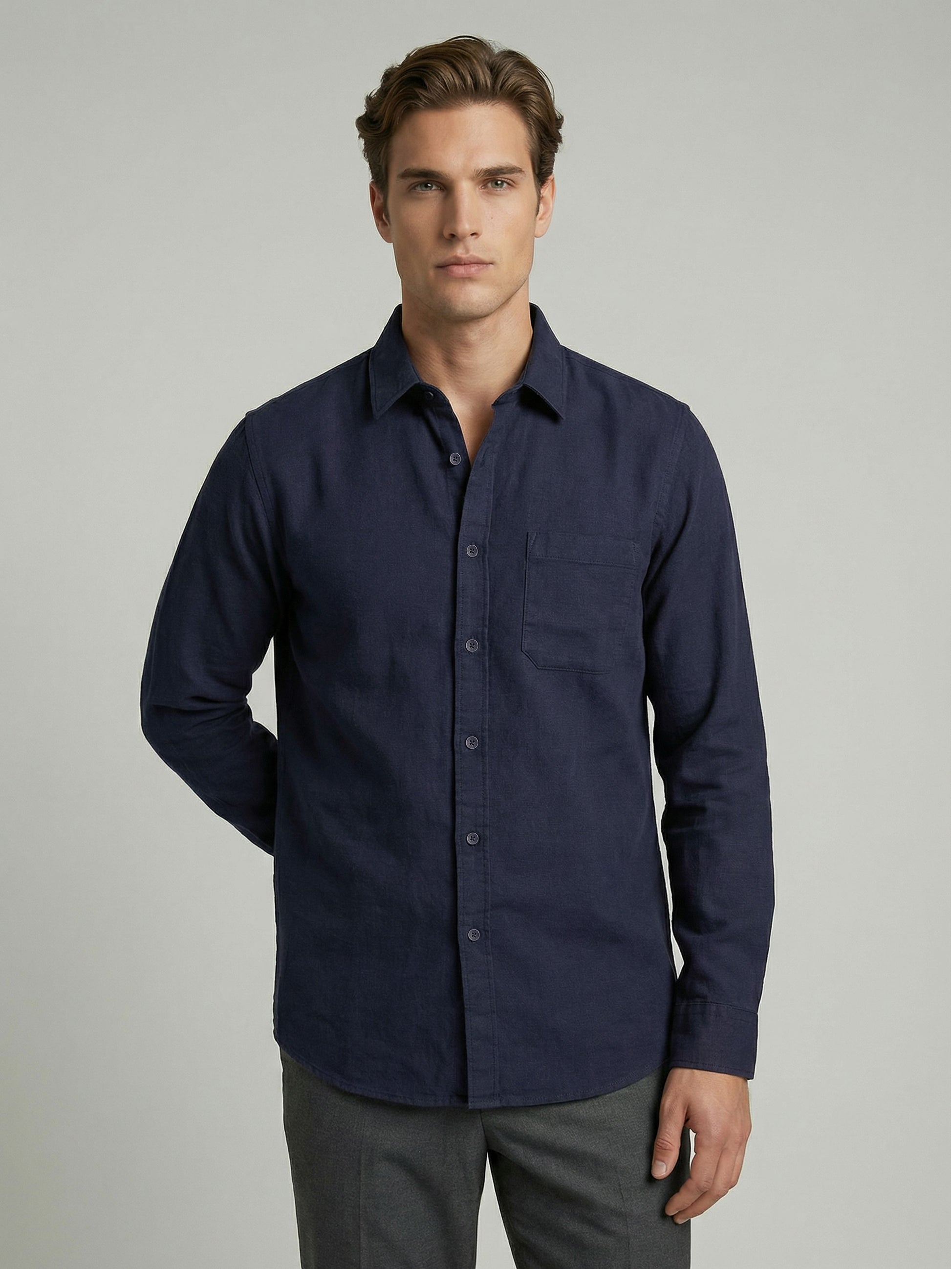 Elevate your casual style with the Celio Men Navy Blue Solid Regular Cotton Shirt. Crafted from breathable cotton, it features long sleeves for a comfortable fit. Disclaimer: All other items in the image are only for display purposes and will not be a part of the delivery content. Product colour may slightly vary due to photographic lighting sources. Country of Origin - India.