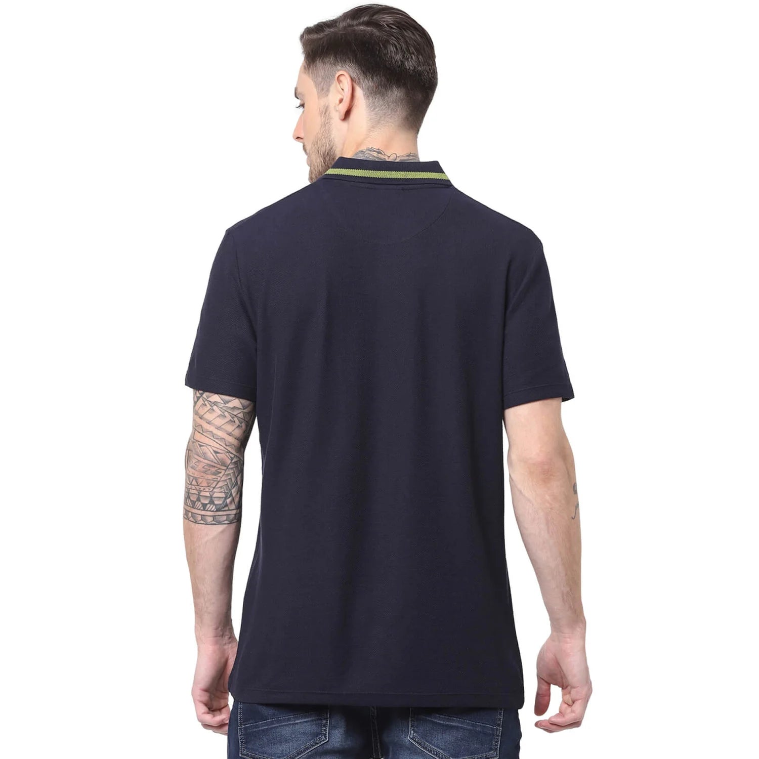 Upgrade your casual wardrobe with the Celio Men's Navy Blue Polo Neck T-Shirt. Made from soft cotton, it features short sleeves, perfect for everyday wear. Disclaimer: All other items in the image are only for display purposes and will not be a part of the delivery content. Product colour may slightly vary due to photographic lighting sources. Country of Origin - India.