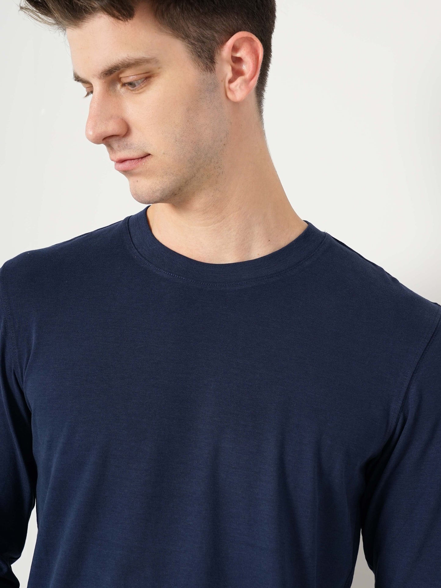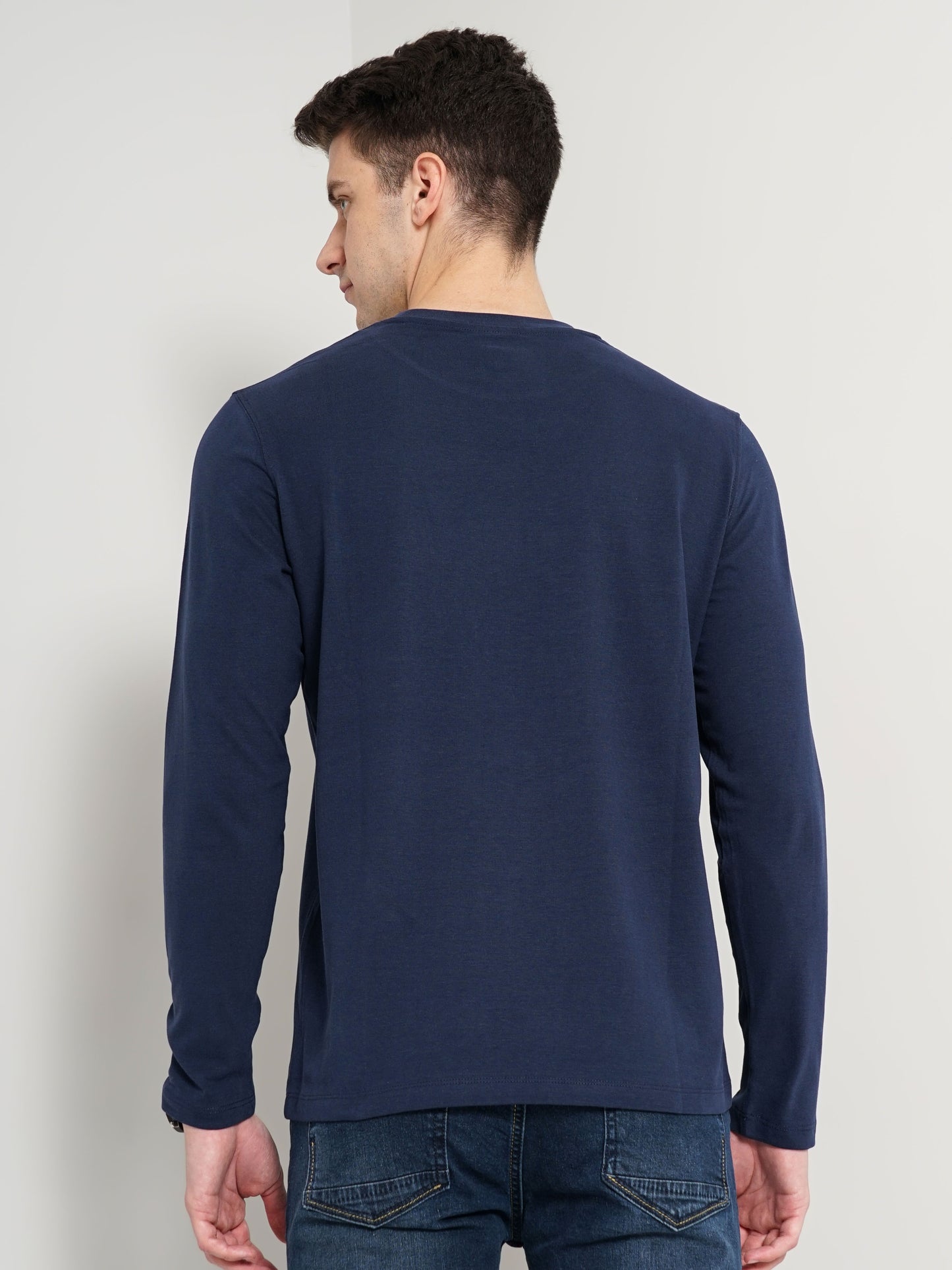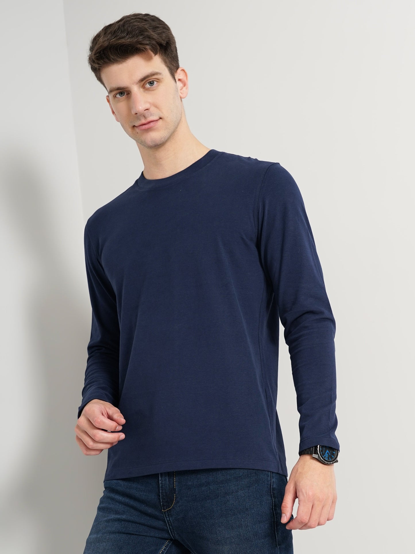 Discover comfort with the Celio Men's Navy Blue Solid Regular Fit T-shirt, crafted from pure cotton. Ideal for casual outings, it features long sleeves for a stylish look. Disclaimer: All other items in the image are only for display purposes and will not be a part of the delivery content. Product colour may slightly vary due to photographic lighting sources. Country of Origin - India.