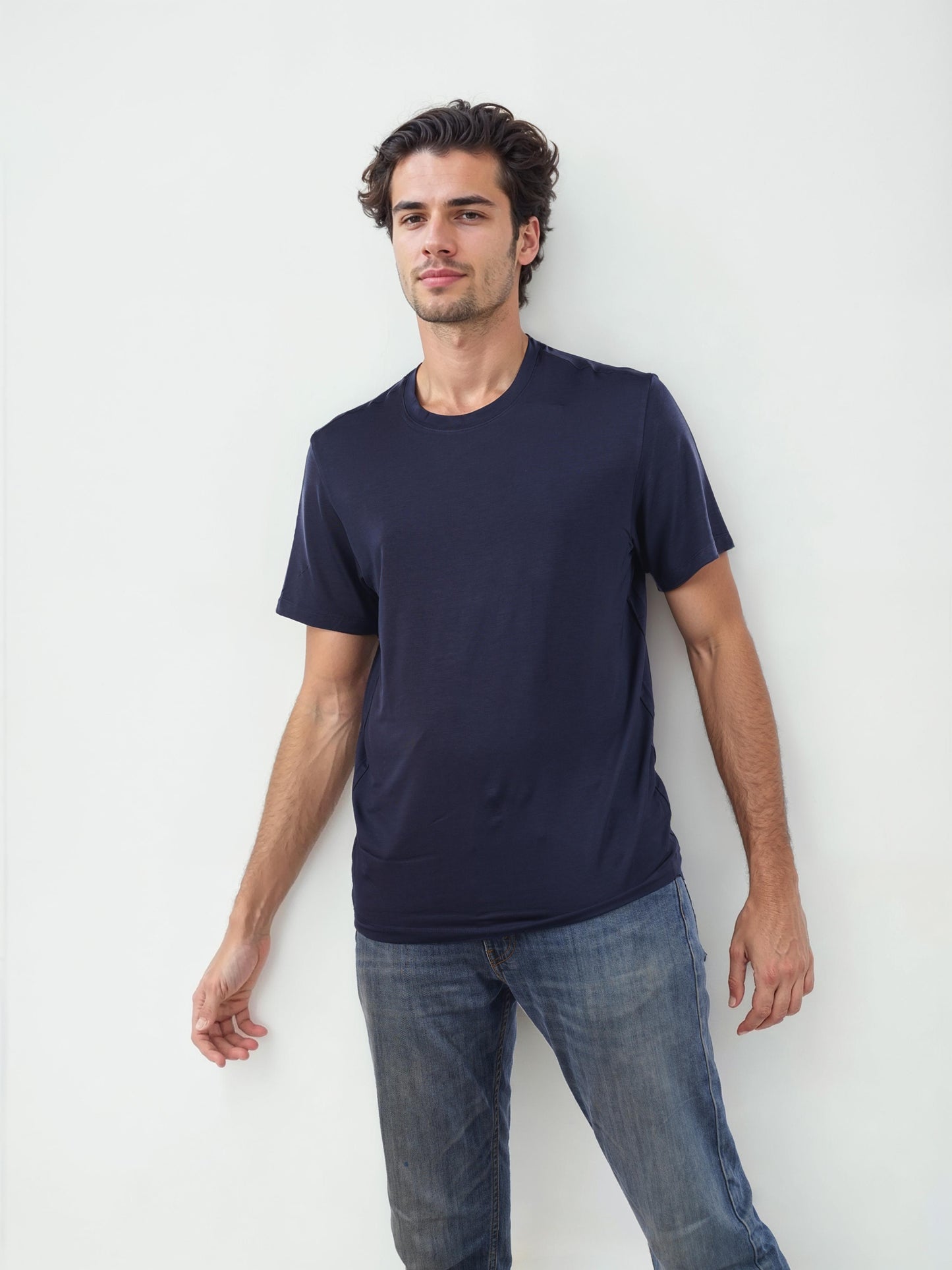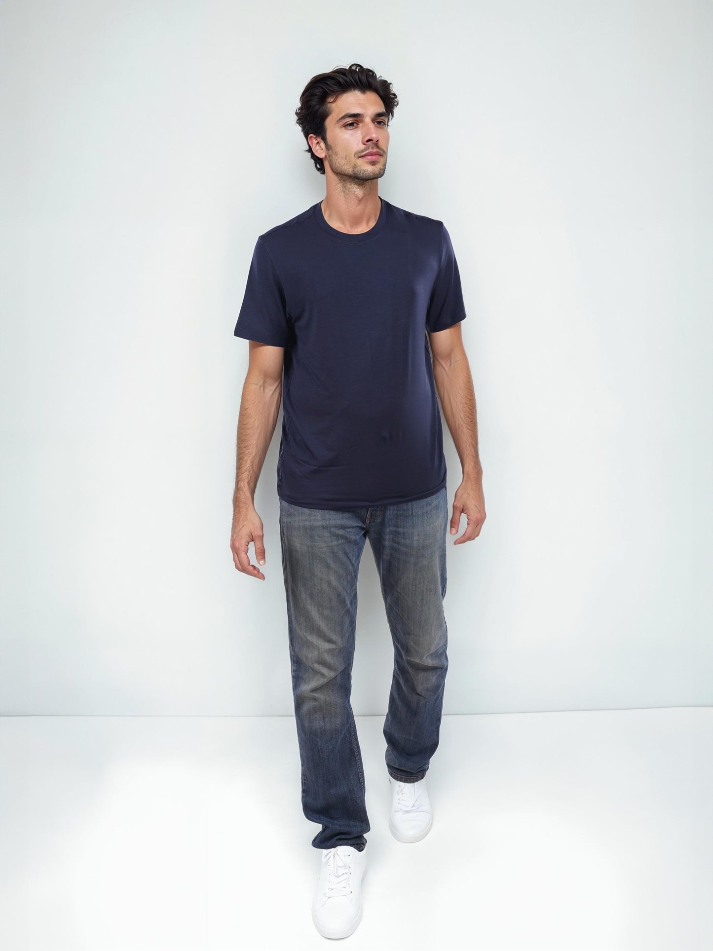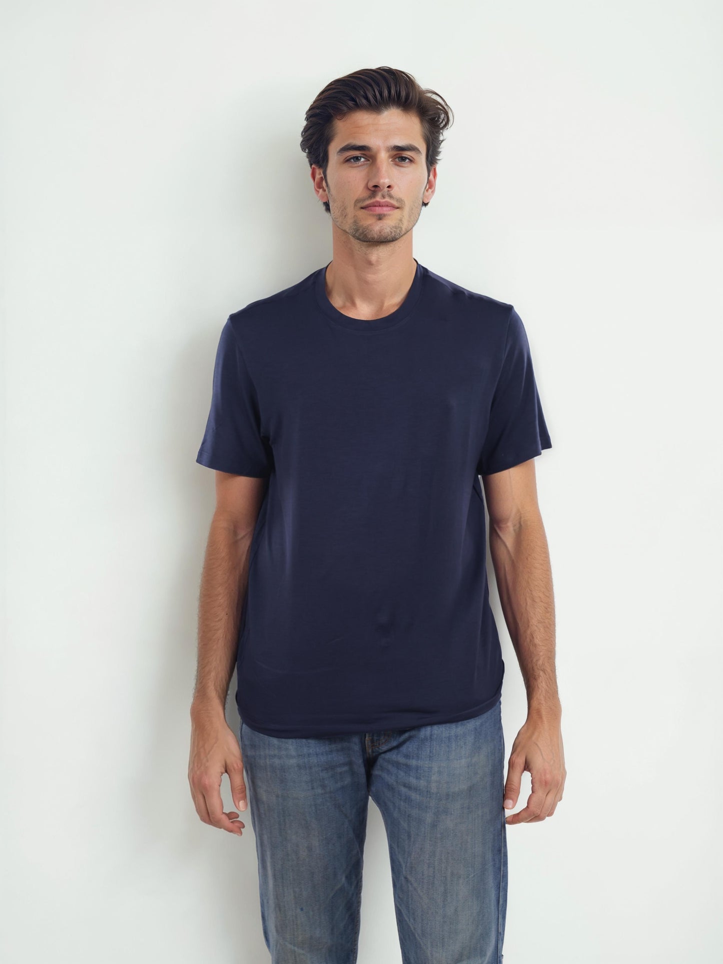 Elevate your casual wardrobe with the Celio Men’s Navy Blue Round Neck T-shirt. Crafted from soft cotton, it features short sleeves for comfort and a regular fit. Disclaimer: All other items in the image are only for display purposes and will not be a part of the delivery content. Product colour may slightly vary due to photographic lighting sources. Country of Origin - India.