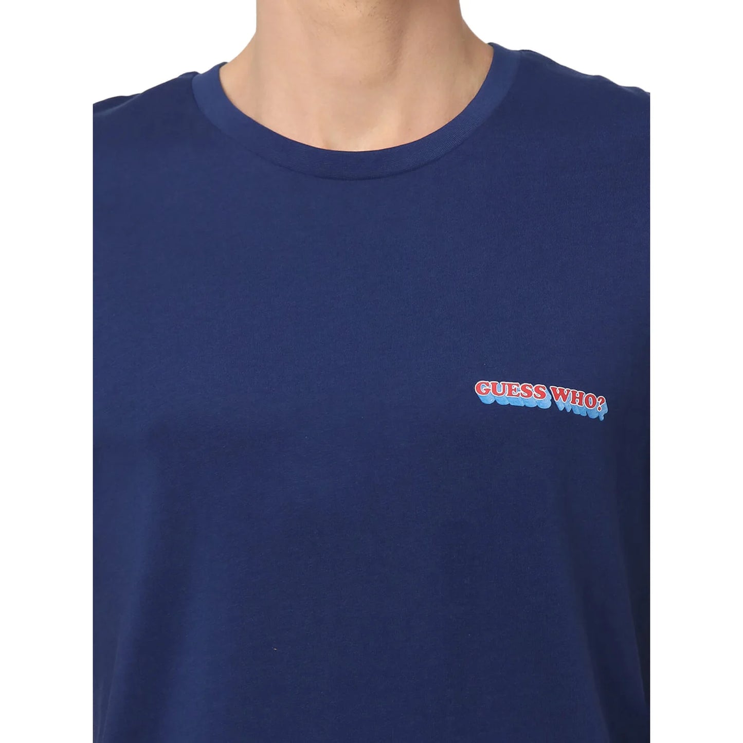 The Celio Men's Guess Who-Navy T-Shirt in navy blue is perfect for casual occasions. Made of soft cotton, it features short sleeves for a comfortable fit. Disclaimer: All other items in the image are only for display purposes and will not be a part of the delivery content. Product colour may slightly vary due to photographic lighting sources. Country of Origin - India.