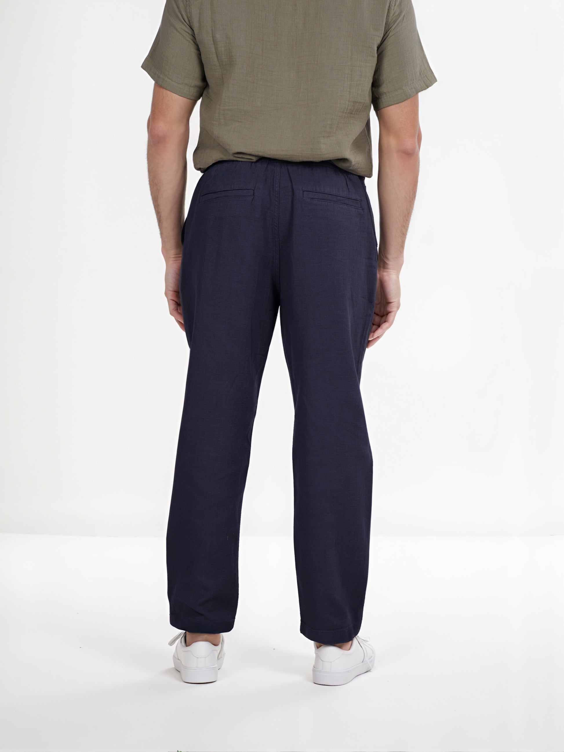 Elevate your casual wardrobe with Celio's navy blue cotton trousers. Featuring a relaxed fit, these stylish pants are perfect for everyday wear. Disclaimer: All other items in the image are only for display purposes and will not be a part of the delivery content. Product colour may slightly vary due to photographic lighting sources. Country of Origin - India.
