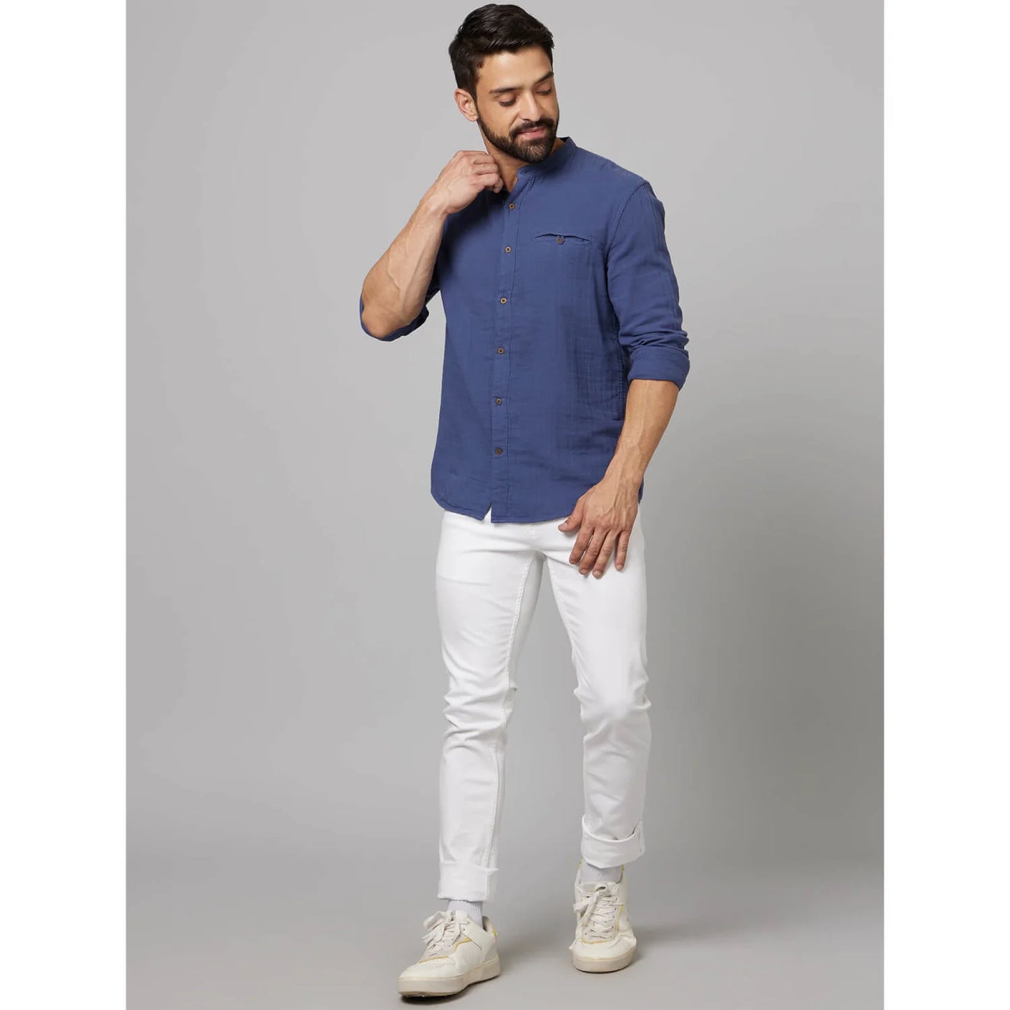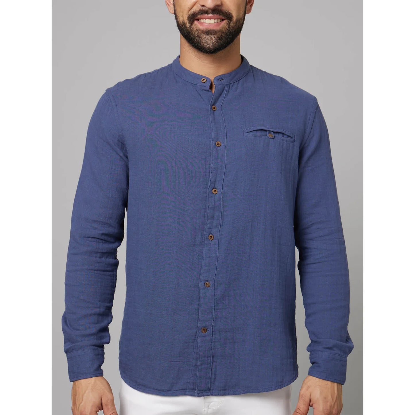 Elevate your casual wardrobe with the Celio Men's Navy Blue Double Cloth Shirt. Crafted from soft cotton, this stylish long-sleeve shirt perfects your laid-back look. Disclaimer: All other items in the image are only for display purposes and will not be a part of the delivery content. Product colour may slightly vary due to photographic lighting sources. Country of Origin - India.