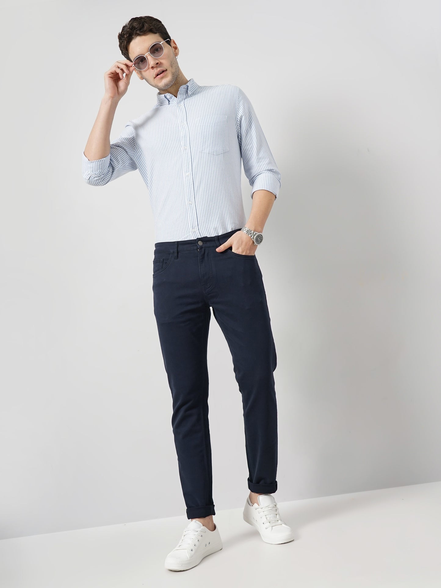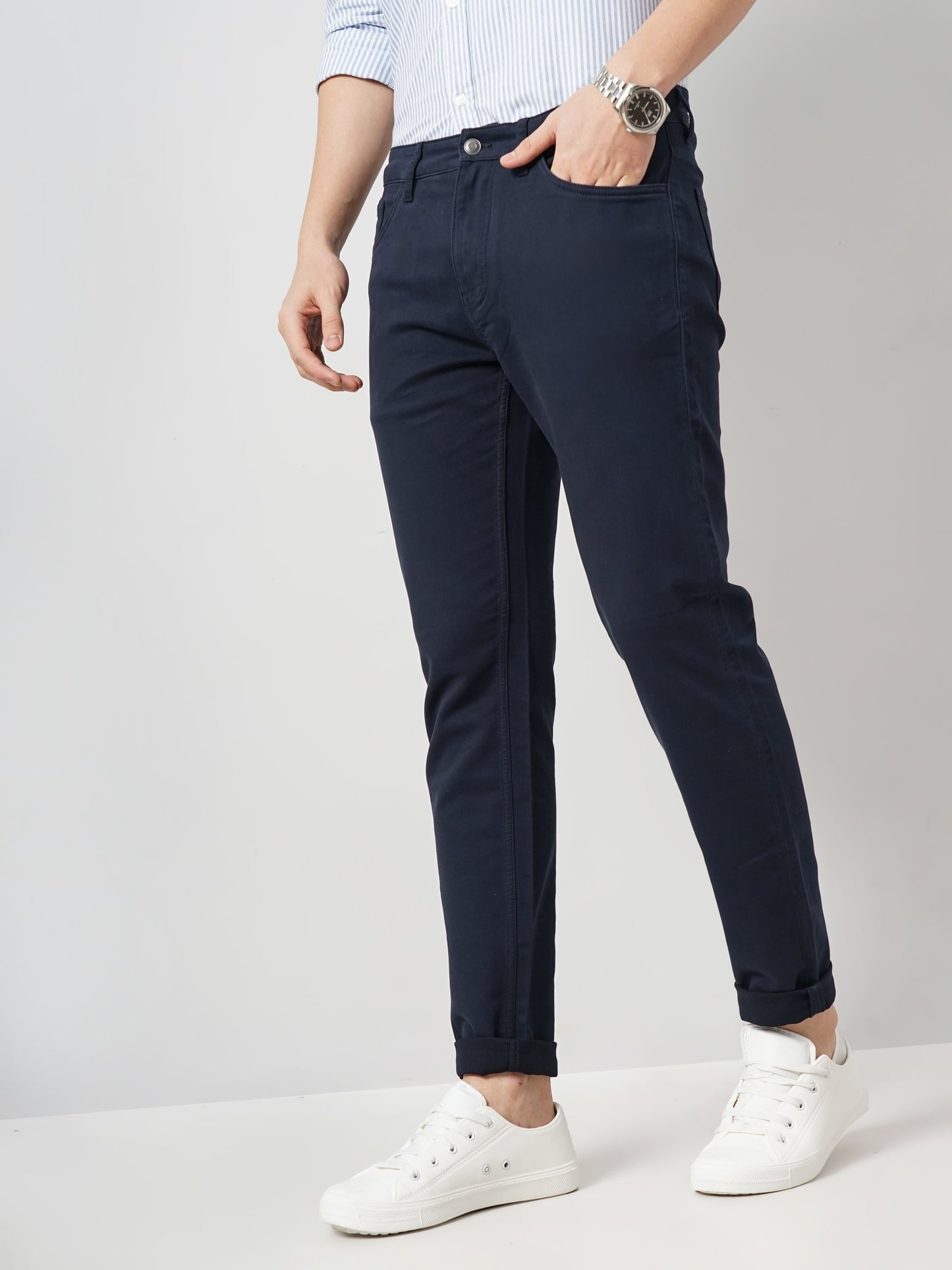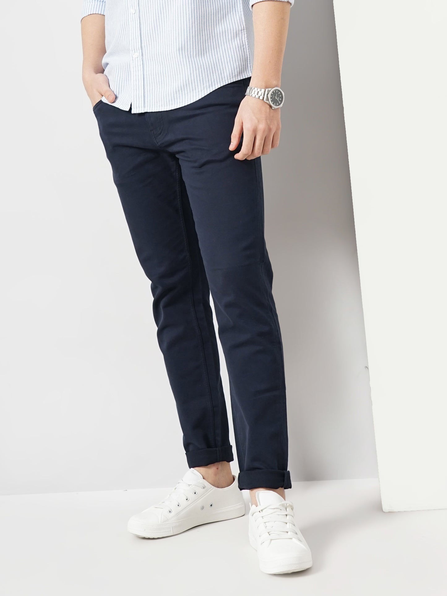 Shop the Men Solid Slim Fit Dobby Cotton Pants in Navy Blue by Celio. Perfect for casual occasions, these comfortable Trouser combine style and versatility. Disclaimer: All other items in the image are only for display purposes and will not be a part of the delivery content. Product colour may slightly vary due to photographic lighting sources. Country of Origin - India.