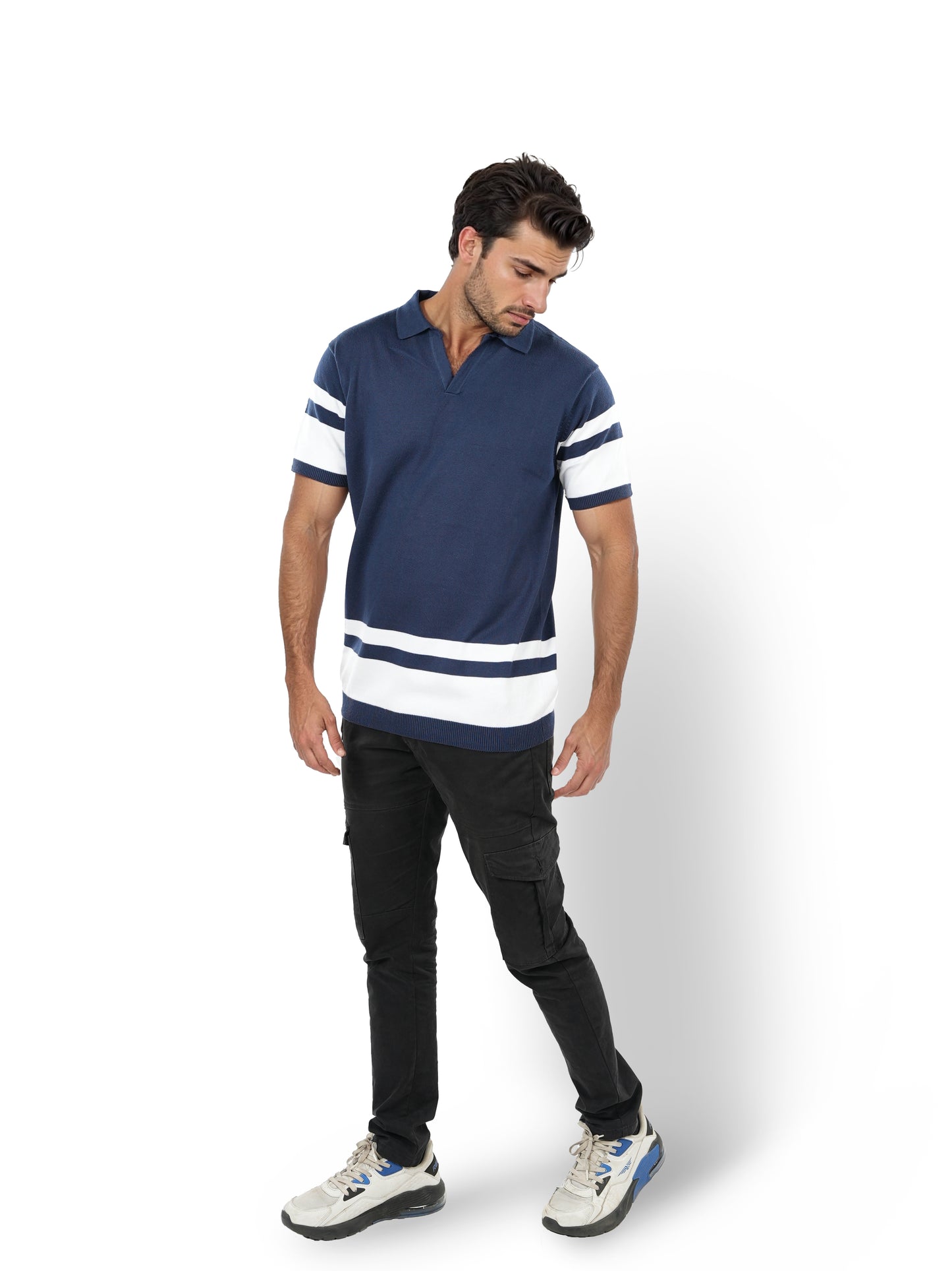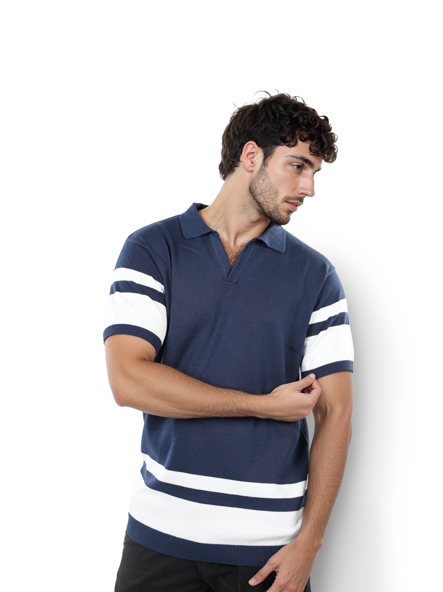 Shop the Celio Men's navy blue Polo Collar Striped T-Shirt, made from breathable cotton. Ideal for casual outings, featuring a regular fit and short sleeves for comfort. Disclaimer: All other items in the image are only for display purposes and will not be a part of the delivery content. Product colour may slightly vary due to photographic lighting sources. Country of Origin - India.