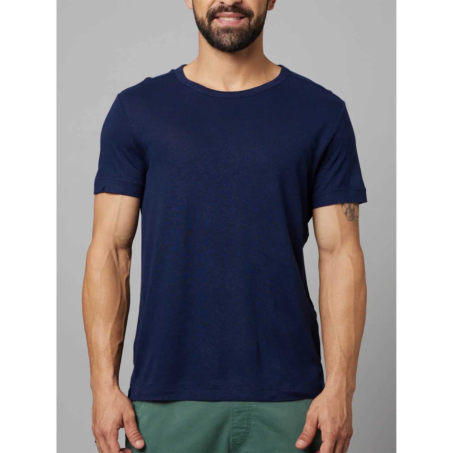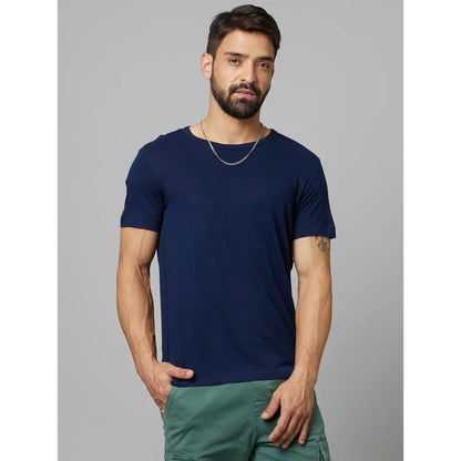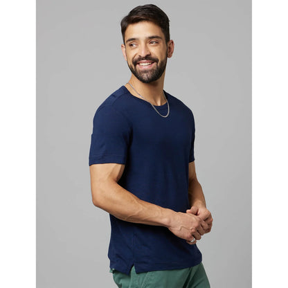 Celio* Solid Regular Fit Linen-Blend Navy Blue T-Shirt