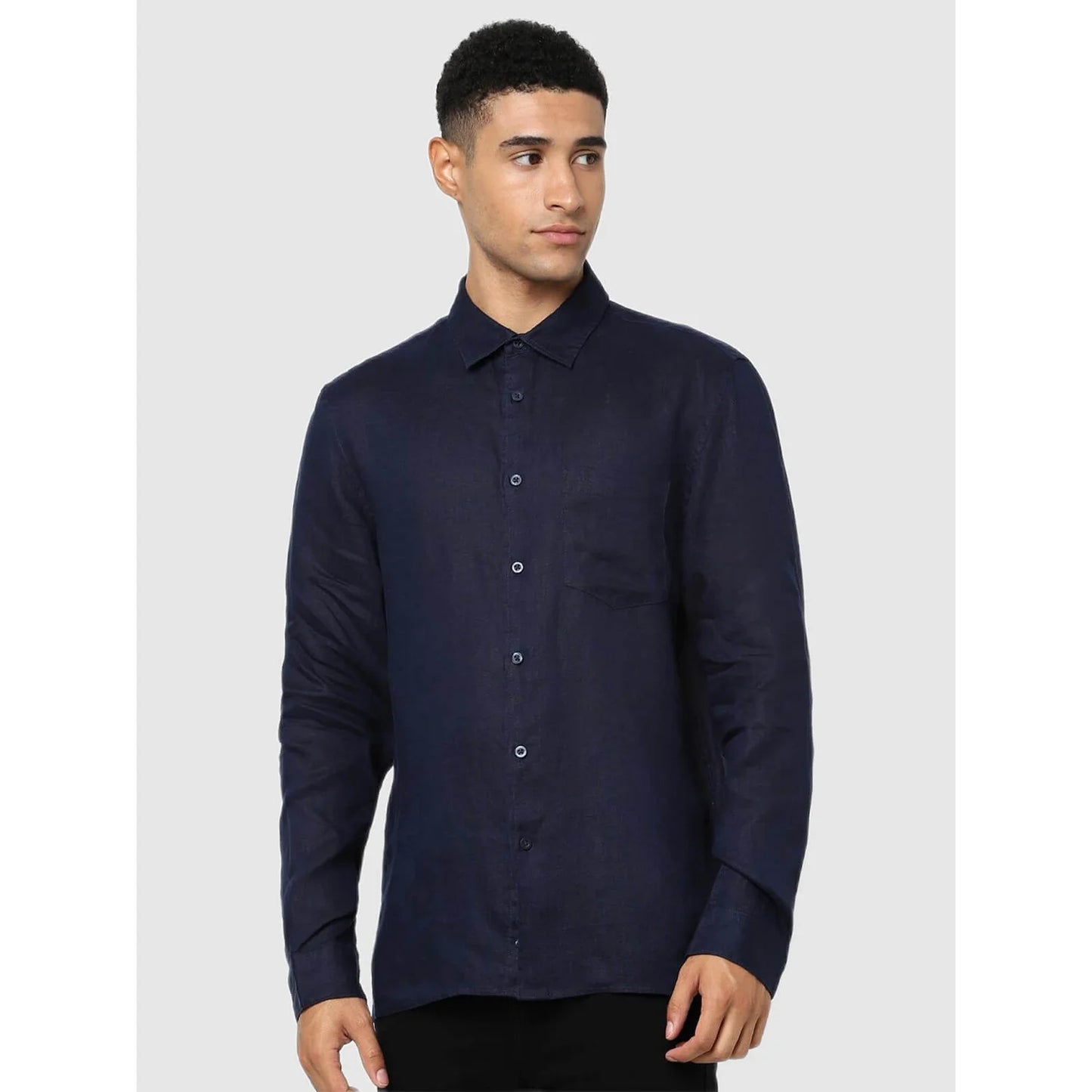 Discover the Celio Navy Blue Solid Regular Fit Shirt for men, made from breathable linen. Ideal for casual occasions, it features long sleeves for a stylish, comfortable look. Disclaimer: All other items in the image are only for display purposes and will not be a part of the delivery content. Product colour may slightly vary due to photographic lighting sources. Country of Origin - India.