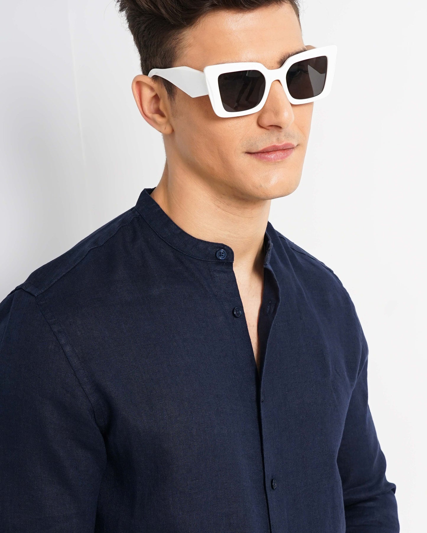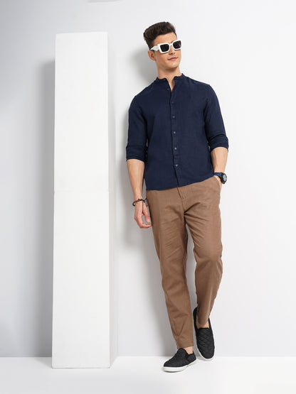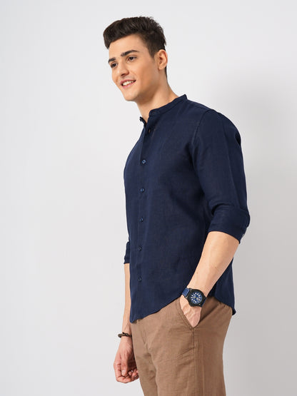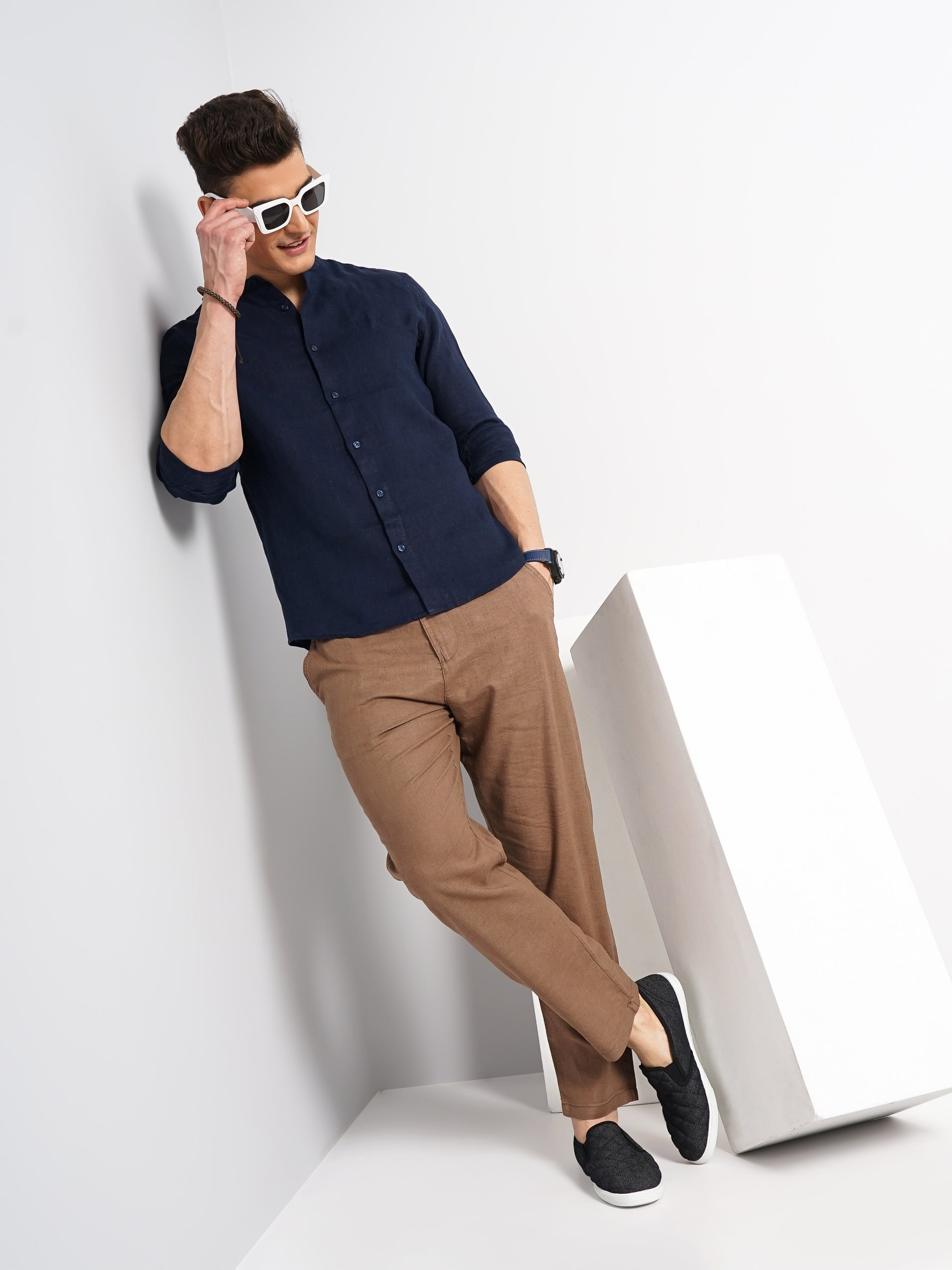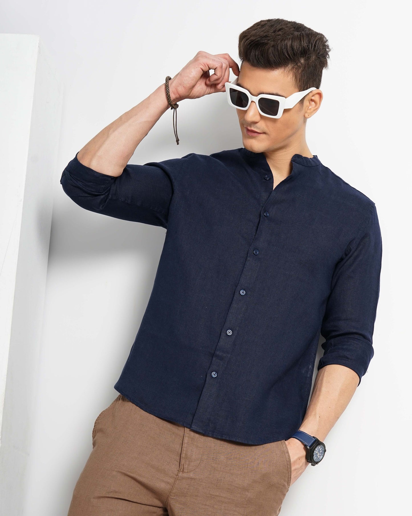 Elevate your casual wardrobe with the Celio Men Navy Blue Linen Shirt. Featuring a stylish mandarin collar and long sleeves, this regular fit shirt keeps you comfortable and trendy. Disclaimer: All other items in the image are only for display purposes and will not be a part of the delivery content. Product colour may slightly vary due to photographic lighting sources. Country of Origin - India. DAMAOLIN