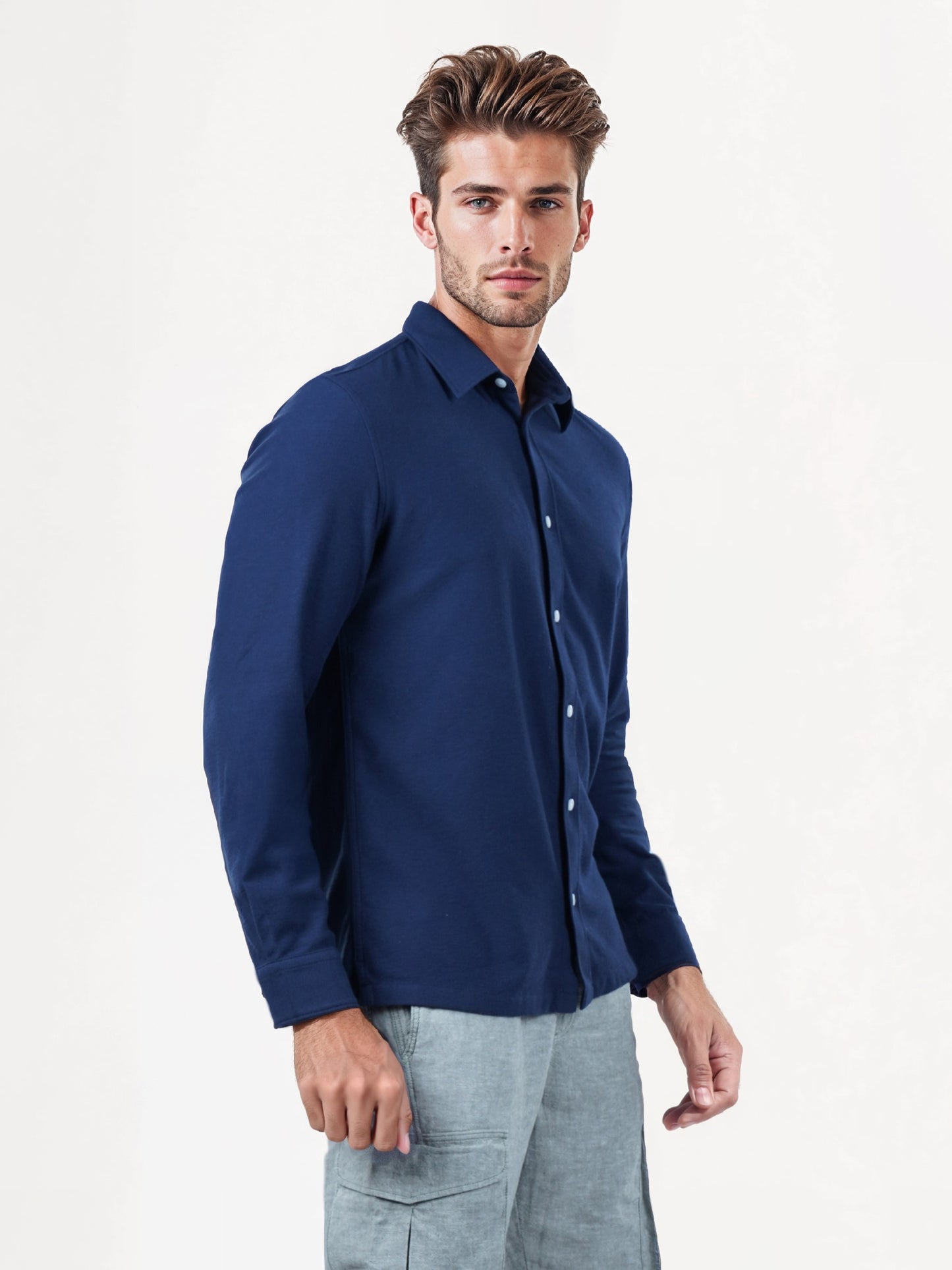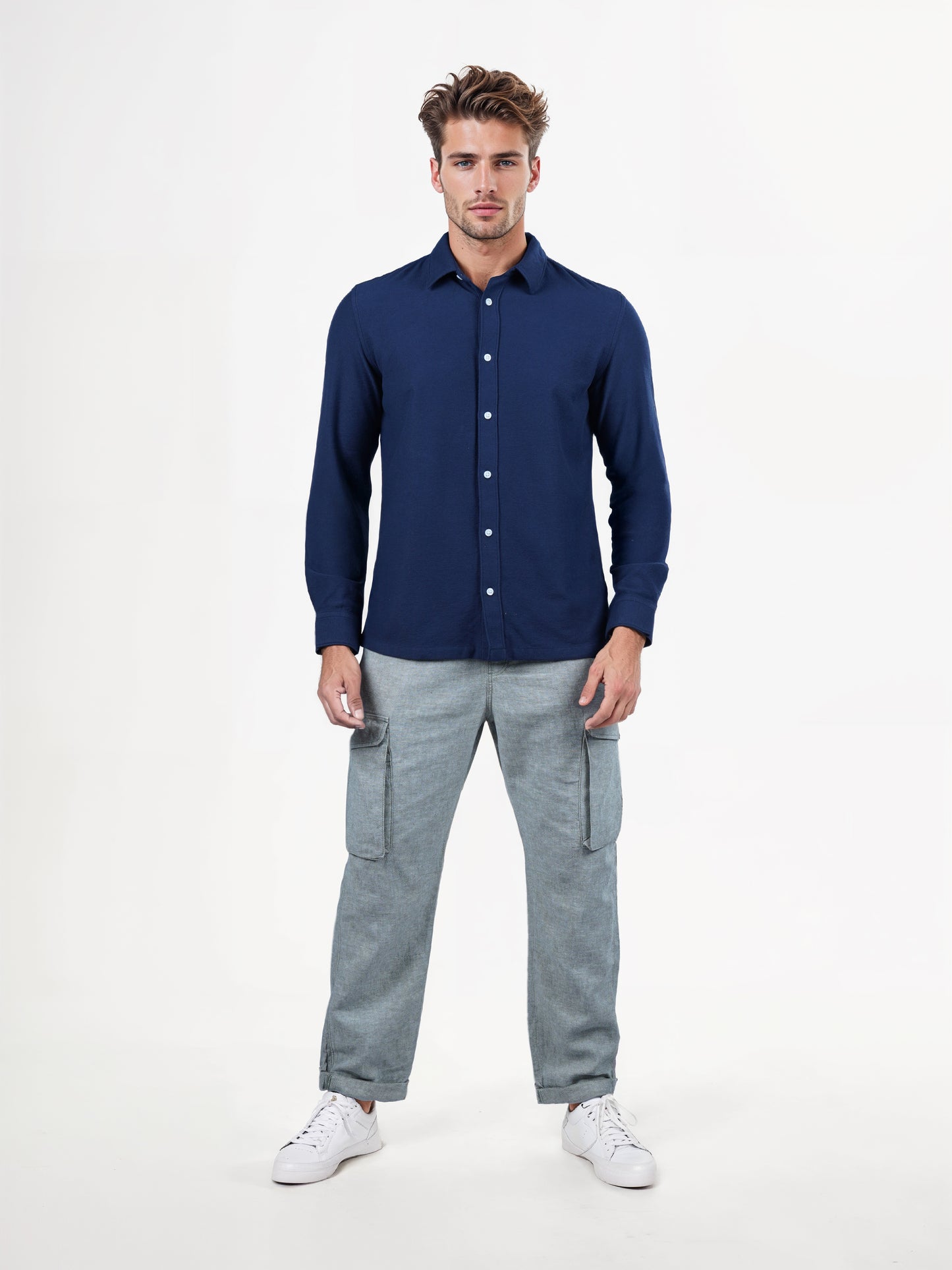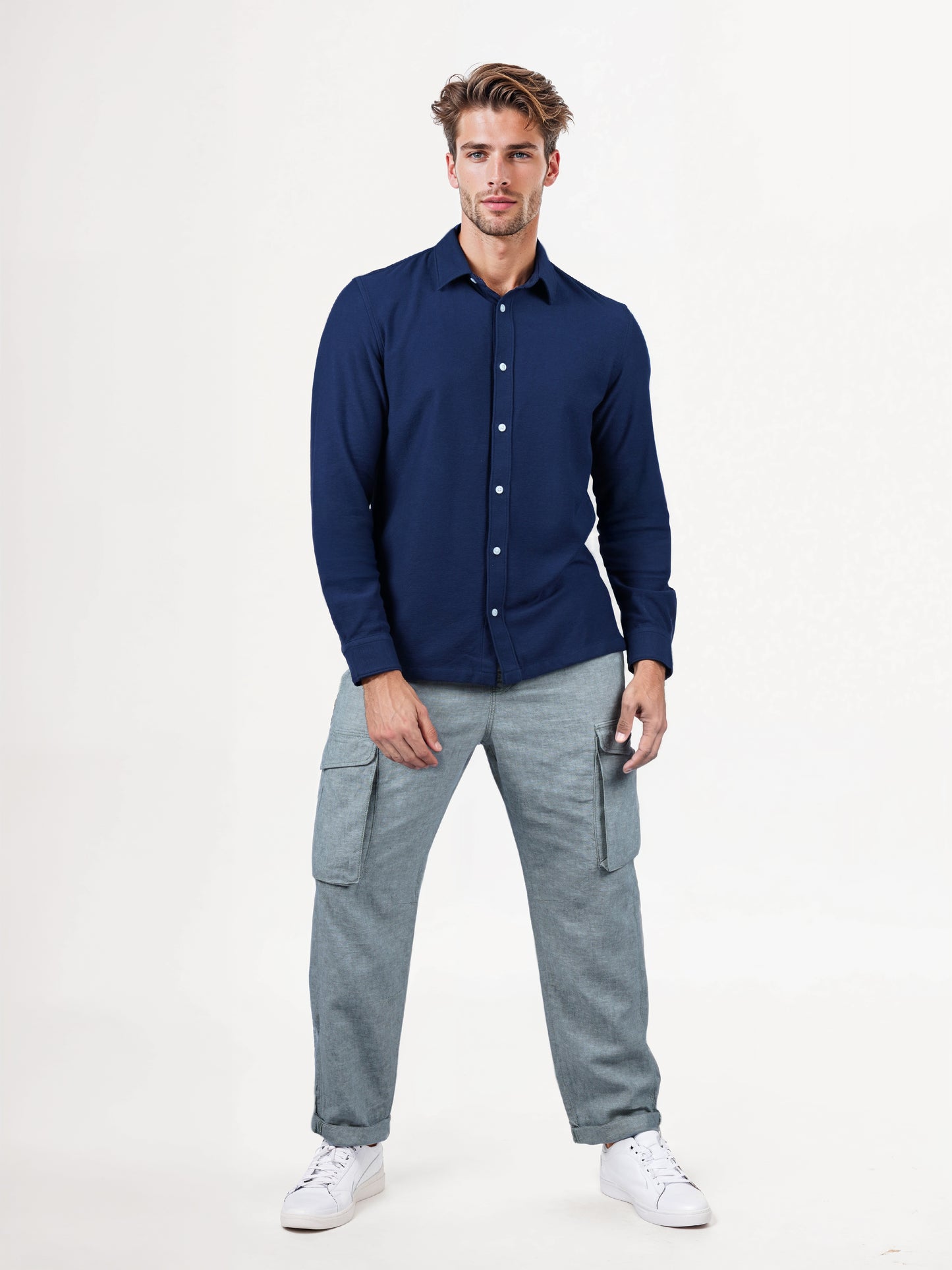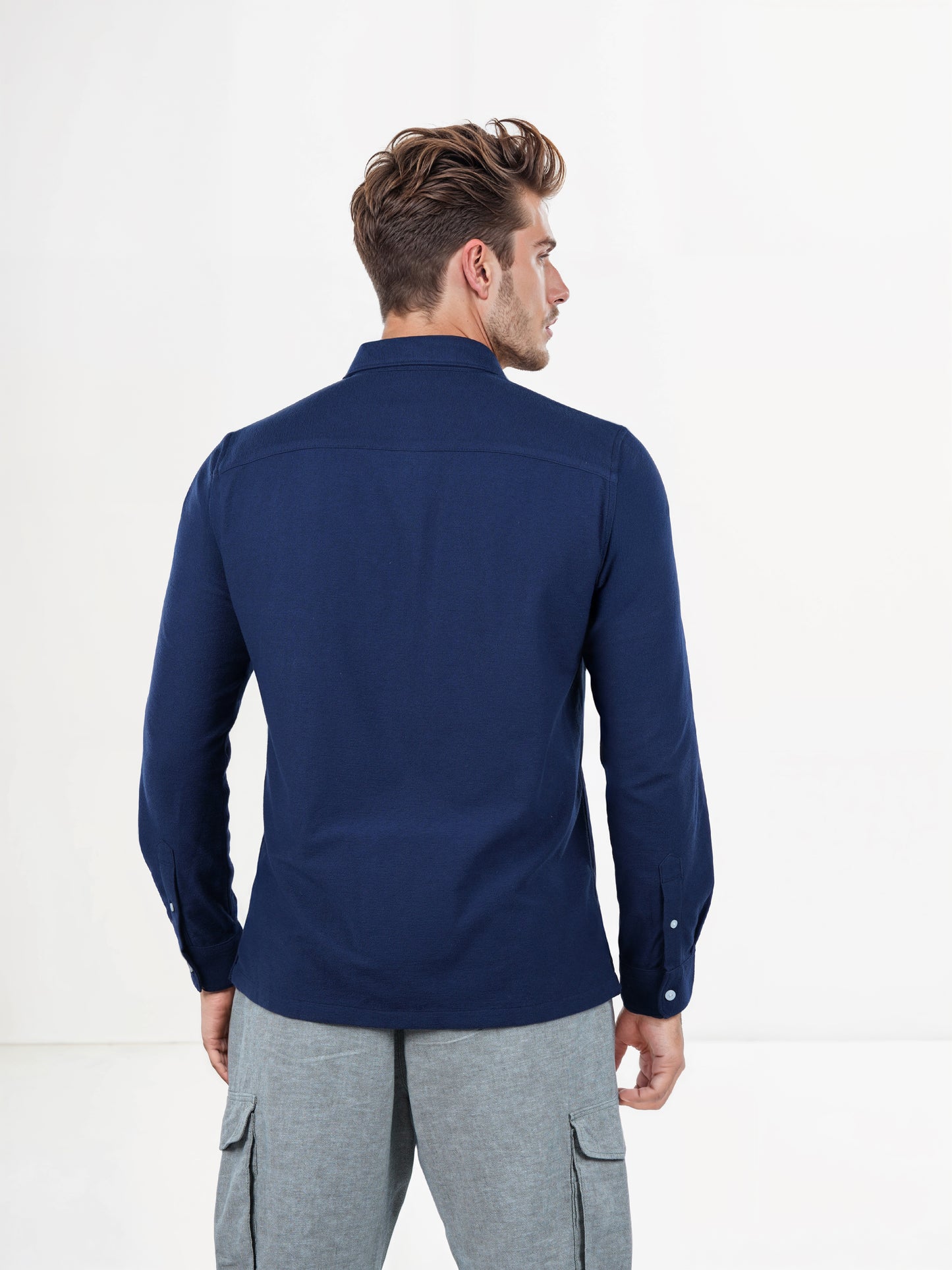 Stylish Navy Blue solid shirt by Celio for men, crafted from comfortable poly-cotton fabric. Perfect for casual occasions, featuring long sleeves and a regular fit. Disclaimer: All other items in the image are only for display purposes and will not be a part of the delivery content. Product colour may slightly vary due to photographic lighting sources. Country of Origin - India.