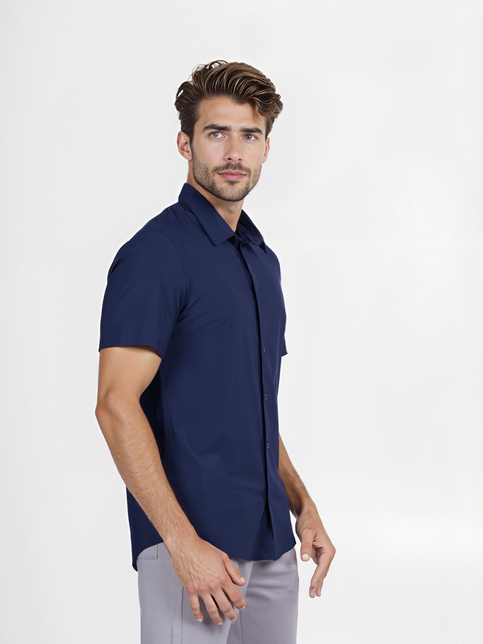 Elevate your casual wardrobe with the Celio Men Navy Blue Slim Fit Knit Shirt. Made from poly-cotton, it offers comfort and style with short sleeves for a relaxed look. Disclaimer: All other items in the image are only for display purposes and will not be a part of the delivery content. Product colour may slightly vary due to photographic lighting sources. Country of Origin - India.