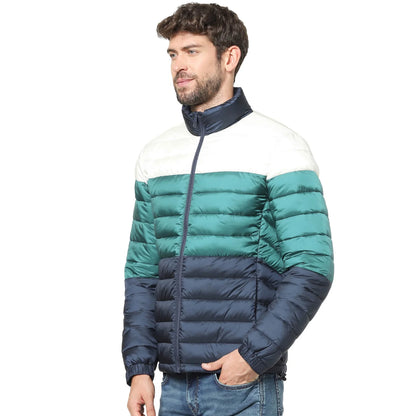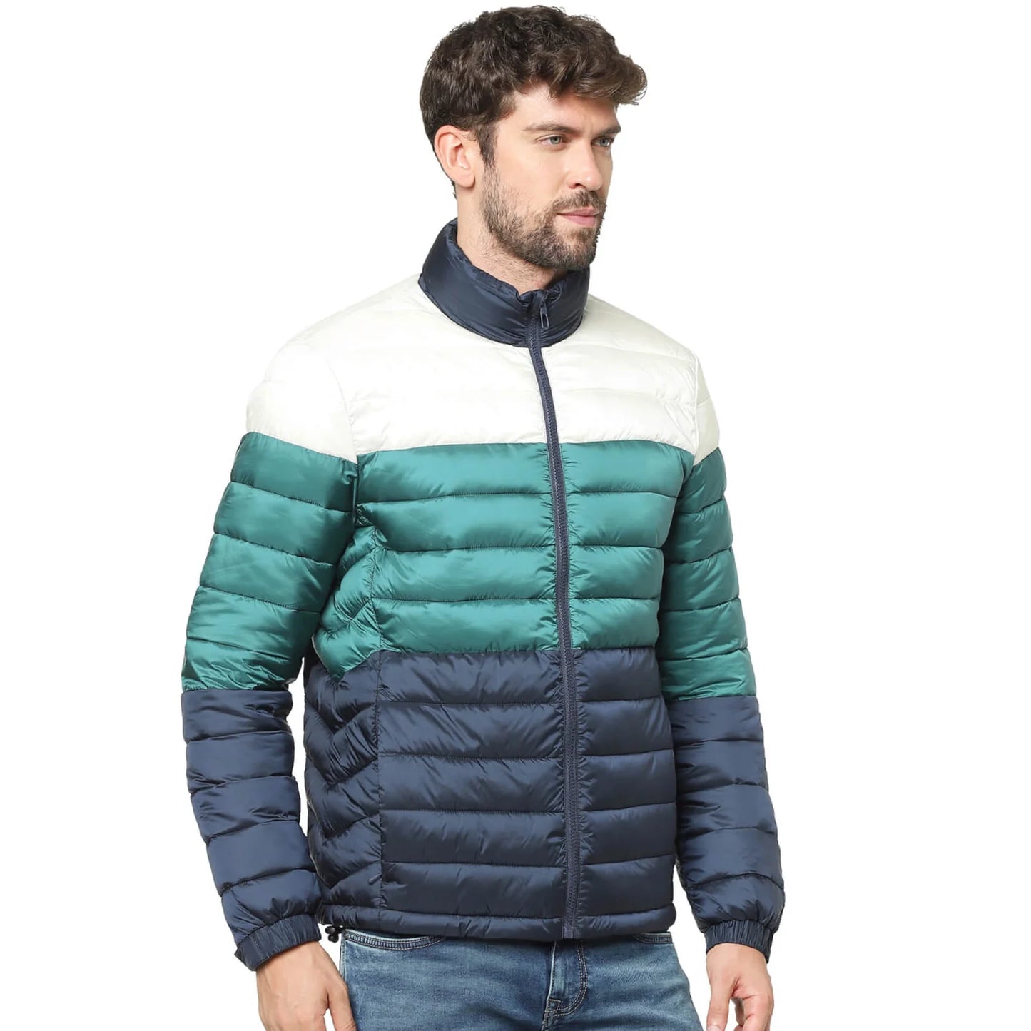 Elevate your casual look with the Celio Men's Multicolour Colourblock Bomber Jacket. Crafted from polyester, this navy blue jacket features long sleeves for a trendy style. Disclaimer: All other items in the image are only for display purposes and will not be a part of the delivery content. Product colour may slightly vary due to photographic lighting sources. Country of Origin - India. VUMOONBLOC