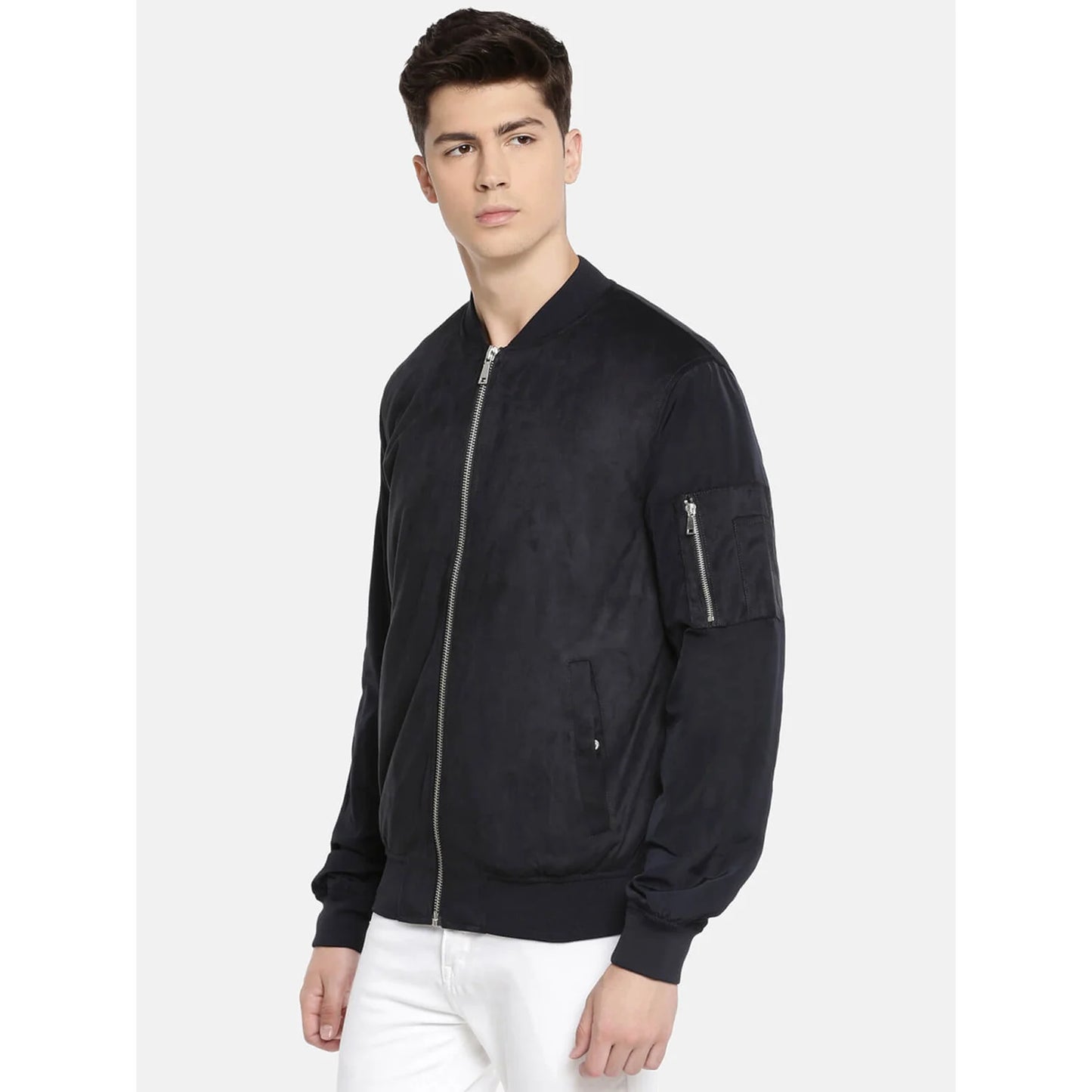 Shop the Celio Men's Navy Blue Solid Bomber Jacket, crafted from durable polyester for casual occasions. This stylish jacket features long sleeves, perfect for a trendy look. Disclaimer: All other items in the image are only for display purposes and will not be a part of the delivery content. Product colour may slightly vary due to photographic lighting sources. Country of Origin - India.