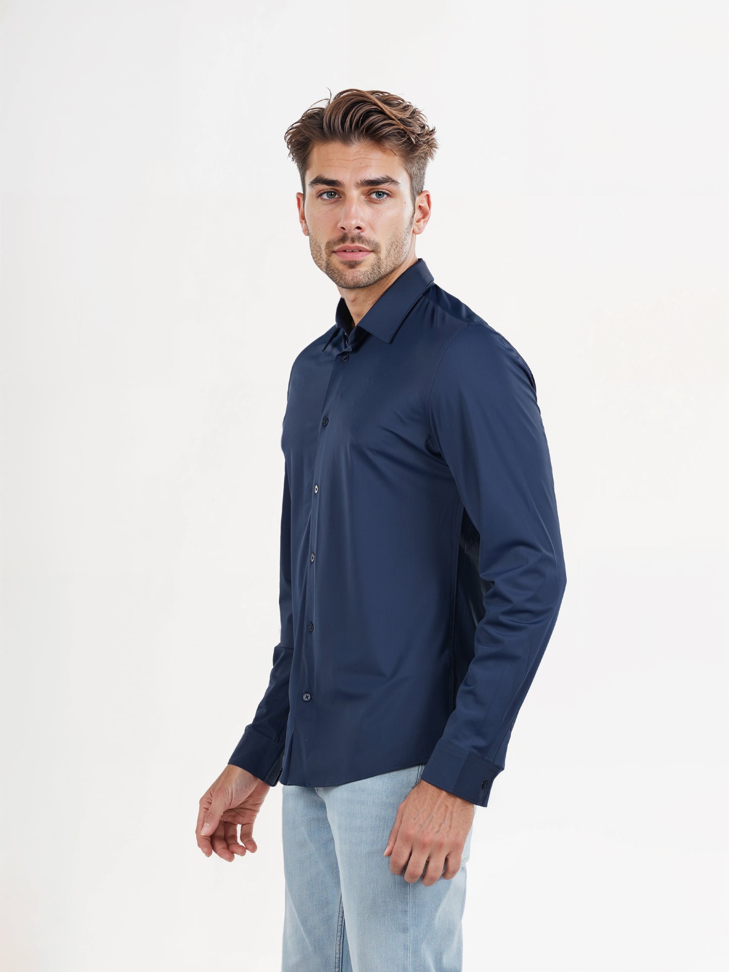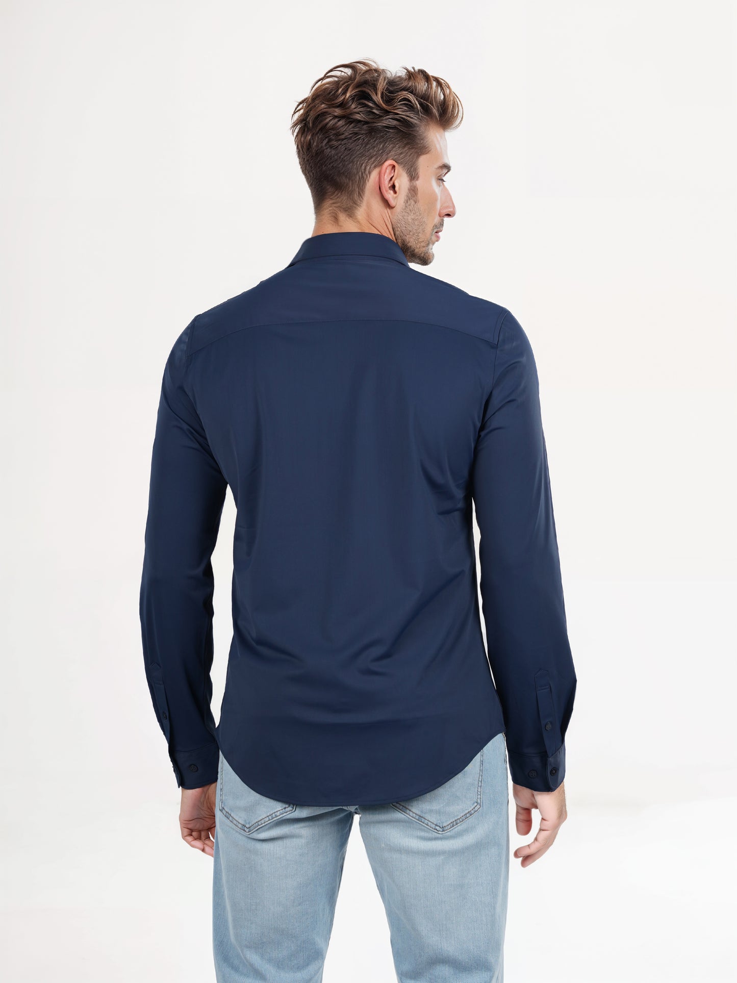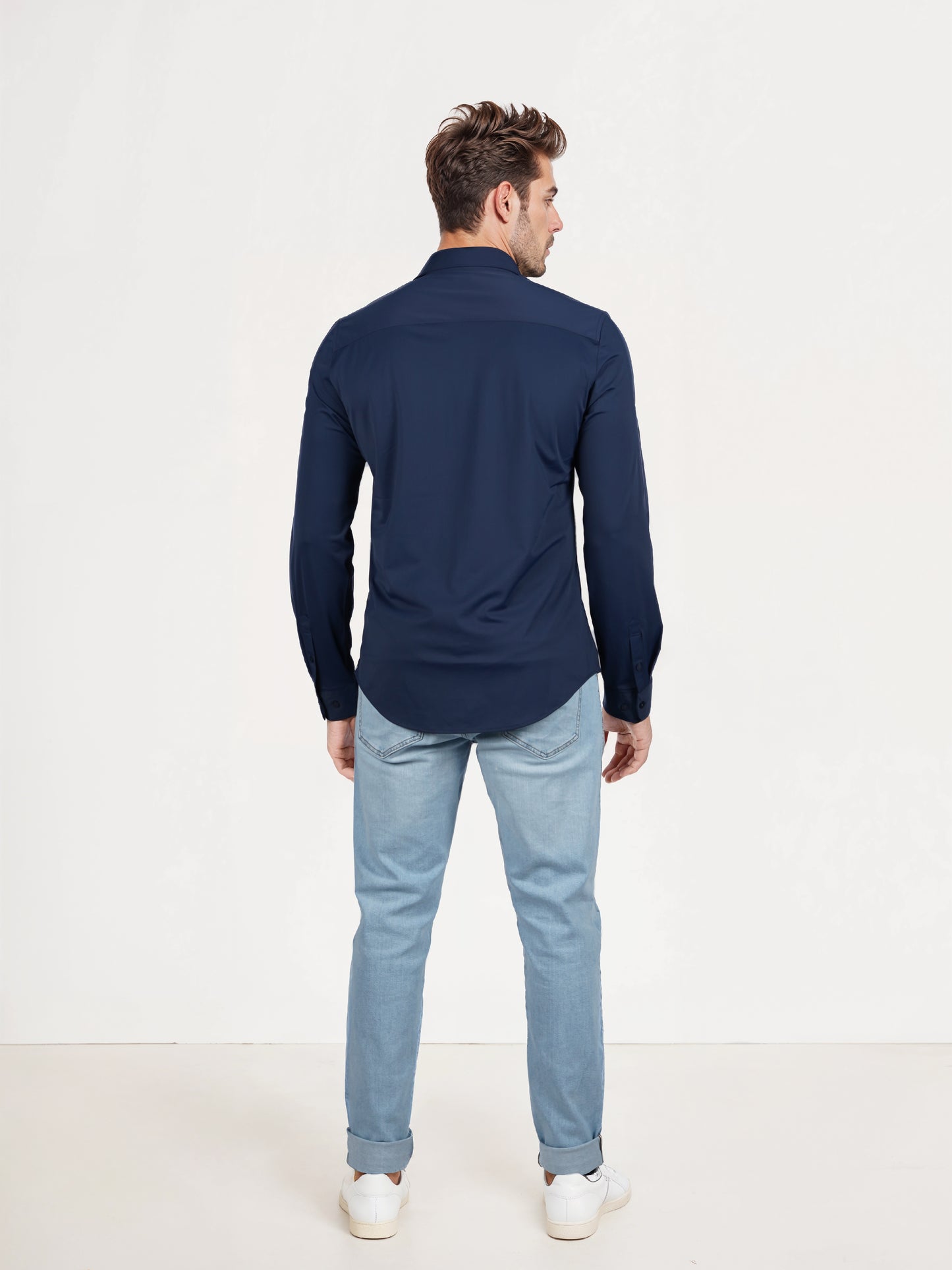 Stylish Celio men's navy blue solid slim shirt made from a comfortable polyester-blend fabric. Perfect for casual occasions with long sleeves for a polished look. Disclaimer: All other items in the image are only for display purposes and will not be a part of the delivery content. Product colour may slightly vary due to photographic lighting sources. Country of Origin - India.