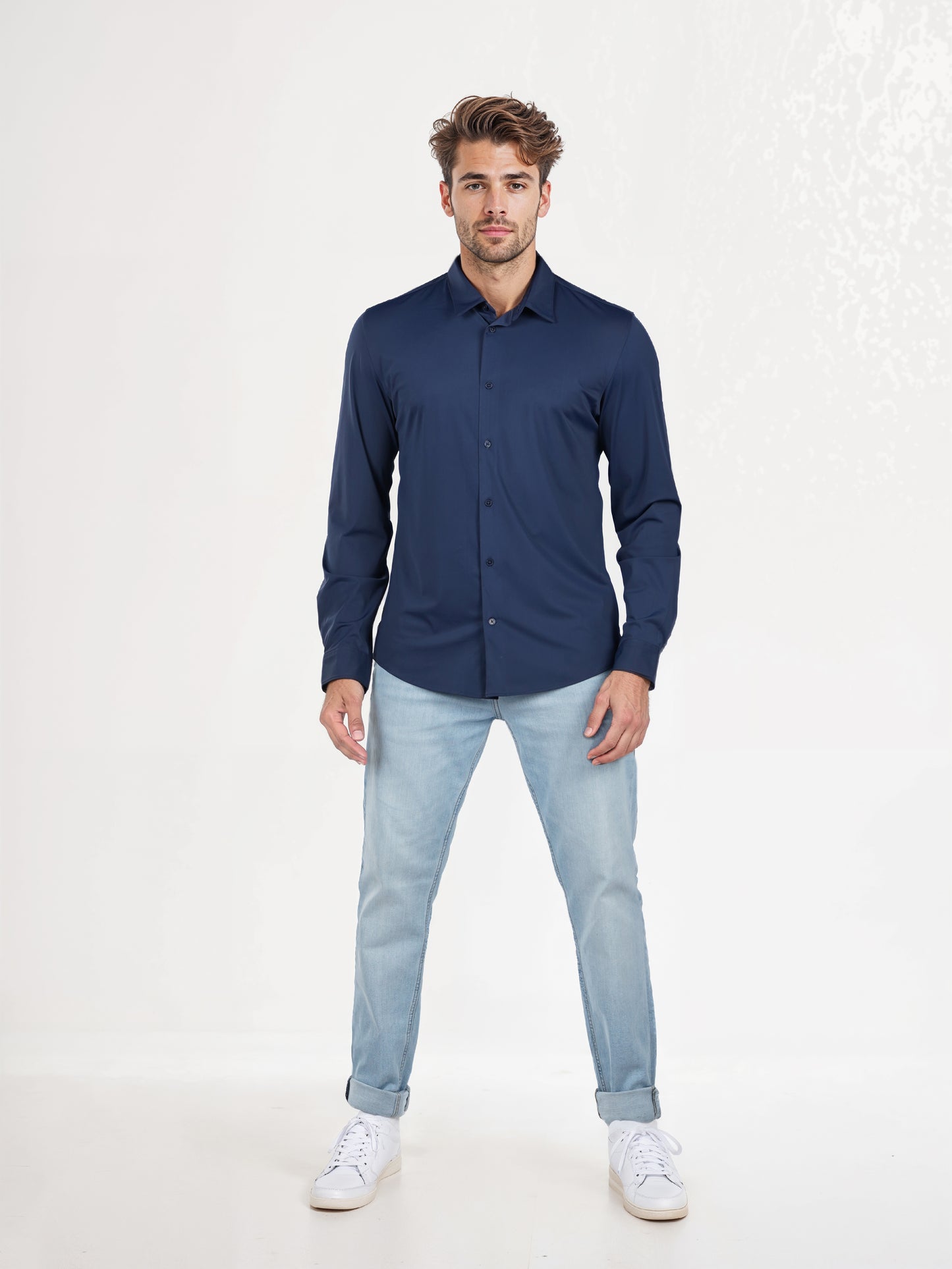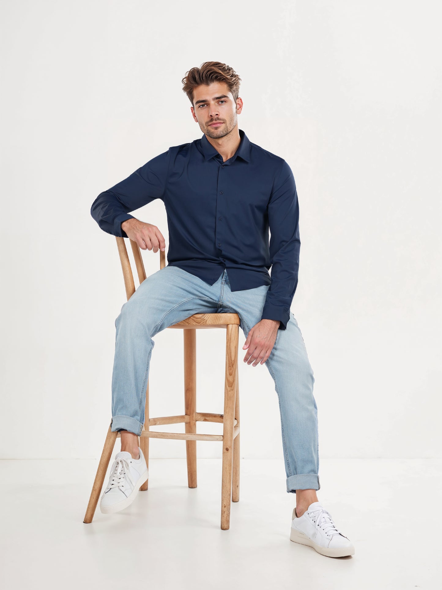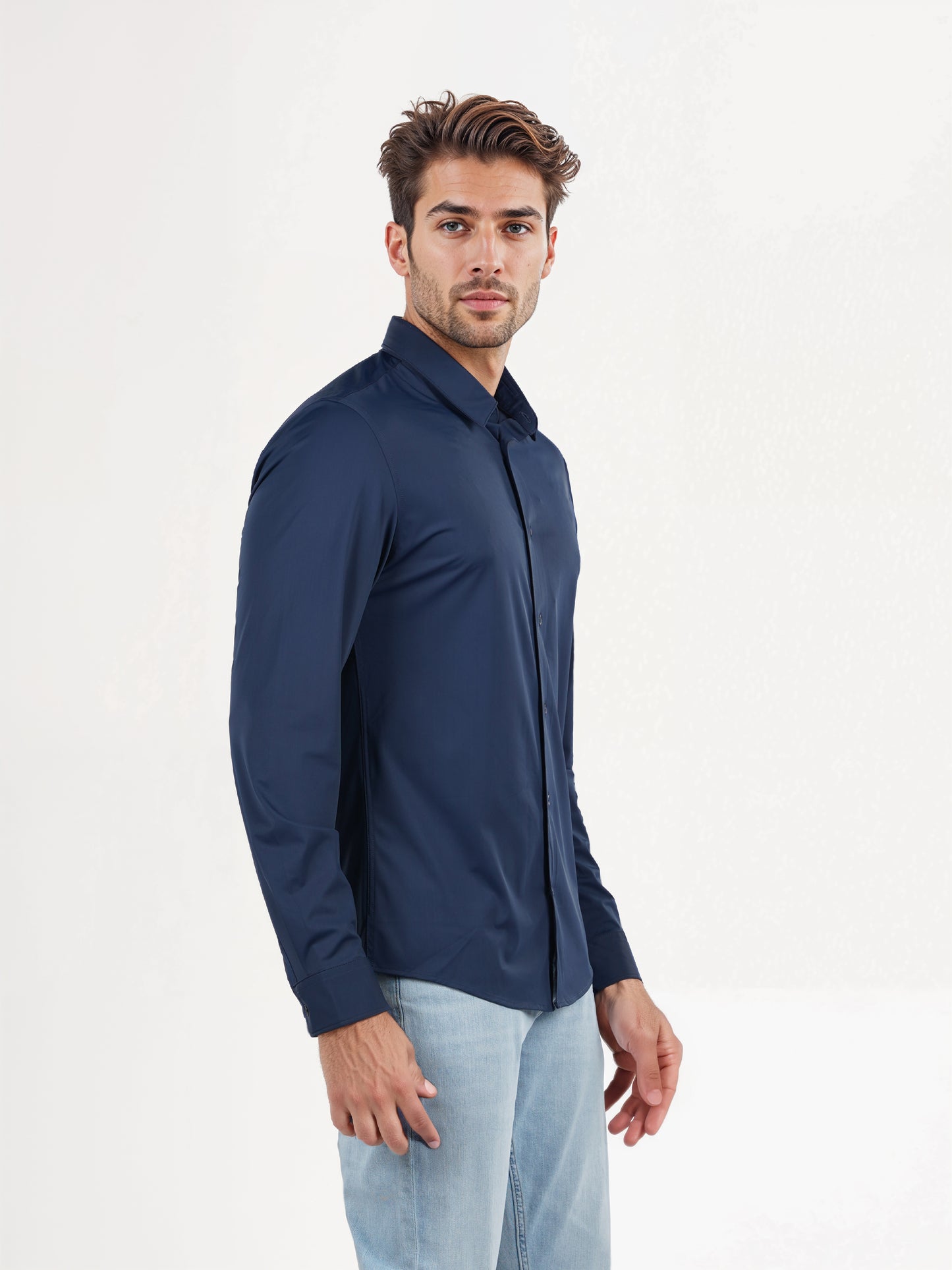 Stylish Celio men's navy blue solid slim shirt made from a comfortable polyester-blend fabric. Perfect for casual occasions with long sleeves for a polished look. Disclaimer: All other items in the image are only for display purposes and will not be a part of the delivery content. Product colour may slightly vary due to photographic lighting sources. Country of Origin - India.