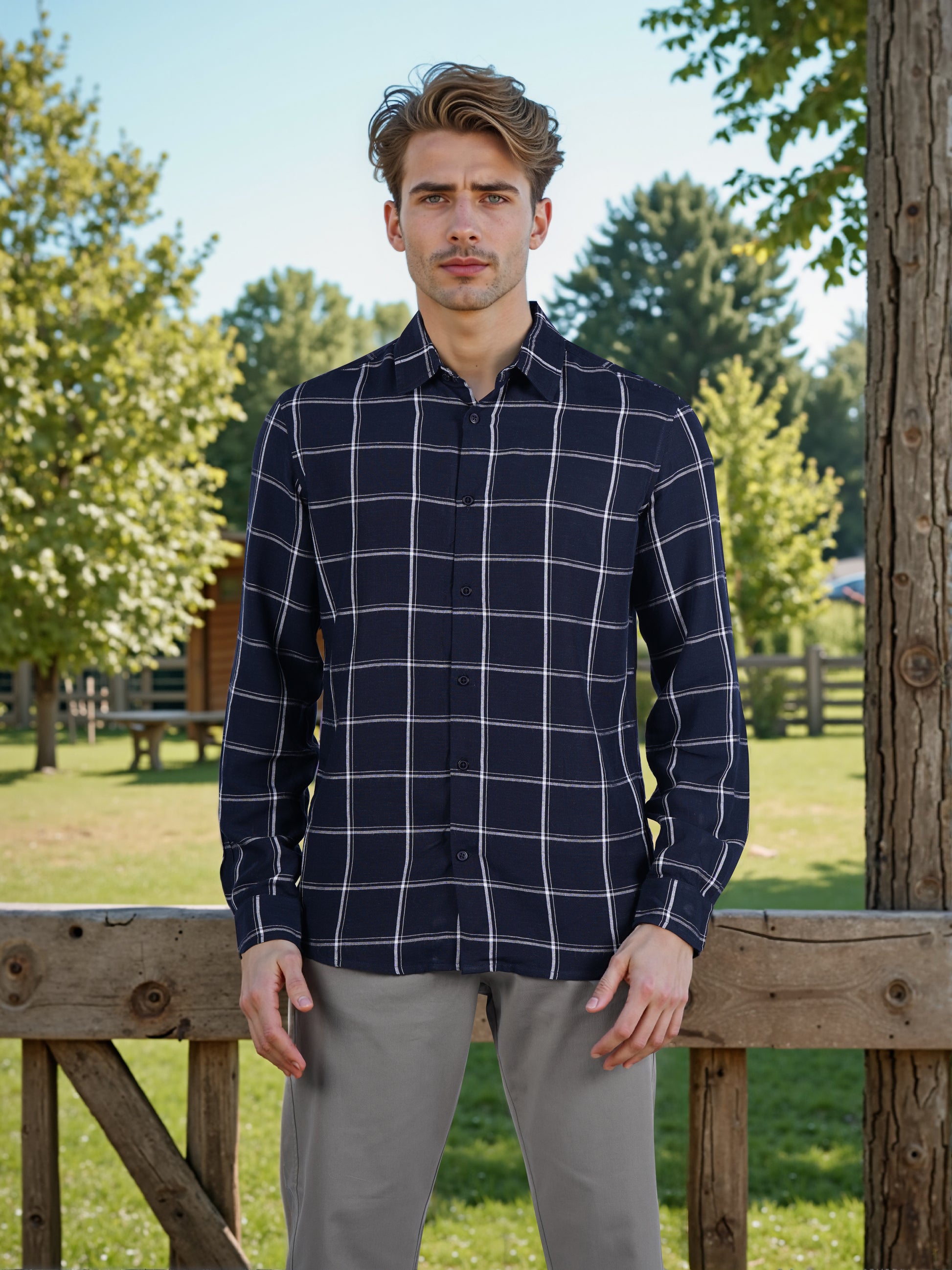 Elevate your casual wardrobe with this Celio men's navy blue shirt. Crafted from viscose linen, it features a stylish checked pattern and long sleeves for a relaxed fit. Disclaimer: All other items in the image are only for display purposes and will not be a part of the delivery content. Product colour may slightly vary due to photographic lighting sources. Country of Origin - India.