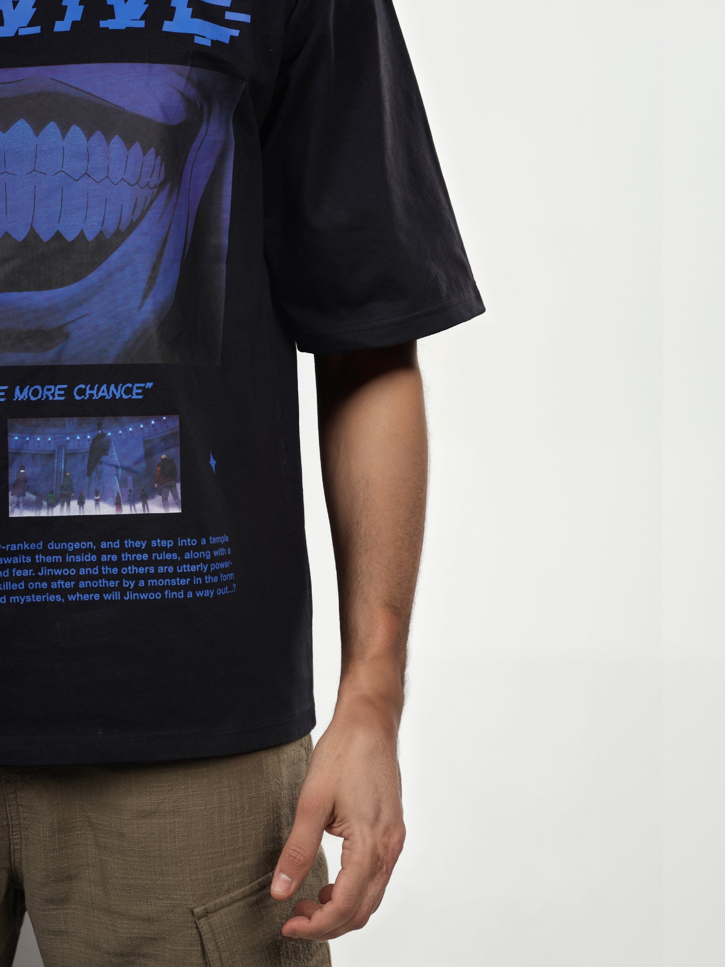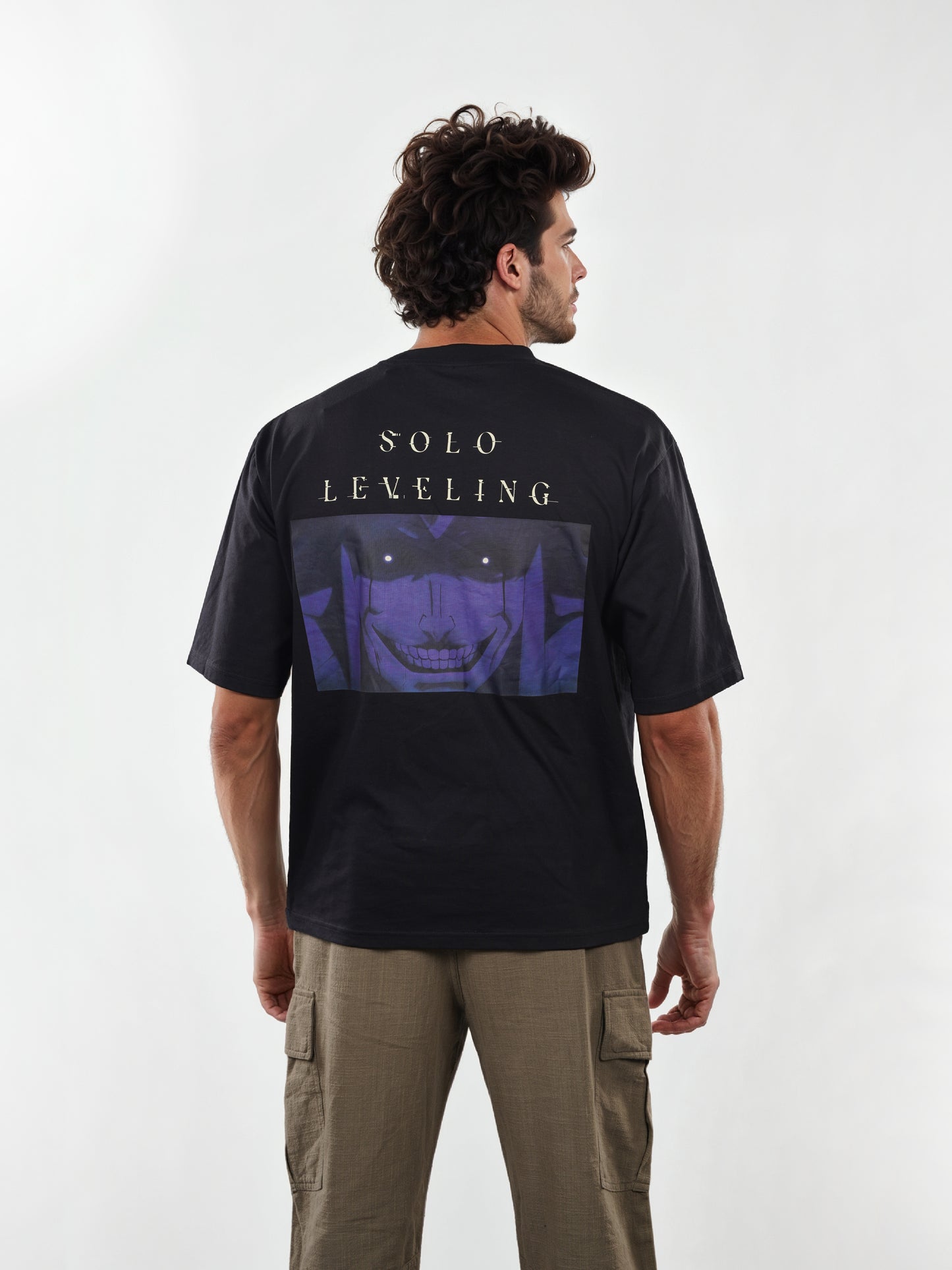 Noir Half Sleeve T shirt featuring the Statue of God from the anime Solo Leveling. The front print depicts the events occurring during Jinwoo’s first encounter with the Statue of God at the Temple. The back we see the the print of the Statue of God and his distinct smile. Its most defining trait is its glowing red eyes that emits laser, extremely creepy and sadistic smile, a characteristic that it shared with its creator. LFESOLO3