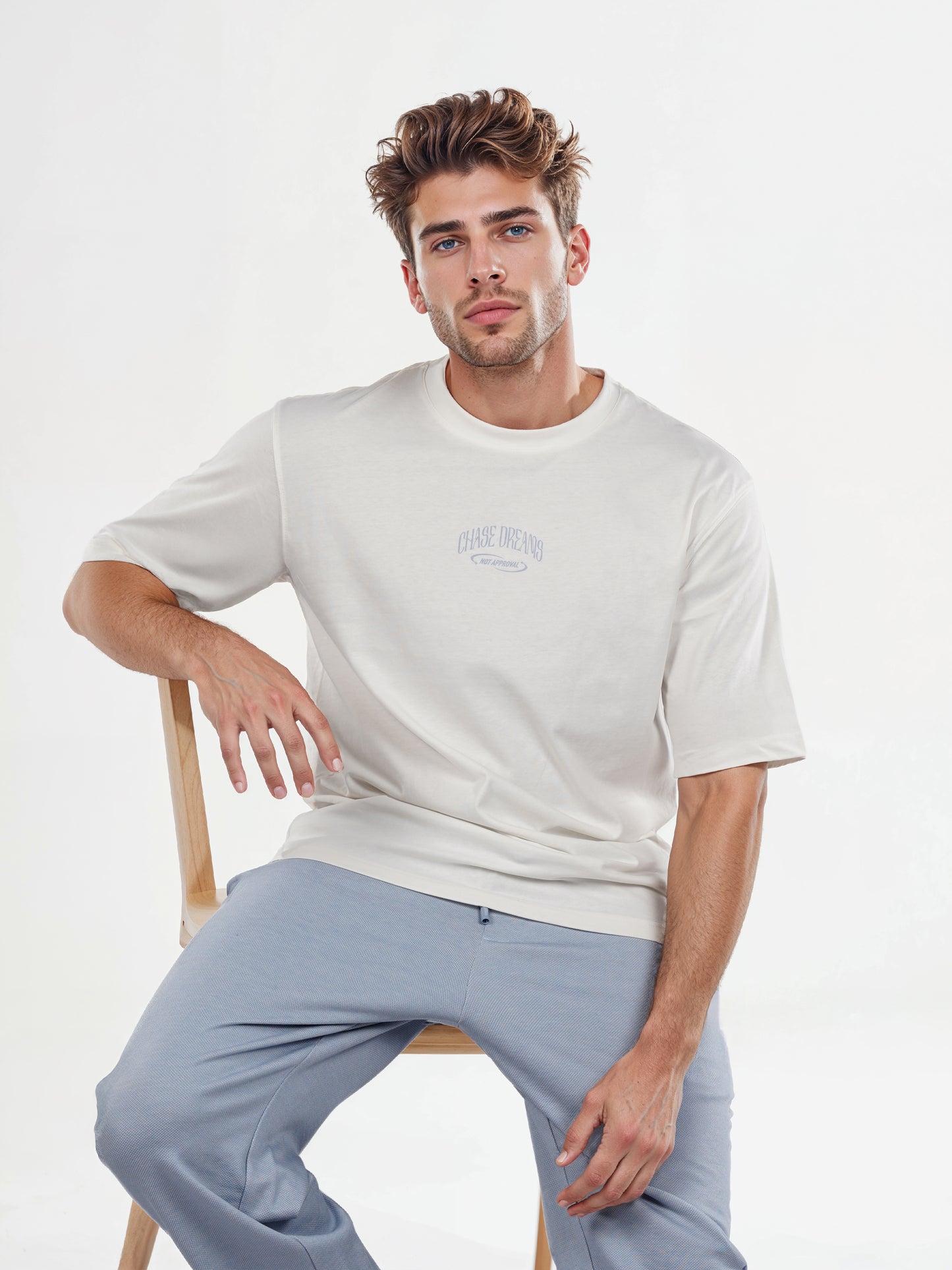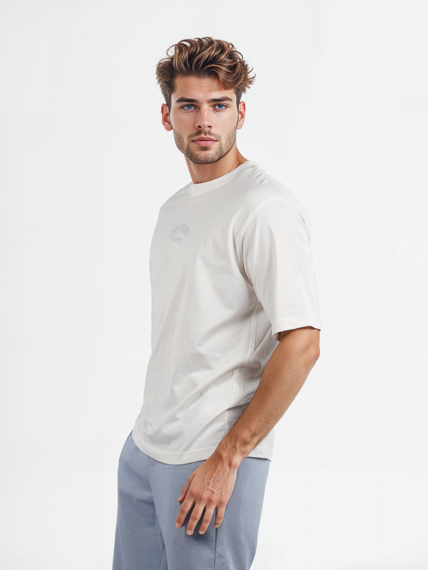 Stay stylish in this off white oversized t-shirt from Celio, designed for men. Made from breathable cotton, it's perfect for casual outings. Disclaimer: All other items in the image are only for display purposes and will not be a part of the delivery content. Product colour may slightly vary due to photographic lighting sources. Country of Origin - India.
