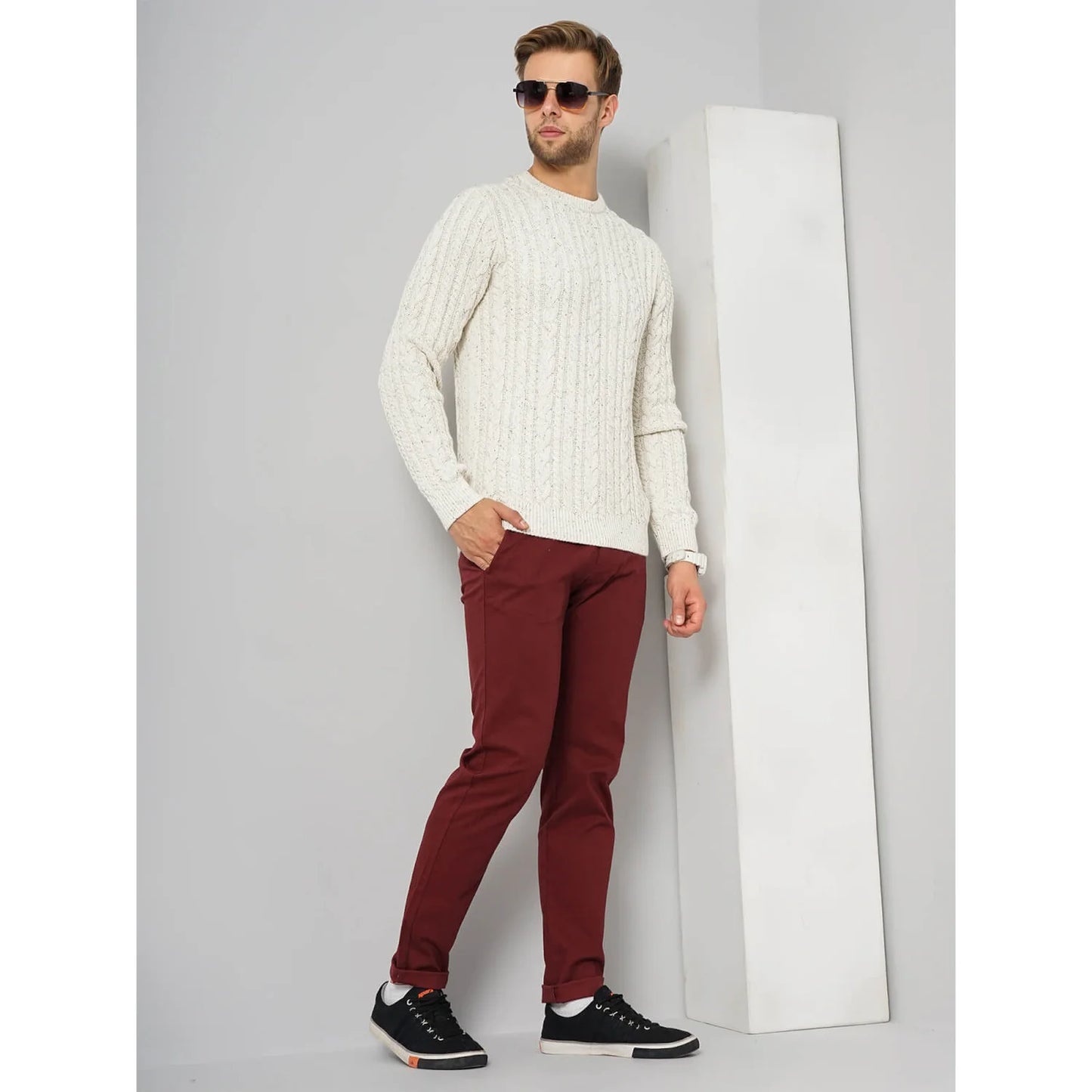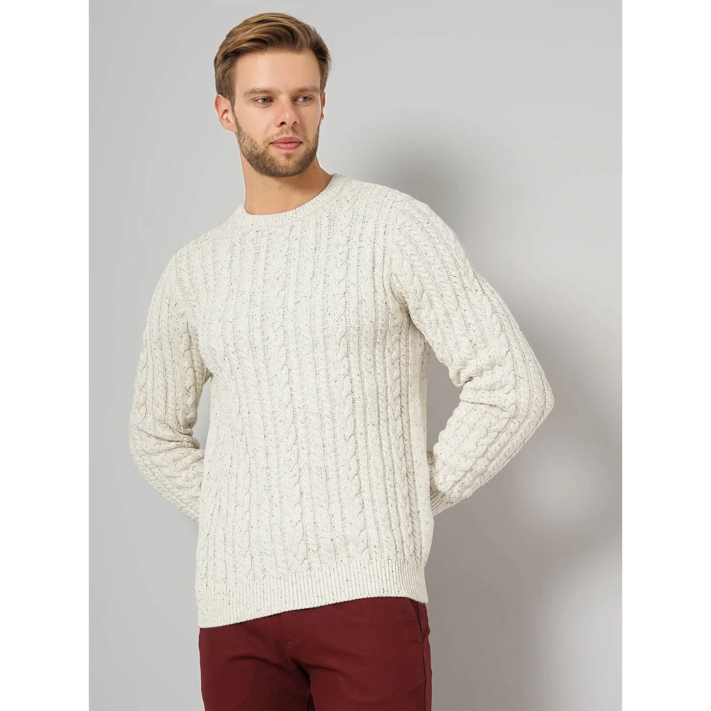 Elevate your casual style with the Celio Off White Solid Cotton Blend Sweater in Fesnow Ecru Mel. Designed for men, it features long sleeves and a comfortable cotton blend fabric. Disclaimer: All other items in the image are only for display purposes and will not be a part of the delivery content. Product colour may slightly vary due to photographic lighting sources. Country of Origin - India.