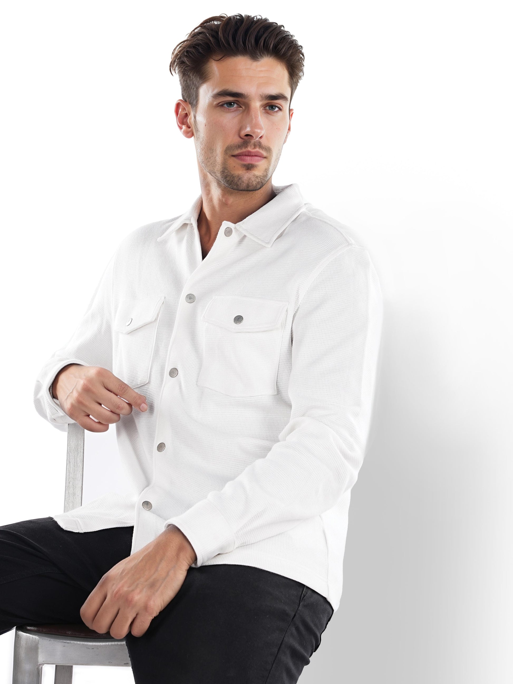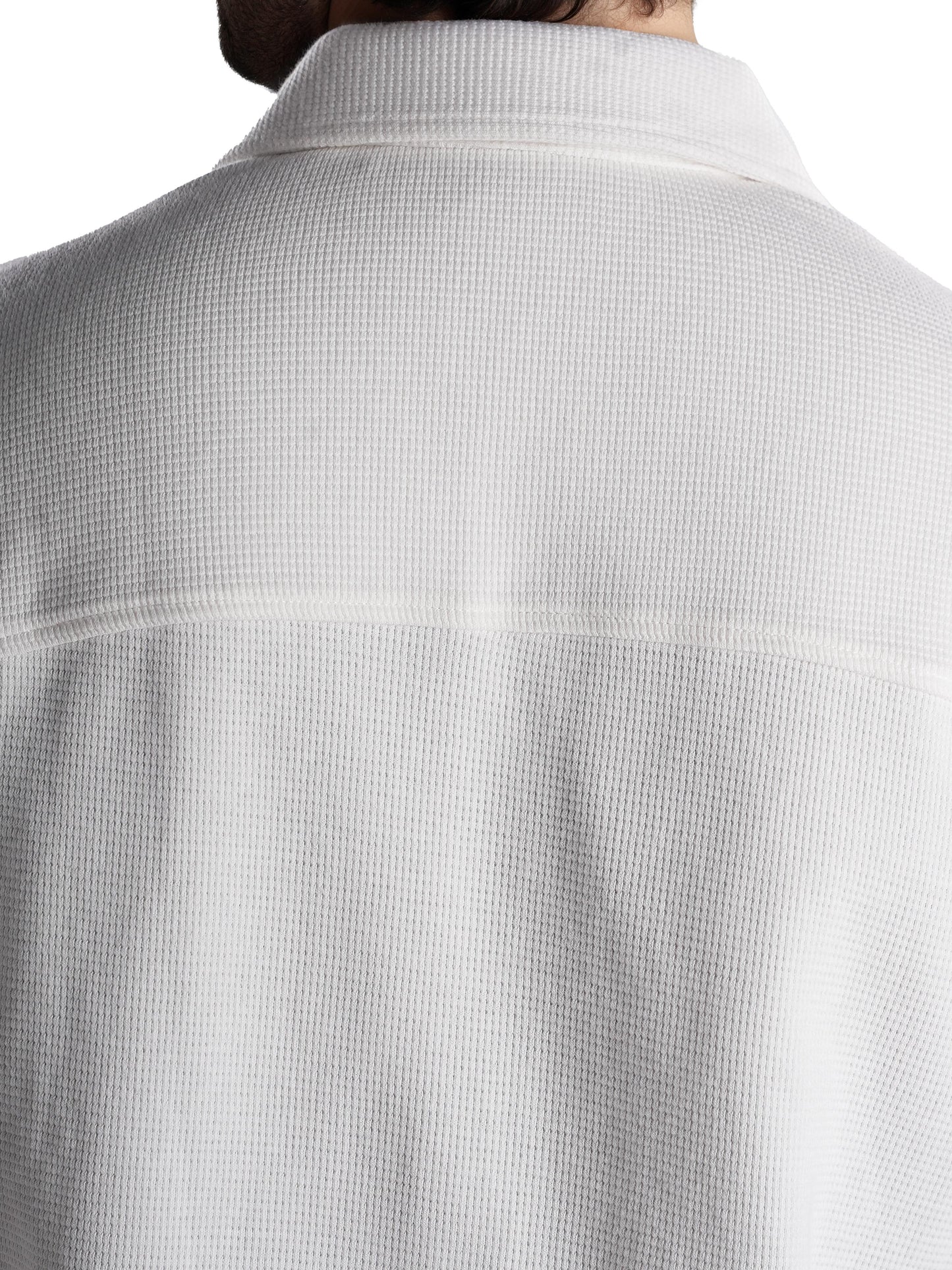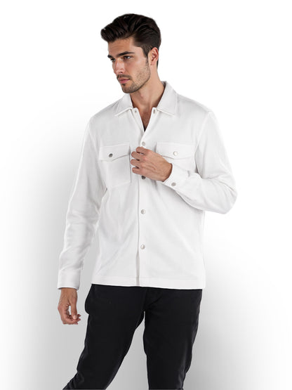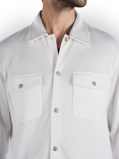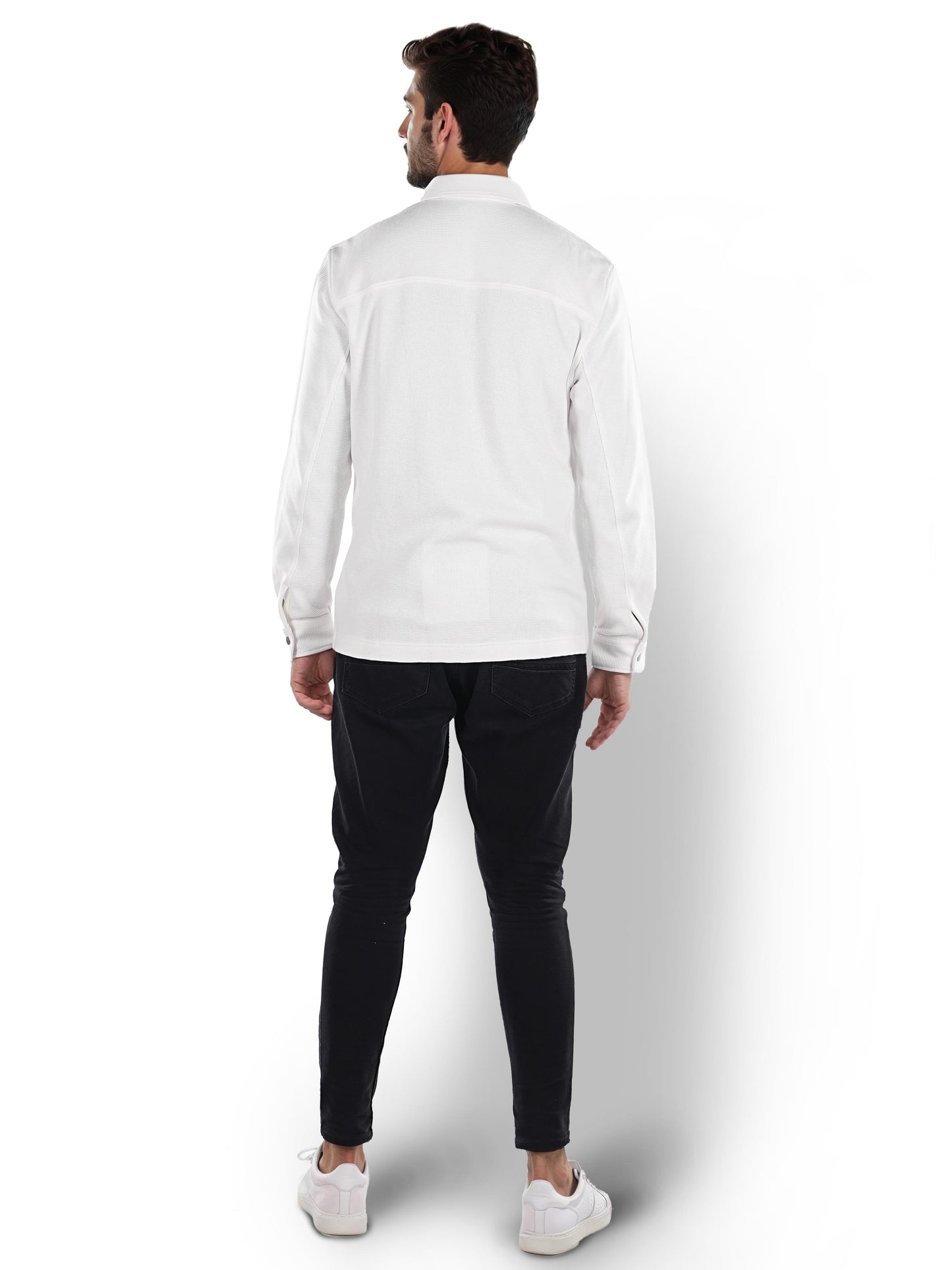 Men's off white oversized cotton shirt by Celio features long sleeves, perfect for casual occasions. Stylish and comfortable, ideal for effortless everyday wear. Disclaimer: All other items in the image are only for display purposes and will not be a part of the delivery content. Product colour may slightly vary due to photographic lighting sources. Country of Origin - India.