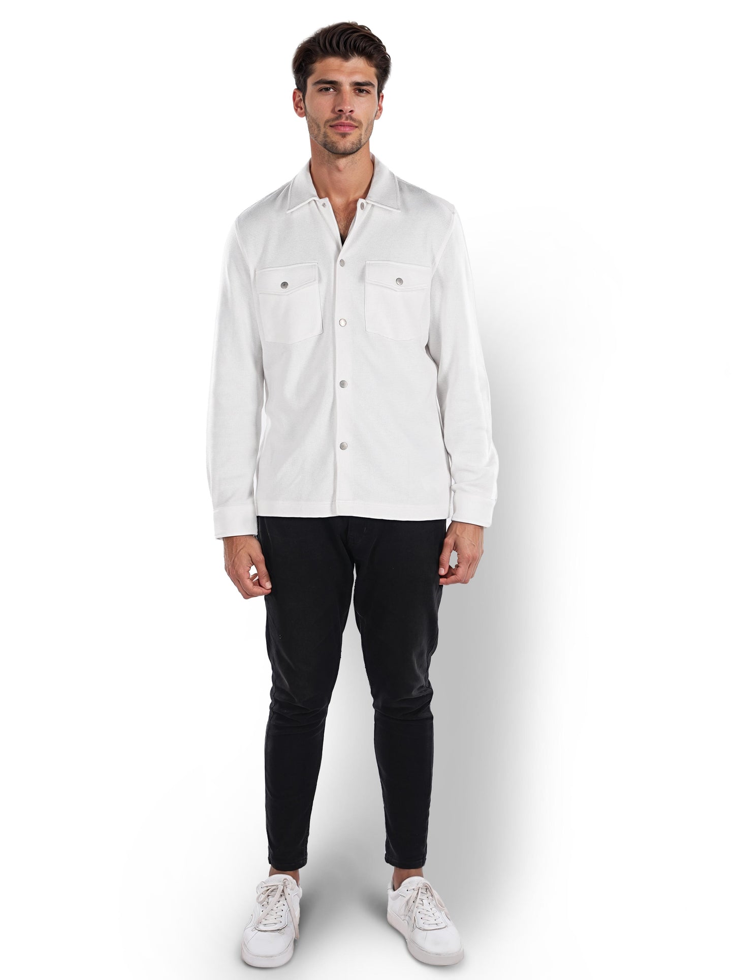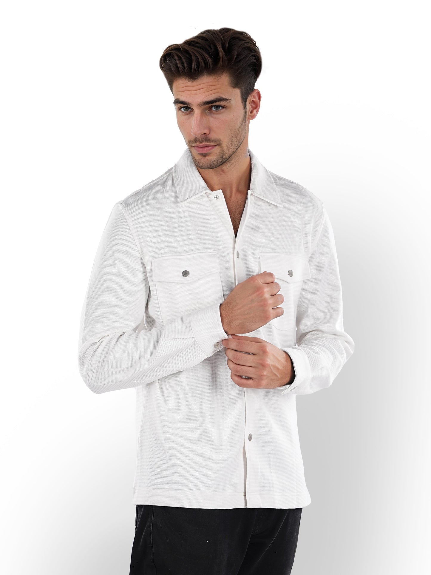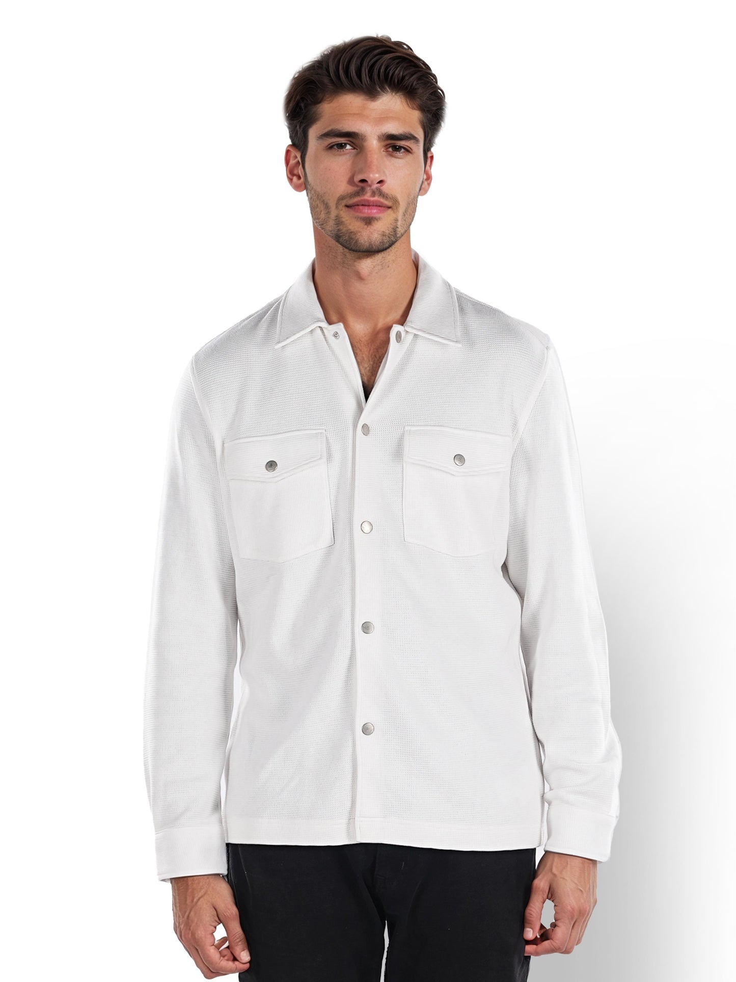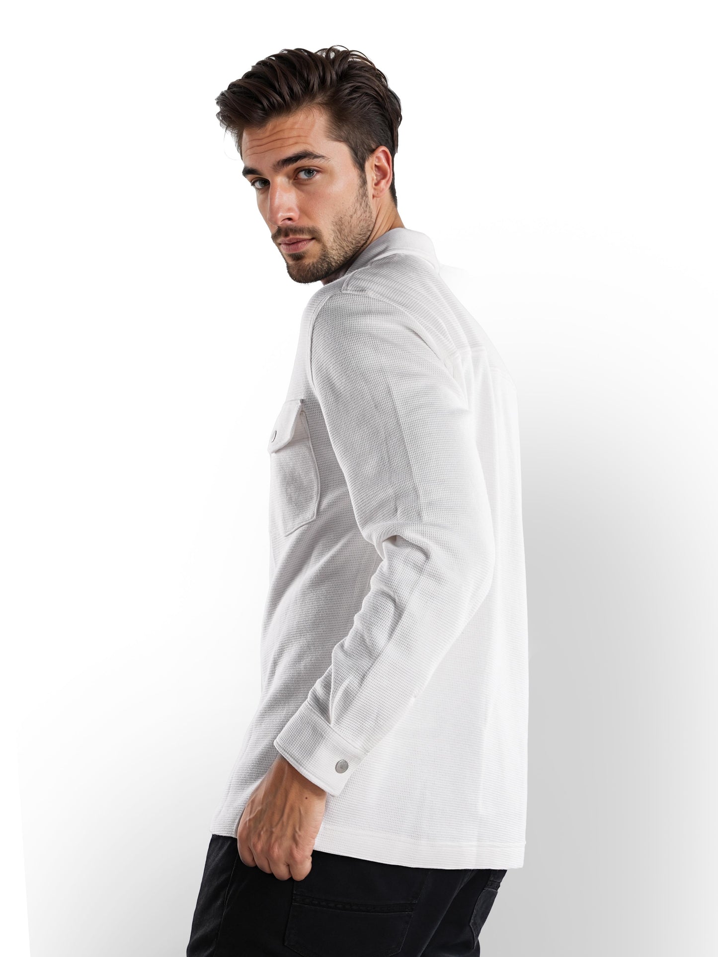 Men's off white oversized cotton shirt by Celio features long sleeves, perfect for casual occasions. Stylish and comfortable, ideal for effortless everyday wear. Disclaimer: All other items in the image are only for display purposes and will not be a part of the delivery content. Product colour may slightly vary due to photographic lighting sources. Country of Origin - India.
